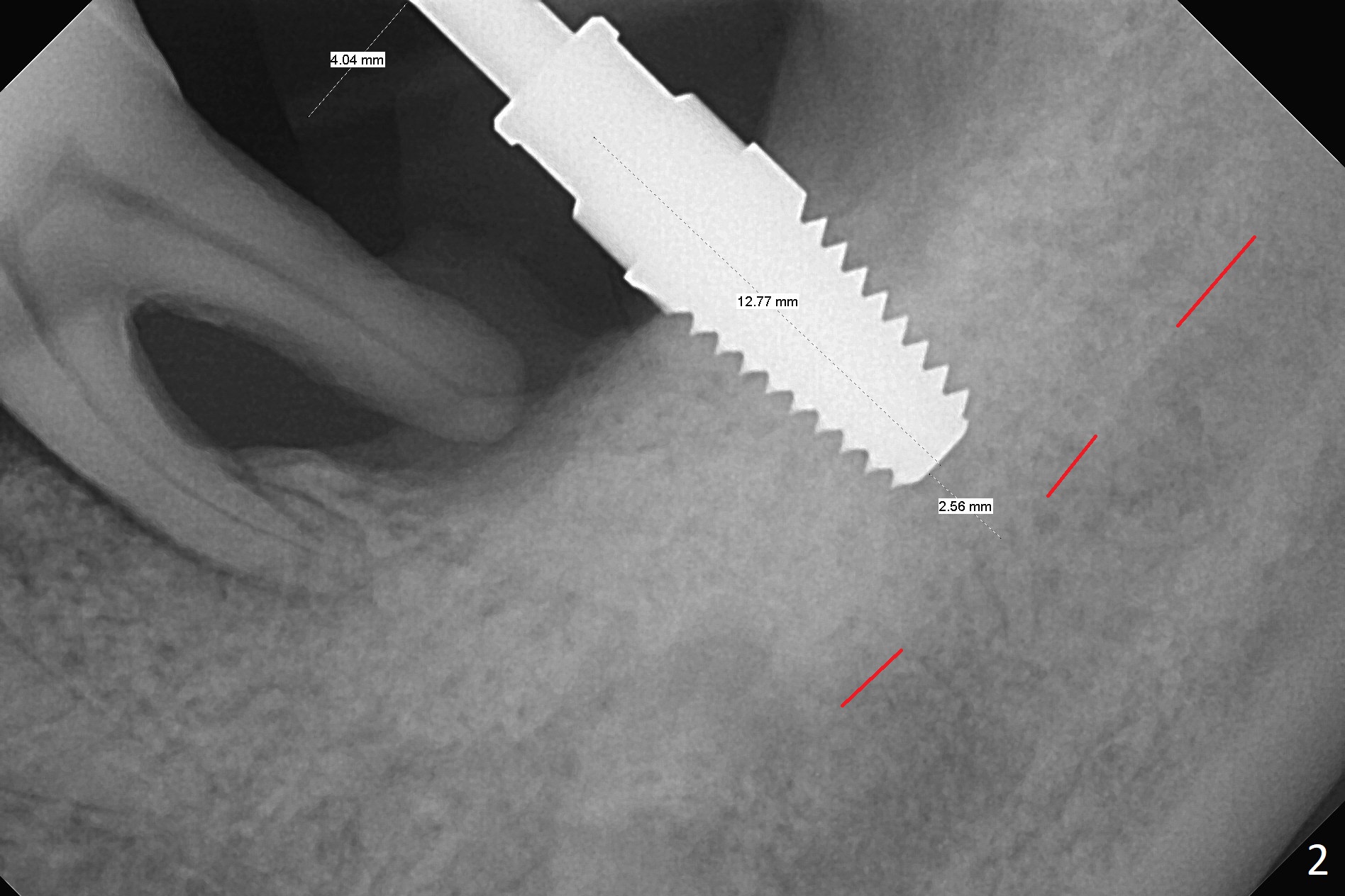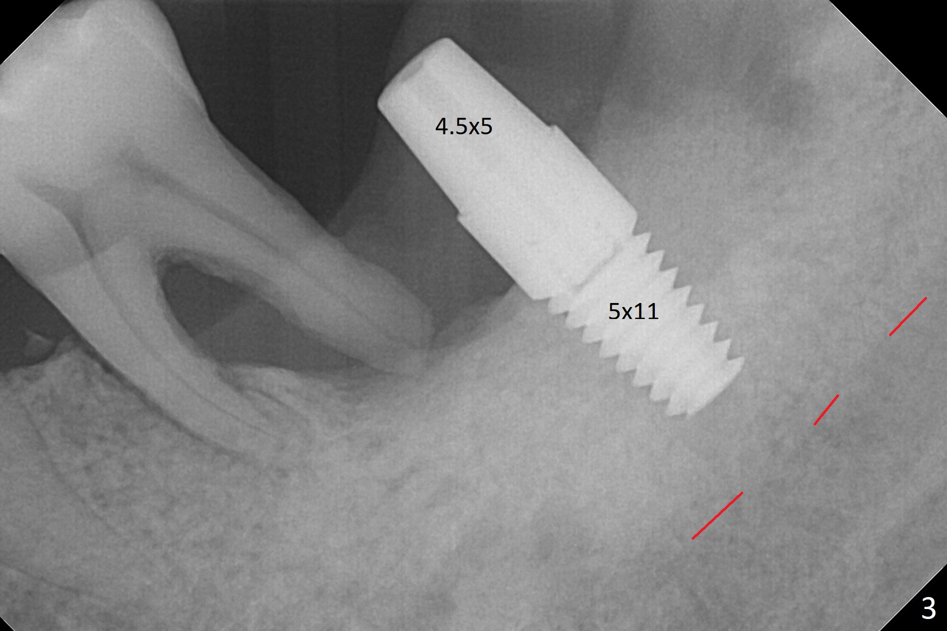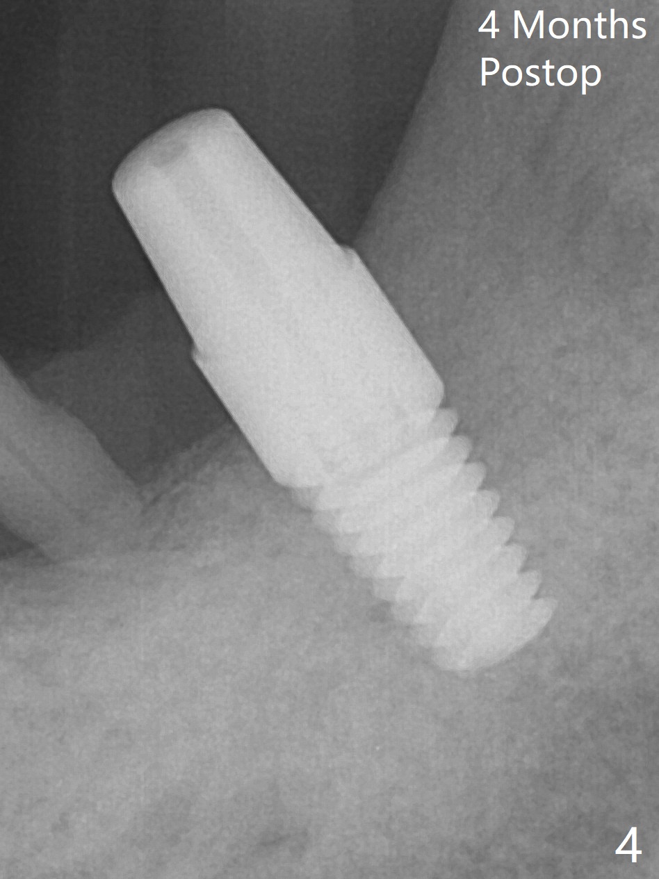 After extraction of the mesioangular tooth #17, initial osteotomy at #18 is 11 mm in depth with sudden empty feel (without pain with infiltration anesthesia); when a parallel pin is inserted, it goes down more than expected (Fig.1). Subsequent osteotomy is strictly controlled at the depth of 11 mm for 2.5 and 3.0 mm reamers. When 3.5 and 4.0 reamers are being used for ~ 9 mm, pain is confined to the coronal portion of the osteotomy, apparently associated with infection from the socket of #17 or from the distal apex of the tooth #19 (scaling & root planing done earlier). After addition of local anesthetic (infiltration), a 5x11 mm tap is inserted (Fig.2). With sufficient clearance from the Inferior Alveolar Canal (Fig.1-3 red dashed line), block anesthesia is administered. A 5x11 mm Tatum implant is placed with >50 Ncm (Fig.3). A 4.5x5 mm abutment is placed to increase retention of periodontal dressing. Impression is taken 4 months postop (Fig.4). The tooth #19 is symptomatic 7 months post #18 cementation.