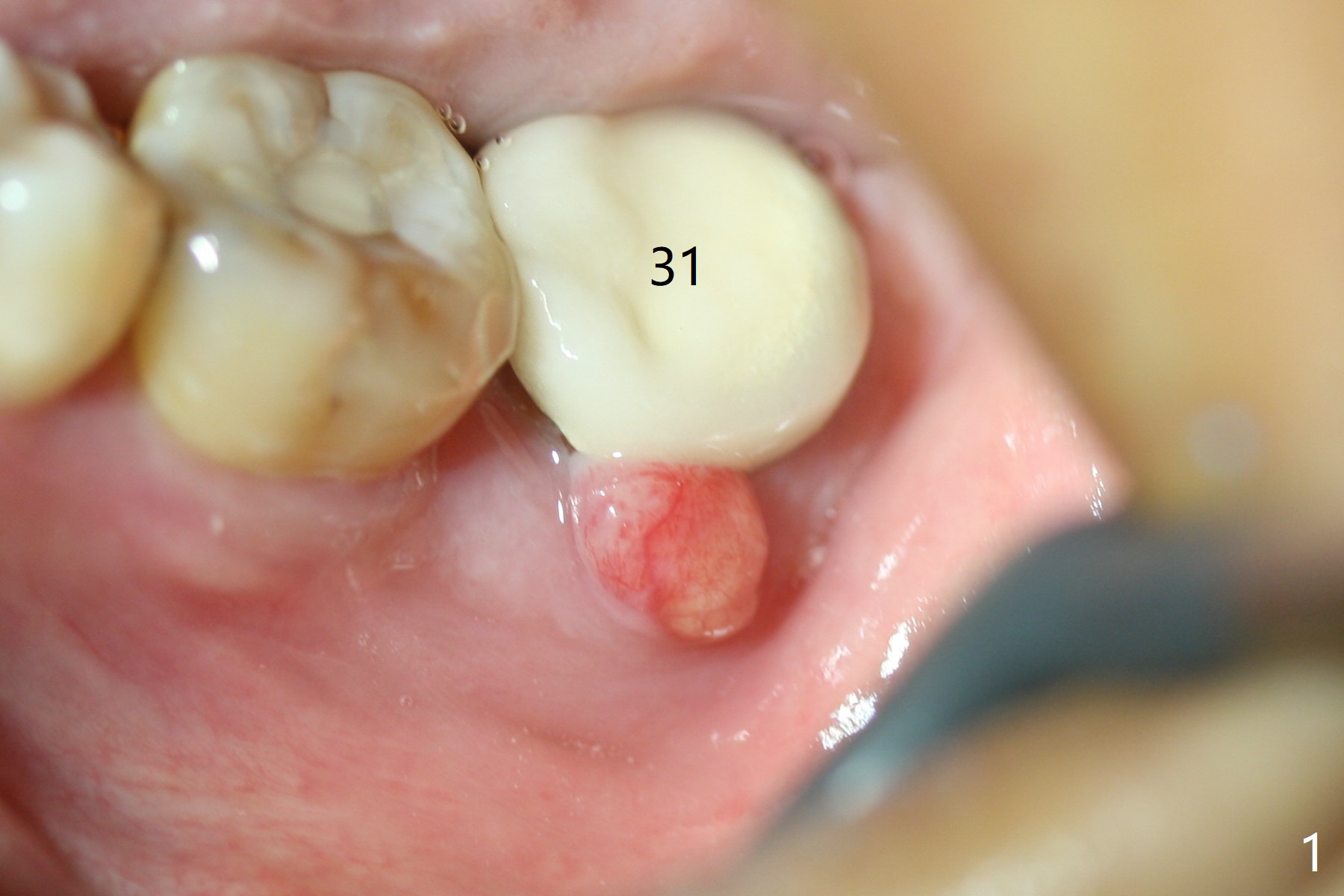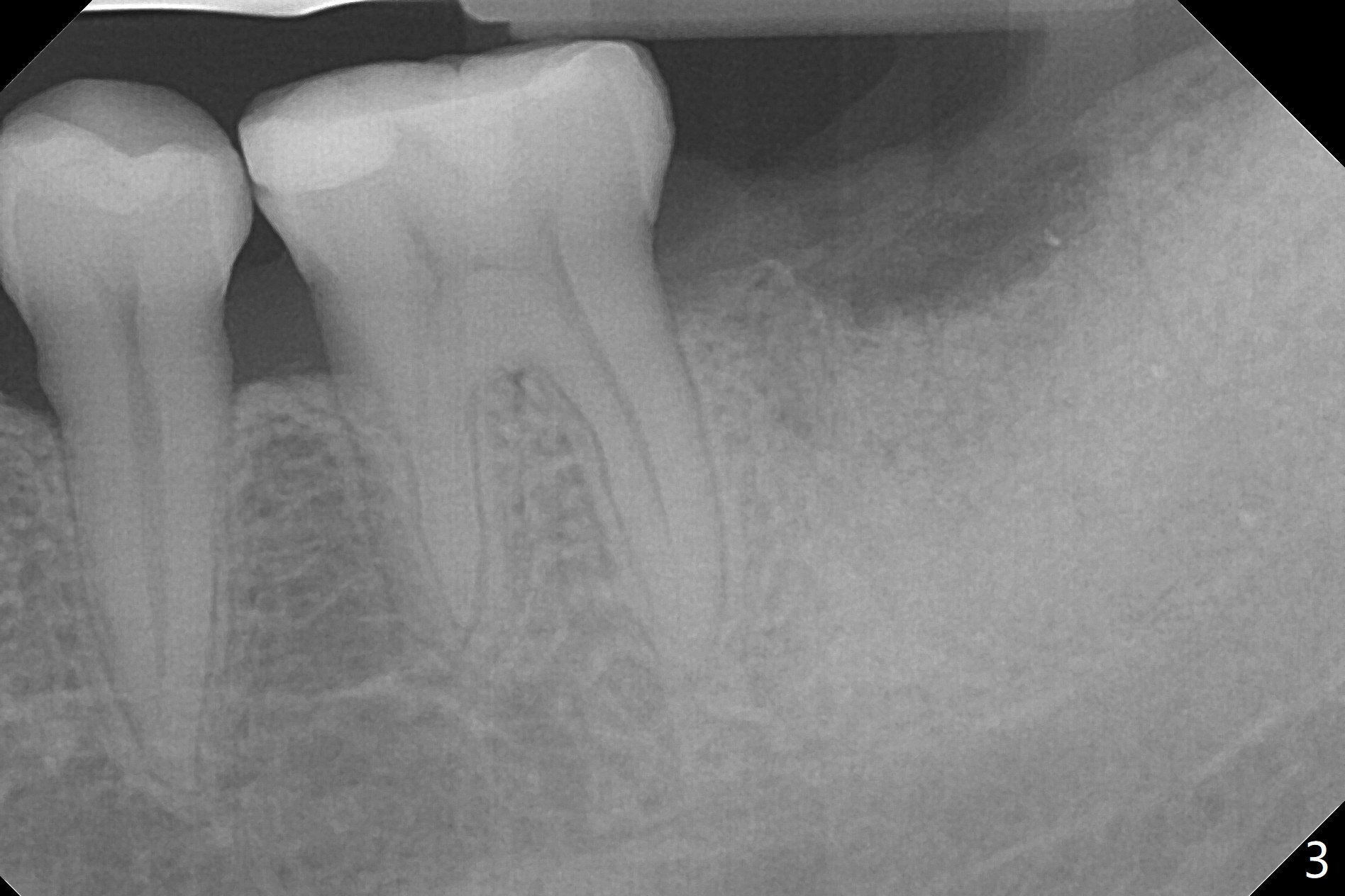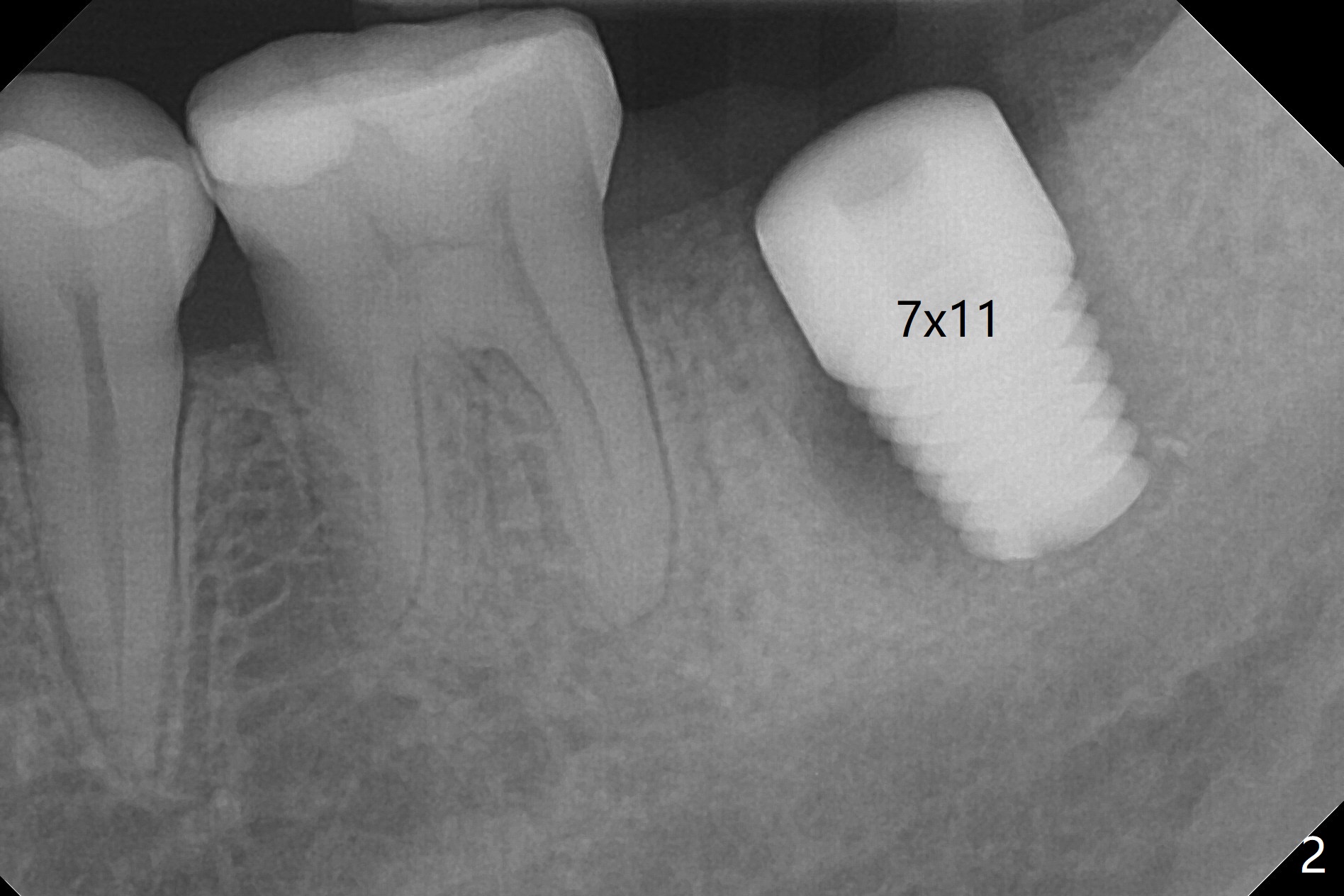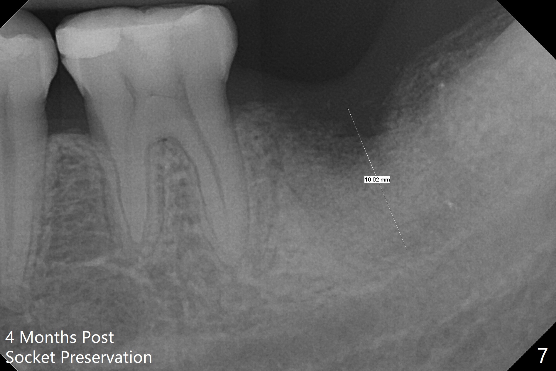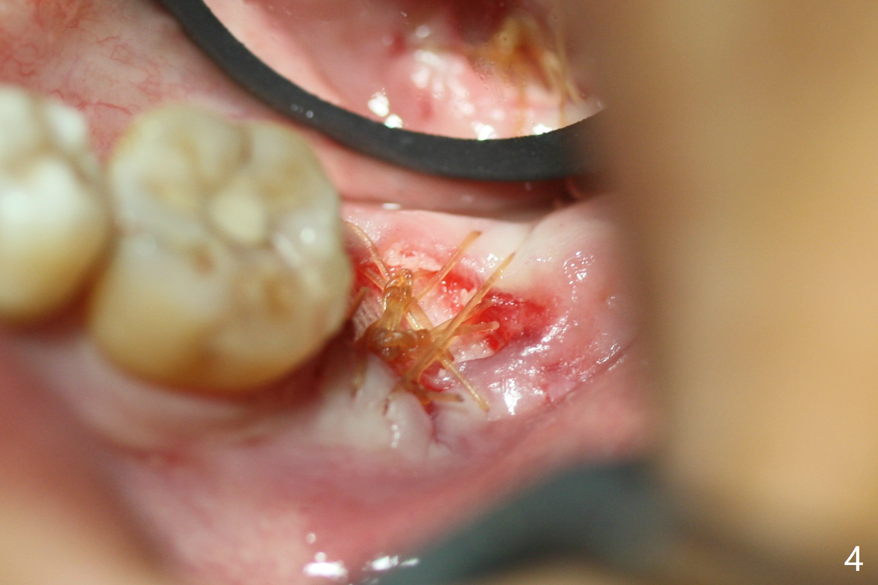 The patient with chronic buccal abscess at #31 is nervous. After extraction, a 7x11 mm tapered implant drops into the single socket, which is close to the Inferior Alveolar Canal (Fig.2). The bottom of the socket is sensitive to manipulation (explorer) after infiltration anesthesia. A 8x14 mm tapered tap is placed without binding, neither is a 8x14 mm cylindrical implant. The implant stability does not increase when Vera (.2-1.0 mm) or Vanilla (.5-1.0 mm) Graft is placed. Socket preservation is finished with Collagen plug and 6-month membrane (Fig.3,4).