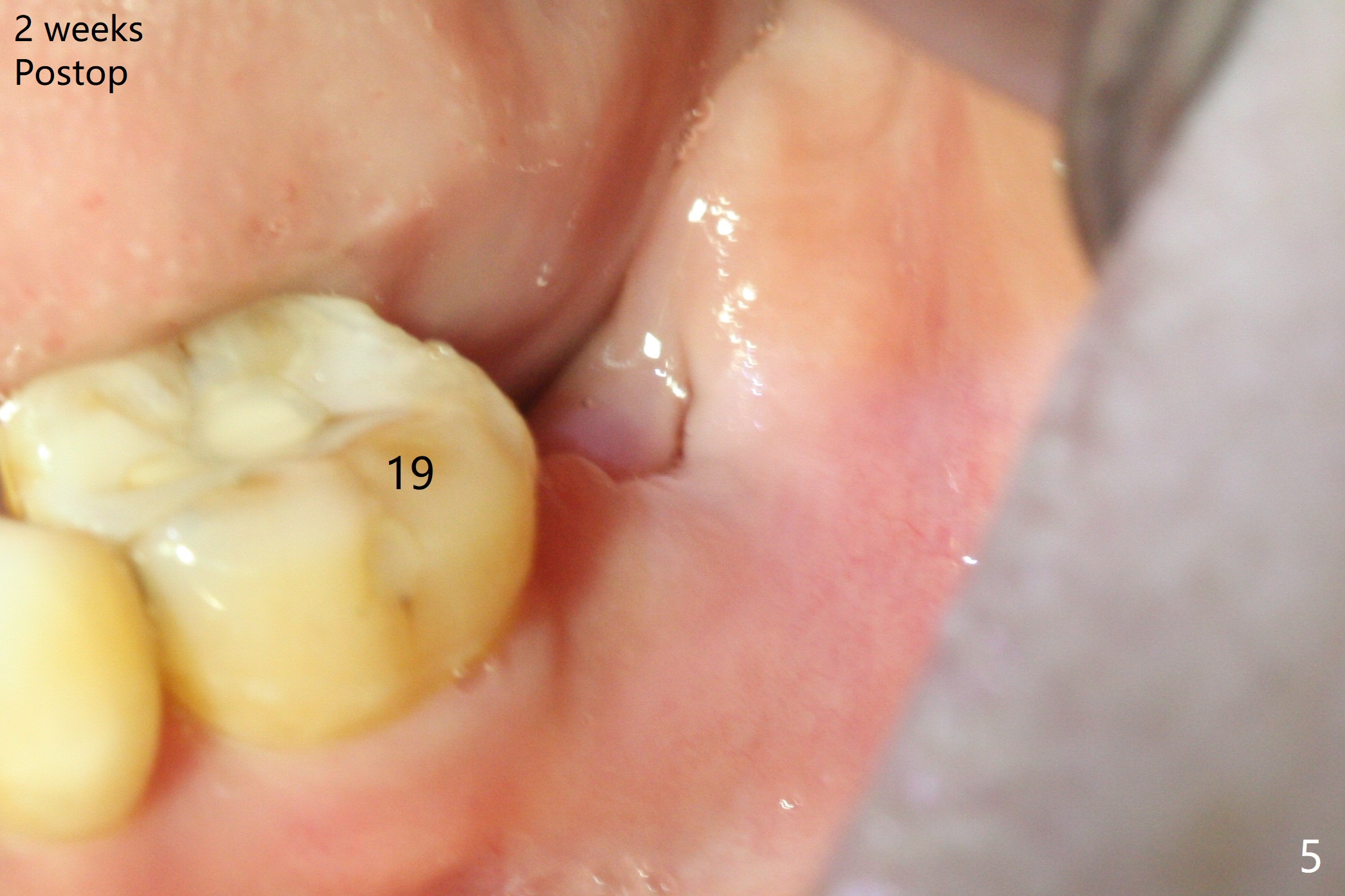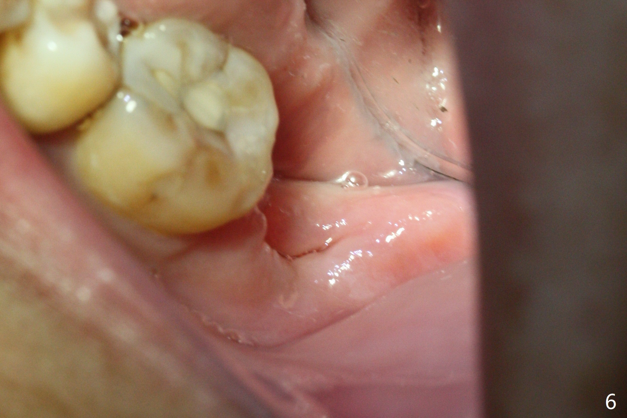 If the patient were not nervous and every step were followed by X-ray, light osteotomy in the bottom of the socket (flattening) may increase primary stability. A larger implant (9 or 10 mm) is a solution. The socket heals with disappearance of the fistula 2 weeks postop (Fig.5,6), but the ridge seems to have been reduced in width. The patient return for follow up 4 months postop; bone graft appears to remain in the socket (Fig.7). The ridge is apparently reduced further (data not shown). The patient prefers to have implant placement 1 month later. Take photos of the ridge buccally when the patient returns. In fact the patient agrees to have guided surgery. She postpones the surgery due to sickness for one more month. Implant placement will occur 6 months post extraction. The bone density should be higher than earlier.