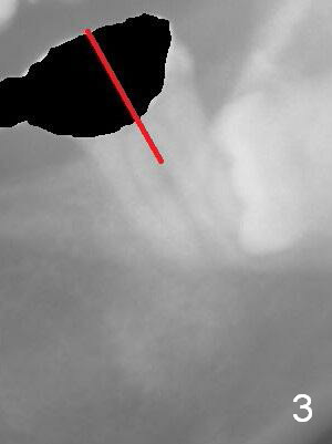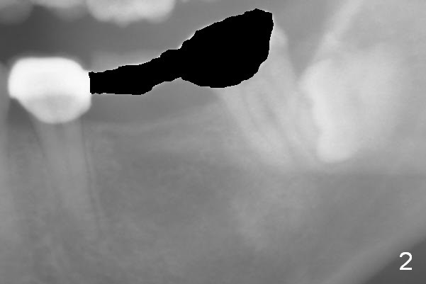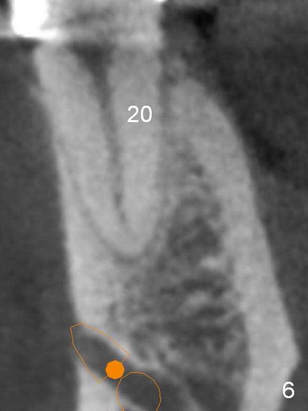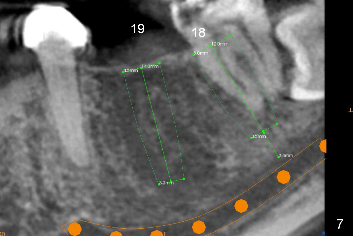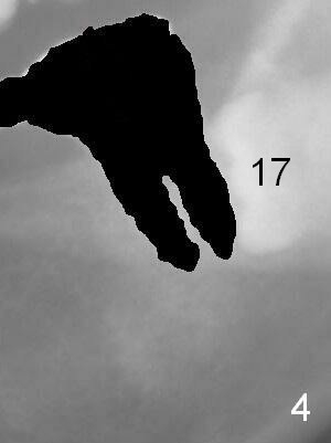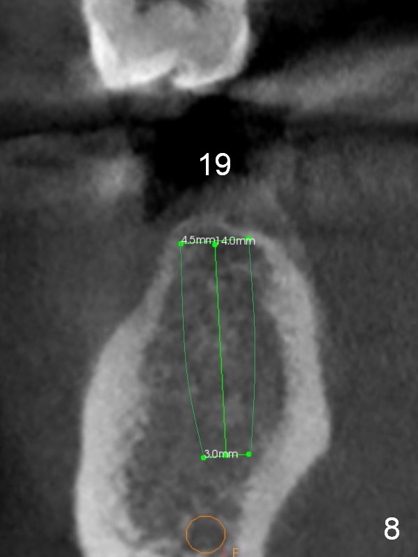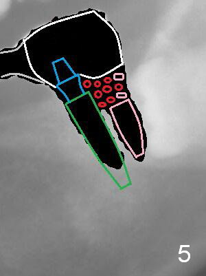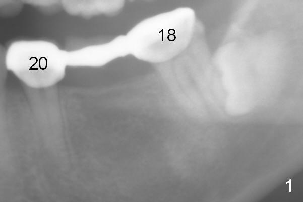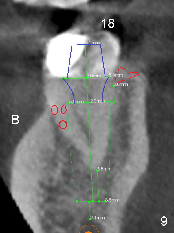 A 35-year-old lady (YL) has periodic nocturnal pain of the lower left quadrant. There is open buccal margin at the abutment of #18 (Fig.1 (from panoramus)). When the pontic and the retainer are removed (Fig.2), there is a large buccal subgingival carious lesion at the tooth #18. The latter has 2 roots, although close to each other. If the extraction turns out to be difficult, section the tooth (Fig.3 red line (no antibiotic)). To avoid contacting the tooth #17, place an implant at the mesial socket of #18 (Fig.5,7). Although it appears that the tooth #20 has no periapical radiolucency (Fig.6,7), the crown will be removed for diagnosis. A 3-unit provisional will be fabricated after an implant is placed at #19 (Fig.7,8) in the same appointment.
