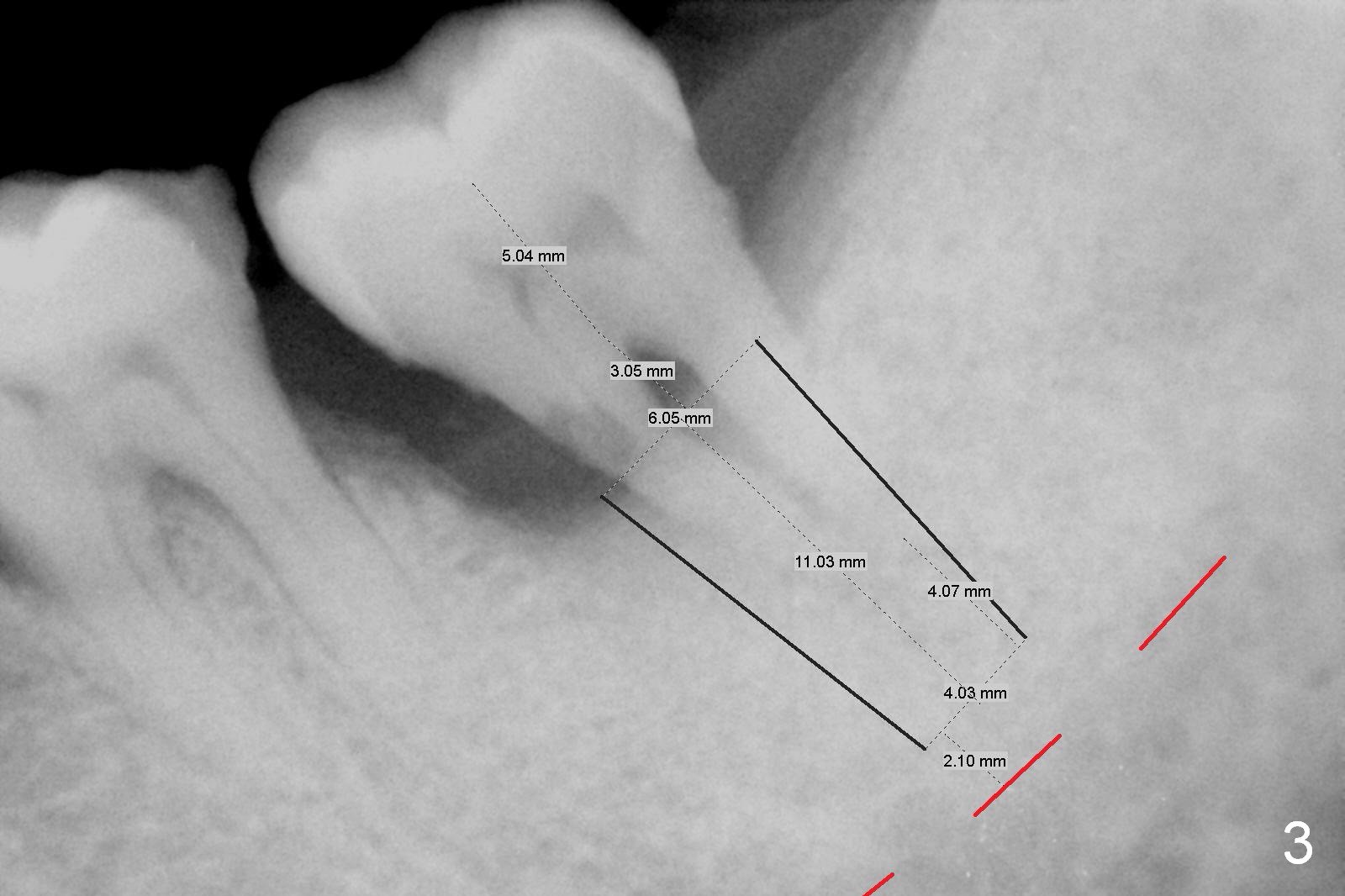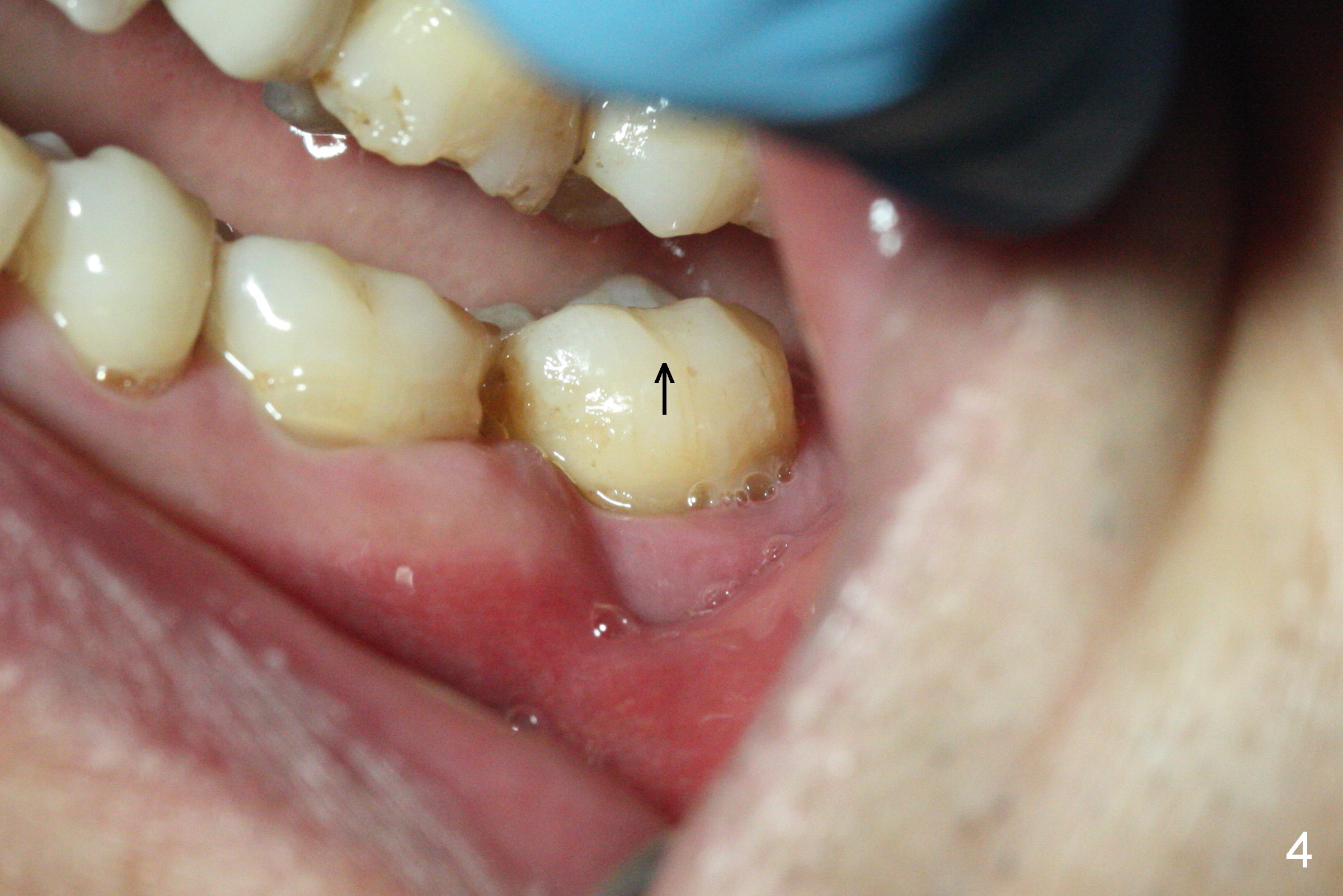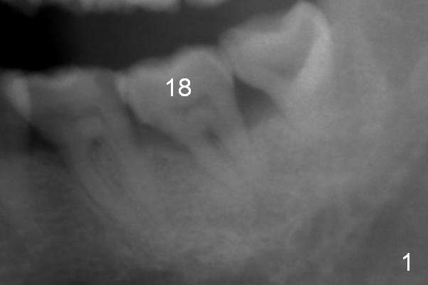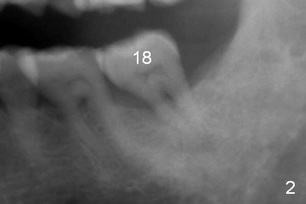 A 59-year-old man has history of chronic periodontitis (Fig.1 (taken in 2005), 2 (2014), 3 (2016)) involving the tooth #18. The bone loss may be complicated by bruxism. Large crown vs. narrow roots contributes to severe bone loss. An implant should be as long as possible and placed as coronally as possible to tackle crown/implant ratio issue. To prevent peri-implantitis, the implant may have to be placed deep. It appears that the bone height is more favorable mesially than distally (Fig.3). After extraction of the supraerupted and loose tooth (Fig.4; no Antibiotic), explore the socket to determine the favorite osteotomy site, most likely the mesial socket, lingually.