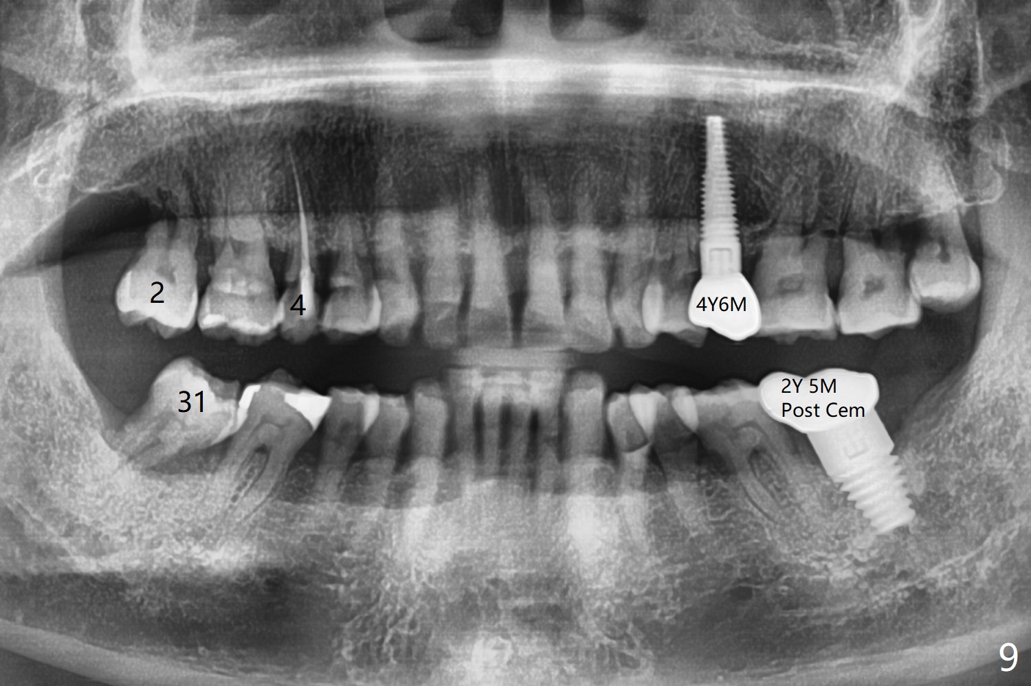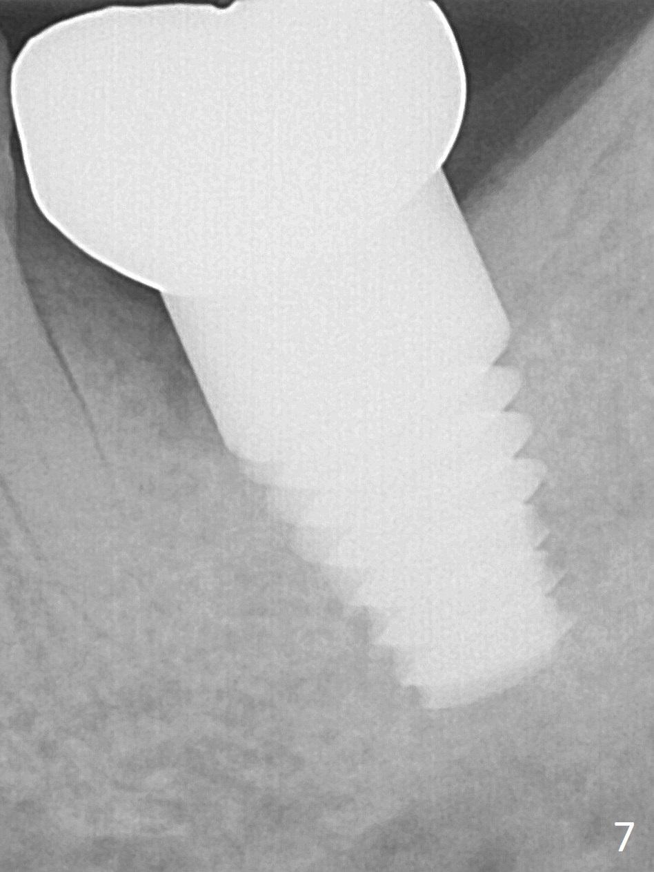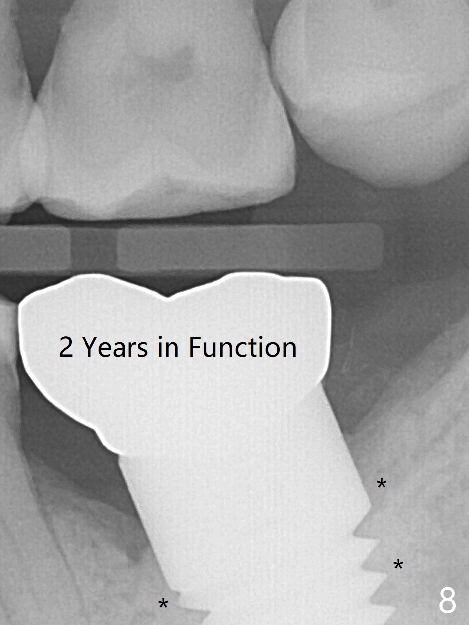It appears that the patient chews on the left postop, since the provisional perforates with loose abutment nearly 3 months postop and the tooth #3 has occlusal sensitive chip. The implants seems to have osteointegrated (Fig.6). To improve oral hygiene, the provisional is not recemented. The patient will return for impression in 2 weeks. It appears that there is short healing time for large implant. There is no bone loss 7 months post cementation (Fig.7). The buccal gingiva is lightly erythematous without tenderness 1 year 7.5 months post cementaion. Water pik is being used, although chronic periodontitis is not under control. Retrospectively, surgery should be shifted to socket preservation when a moderate implant (5 or 5.5 mm) fails to achieve primary stability. The extra large implant (8 mm for example) leaves a little gap buccolingually. Guided surgery would allow precise placement of the moderate implant without change in trajectory. The crown becomes loose because of occlusal perforation and limited vertical space. When a new crown is cemented, the bone density around the coronal threads is high (Fig.8 *). While the bone remains stable at #4 (6 months post RCT), 13 (4 years 6 months post cementation) and 18 (2 years 5 months post cementation), there is severe bone loss at #2 and 31 (Fig.9).