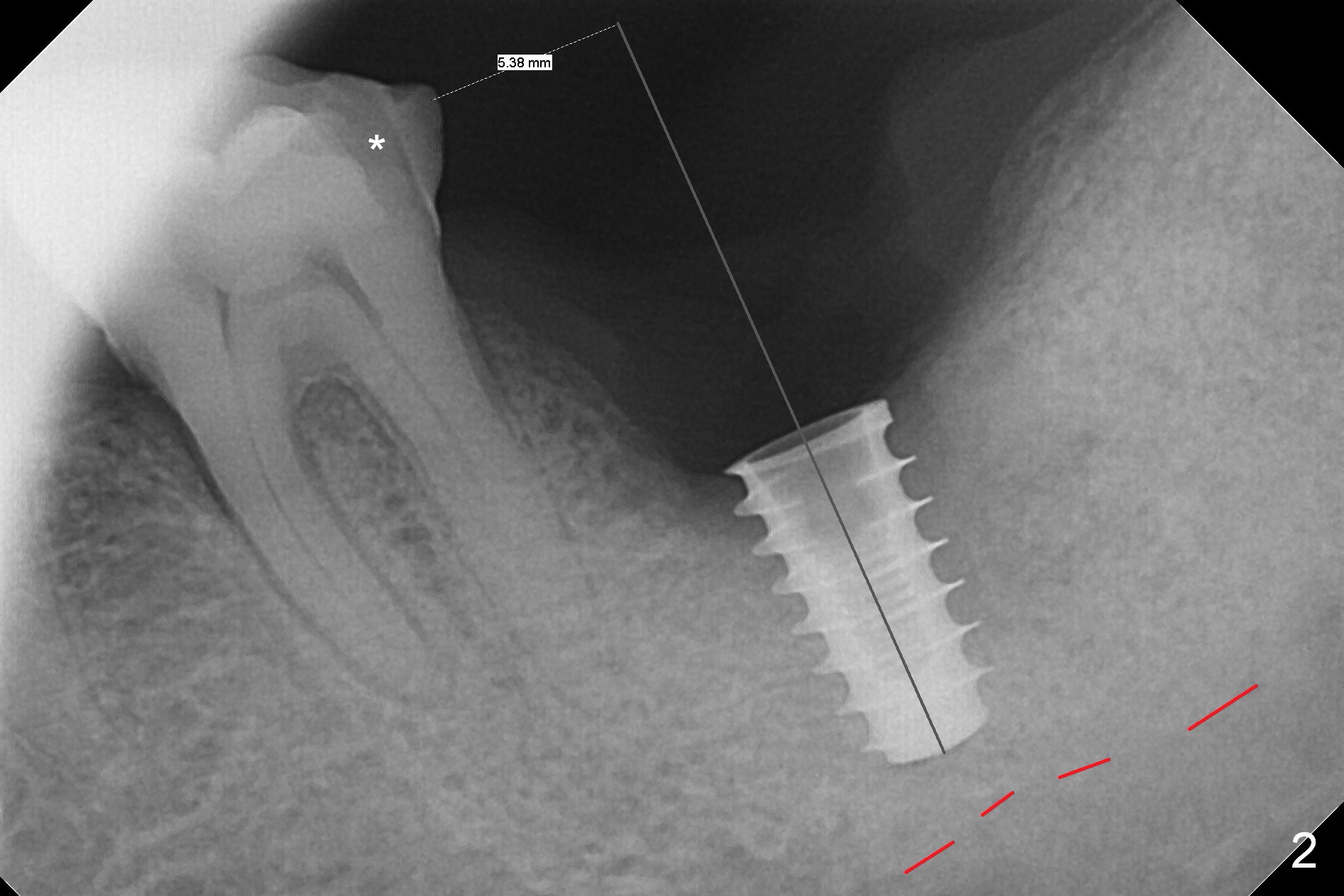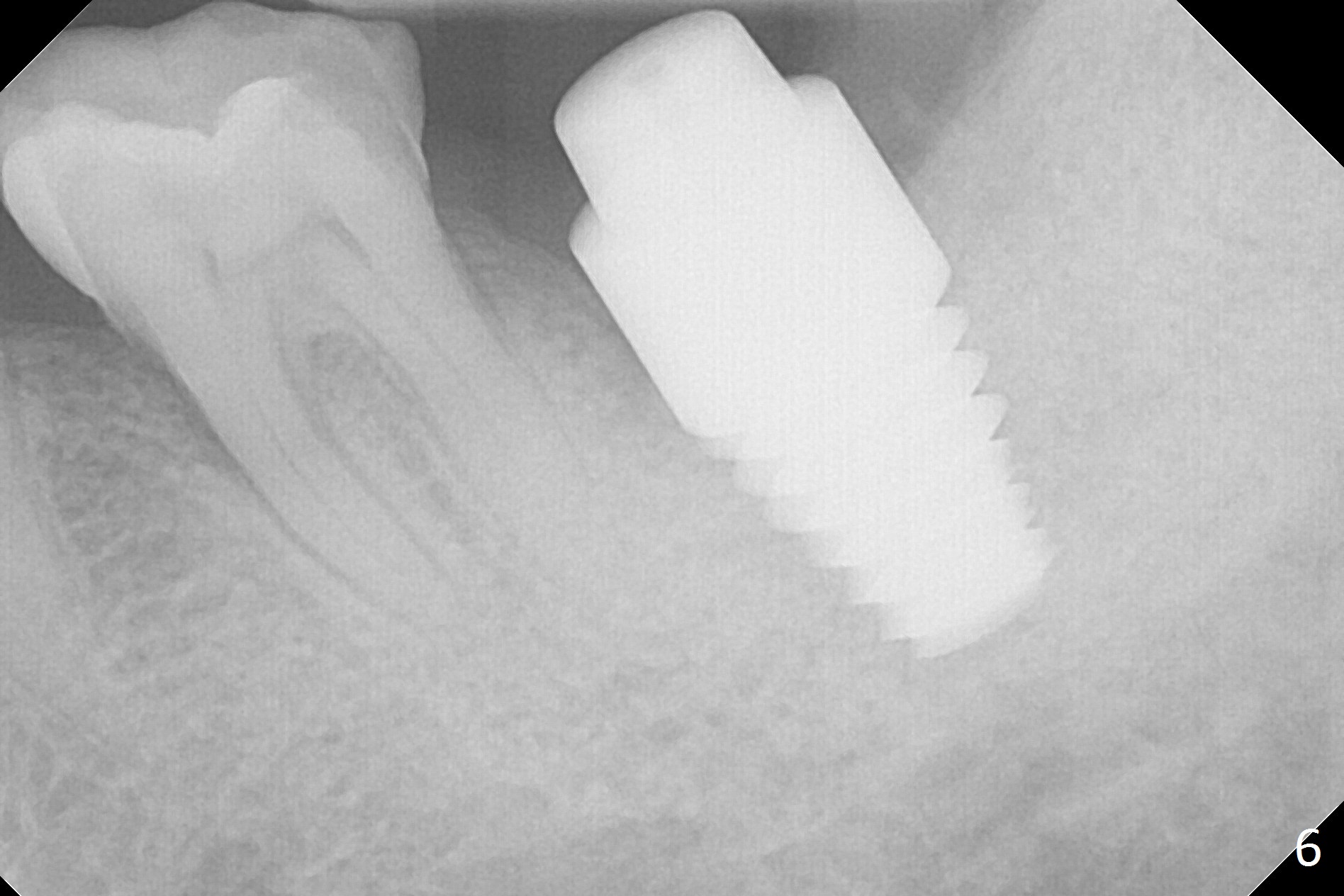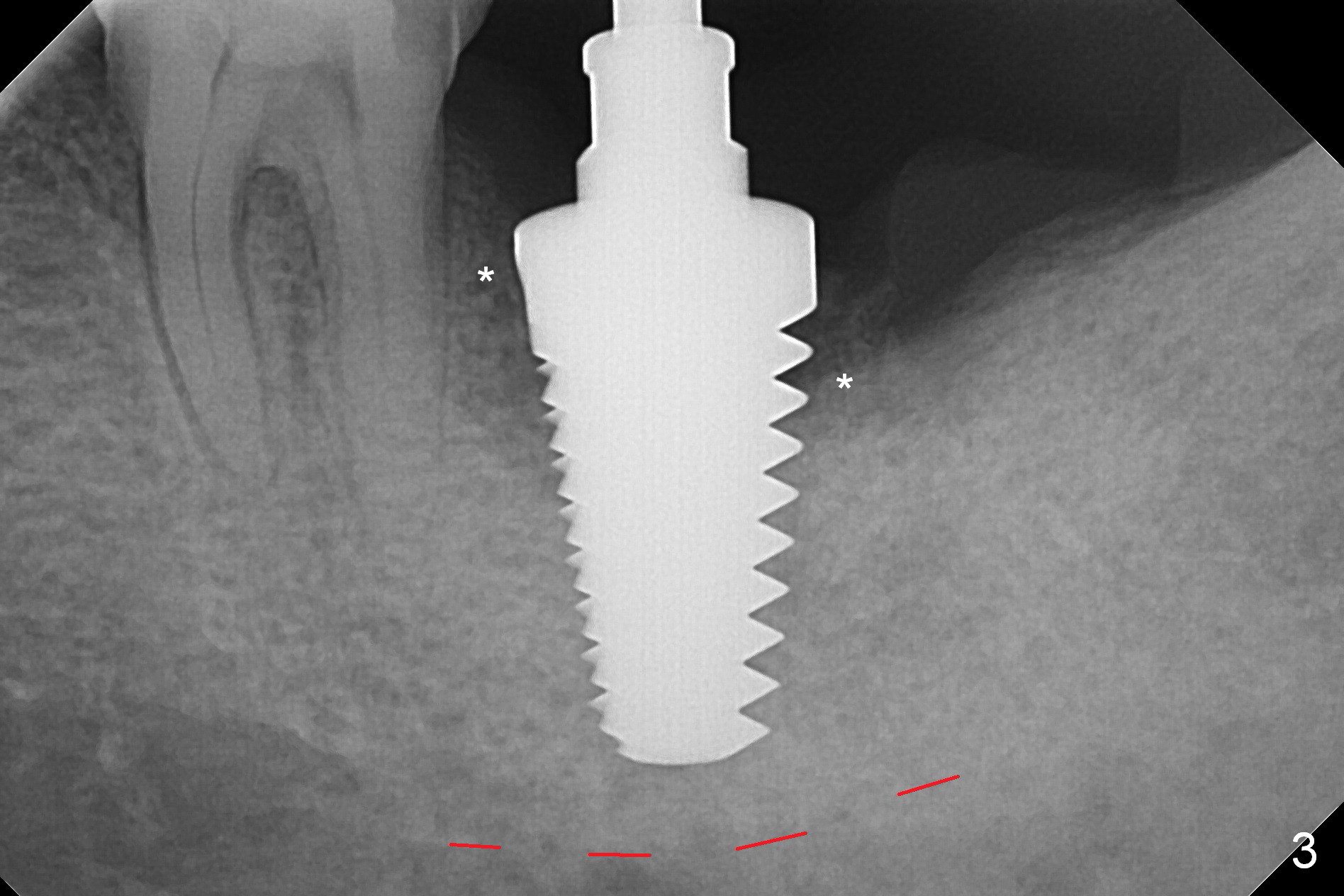 It appears that the patient chews on the left postop, since the provisional perforates with loose abutment nearly 3 months postop and the tooth #3 has occlusal sensitive chip. The implants seems to have osteointegrated (Fig.6). To improve oral hygiene, the provisional is not recemented. The patient will return for impression in 2 weeks. It appears that there is short healing time for large implant. There is no bone loss 7 months post cementation (Fig.7). The buccal gingiva is lightly erythematous without tenderness 1 year 7.5 months post cementaion. Water pik is being used, although chronic periodontitis is not under control. Retrospectively, surgery should be shifted to socket preservation when a moderate implant (5 or 5.5 mm) fails to achieve primary stability. The extra large implant (8 mm for example) leaves a little gap buccolingually. Guided surgery would allow precise placement of the moderate implant without change in trajectory. The crown becomes loose because of occlusal perforation and limited vertical space. When a new crown is cemented, the bone density around the coronal threads is high (Fig.8 *). While the bone remains stable at #4 (6 months post RCT), 13 (4 years 6 months post cementation) and 18 (2 years 5 months post cementation), there is severe bone loss at #2 and 31 (Fig.9).
