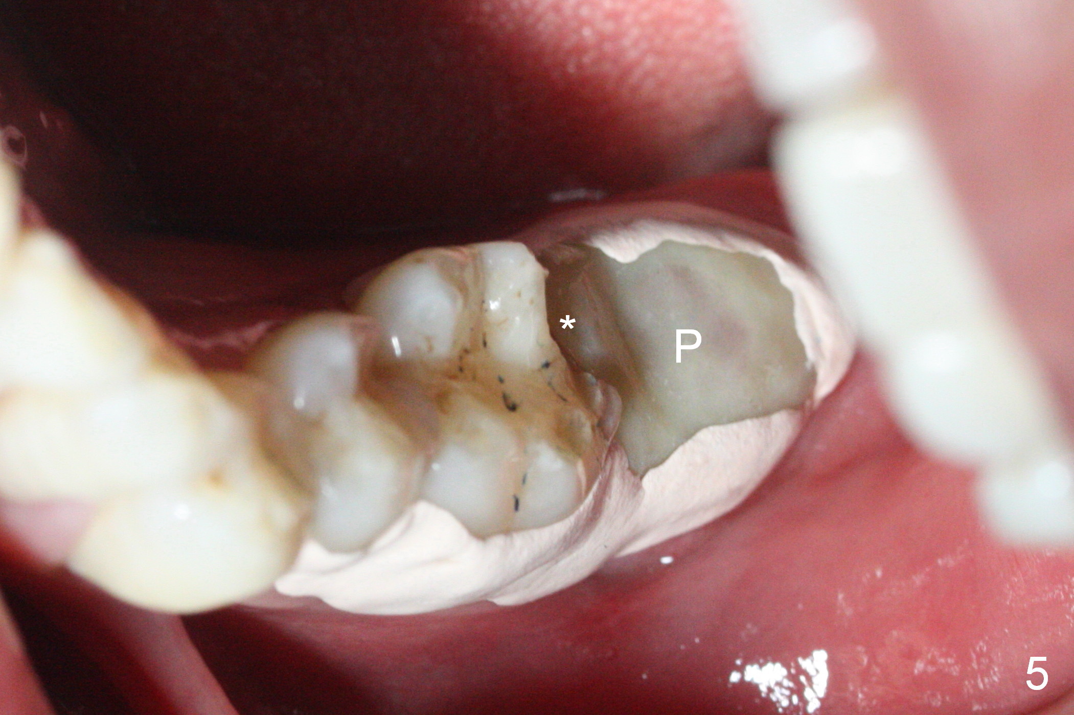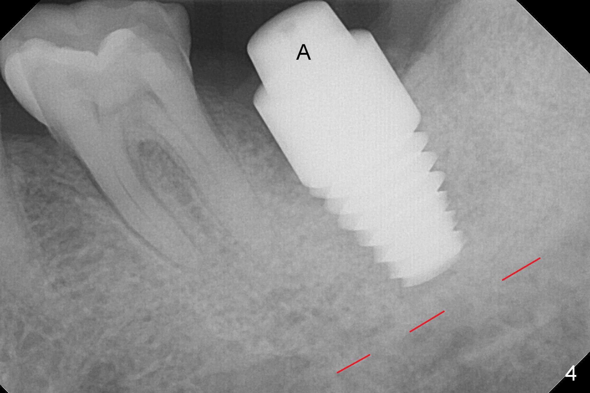 When the tooth #18 is extracted, the buccal and lingual plate are absent. Initial osteotomy is established in the middle of the socket (Fig.1). After 4.3 mm Magic Drill (15 mm from the buccal gingival margin, new bone ~ 4 mm), a 5x9 mm IBS dummy implant is placed with correct trajectory (Fig.2). Since the bone density is seemingly high, the same size of a definitive implant is placed with primary stability. The trajectory is found not ideal after bone graft and insertion of an abutment (data not shown). The stability is lost when the trajectory is changed. No primary stability is achieved with a larger (5.5x9 mm) implant. Tatum tapered taps (6x17, 7x17 and 8x17 mm) are used. The latter obtains stability with contact with the mesial and distal crests (Fig.3 *). A 8x14 mm tissue-level implant is placed with insertion torque ~ 55 Ncm (Fig.4). A 6x3 mm abutment (Fig.4 A) is placed to retain an immediate provisional (Fig.5 P). The drawback of the extra large implant is lack of bone buccolingually. Oral hygiene is emphasized so that the buccal and lingual bone have chance to regenerate. Fortunately there appears to be no paresthesia postop.