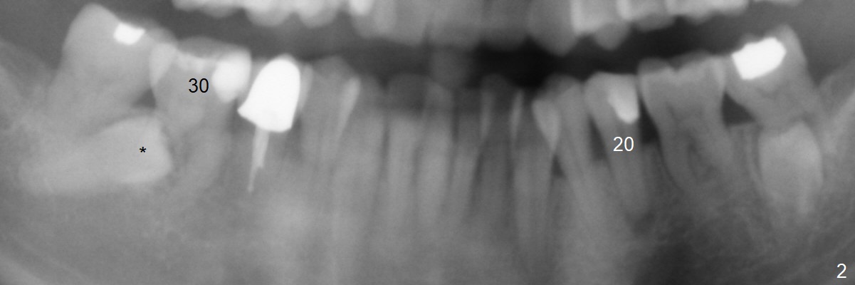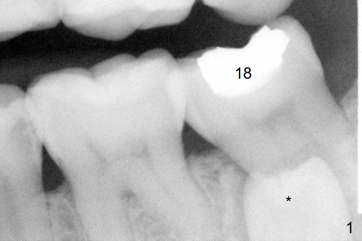 A 45-year-old woman with severe crowding (Fig.2) presented to my office 9 years ago; the tooth #18 appears to have root resorption, most likely due to a supernumerary tooth (Fig.1 *). The latter seems to be erupting in 6 and 9 years (Fig.2,3), probably because of immature apex (Fig.2, as compared to the supernumerary tooth in the lower right (*)). Recently the patient has transient sensitivity at #18. The tooth has mobility I without deep periodontal pockets. If the tooth #18 turns to be non-salvageable, what should be done? The tooth #20 has received root canal therapy, while the tooth #29 has had RCT retreat.
