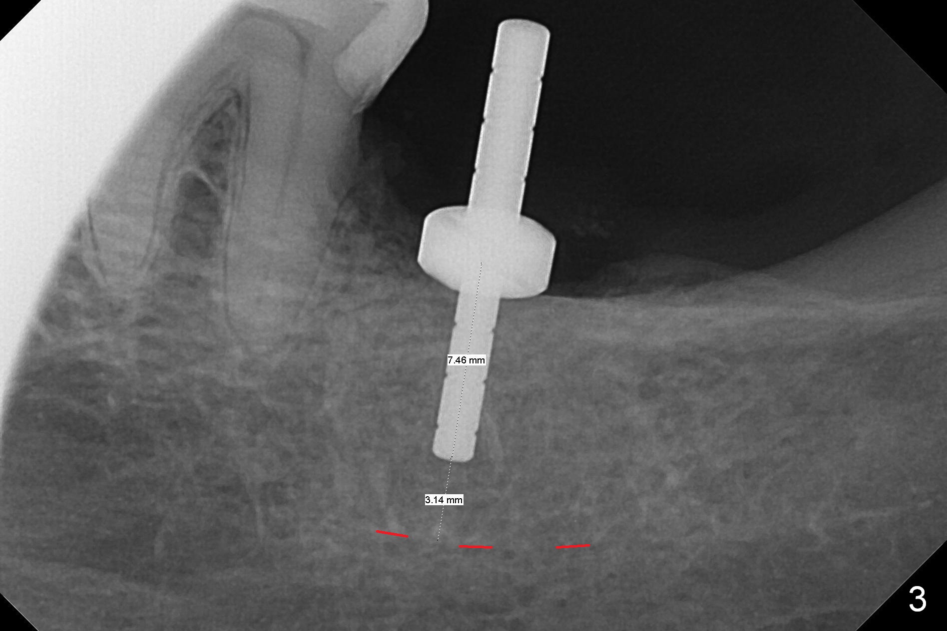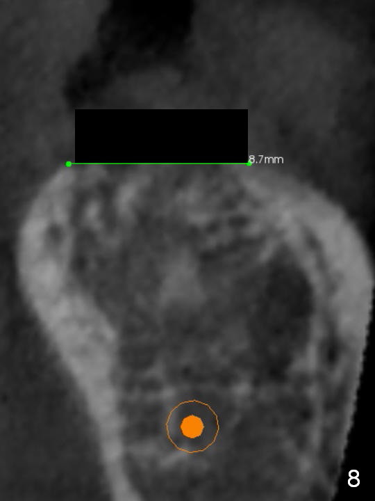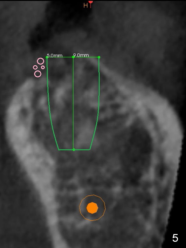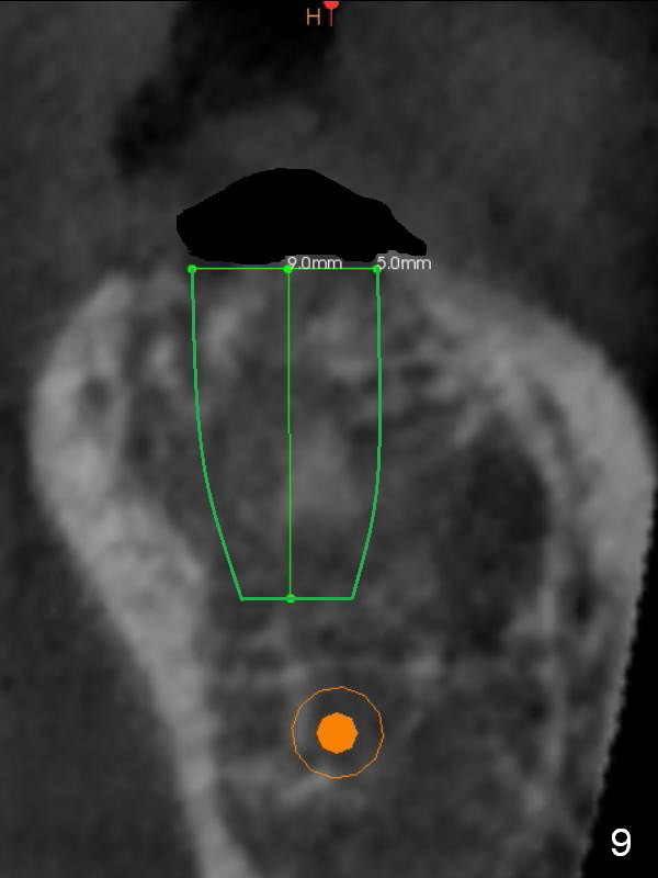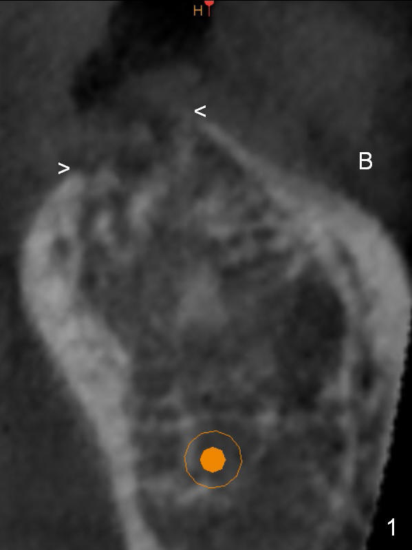 Preop palpation of the edentulous area at #18 does not show the flatness of the ridge top as shown by CBCT. Incision reveals that the ridge is not as wide as CBCT indicates (Fig.1 (coronal section) between arrowheads). In fact the ridge is concave (Fig.2 red dashed line). Osteotomy is initiated in the middle of the concavity (Fig.2 green line) with insertion of 7 mm guide pin (Fig.3). After removal of the pin, the osteotomy is moved buccally (Fig.4). After Marking Bur and 4.3 mm Magic Drill, a 5x9 mm IBS implant is placed with 2.8 mm clearance from the Inferior Alveolar Canal (Fig.6). Following deepening the osteotomy with Final Drill, the implant is placed deeper (Fig.7). The osteotomy happens to be established in the mesial socket, since the distal socket has not completely healed (Fig.6 yellow dashed line). Granulation tissue is removed. Since the lingual crest is lower than the buccal one (Fig.1 B), there is lingual thread exposure after implant placement (Fig.5). The exposed thread is covered by bone graft (autogenous bone, allograft and Osteogen, Fig.5 pink circles). Some of the graft is apparently pushed into the distal socket (Fig.7 yellow dashed line) post GBR and suture. As the implant is placed twice, insertion torque is <10 Ncm (although the implant is stable). A 5x3 mm healing abutment is placed (Fig.7 H).