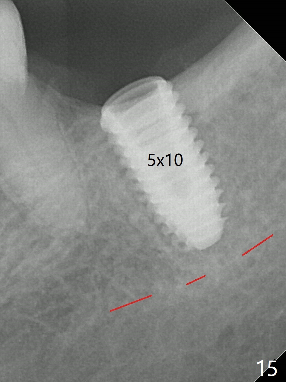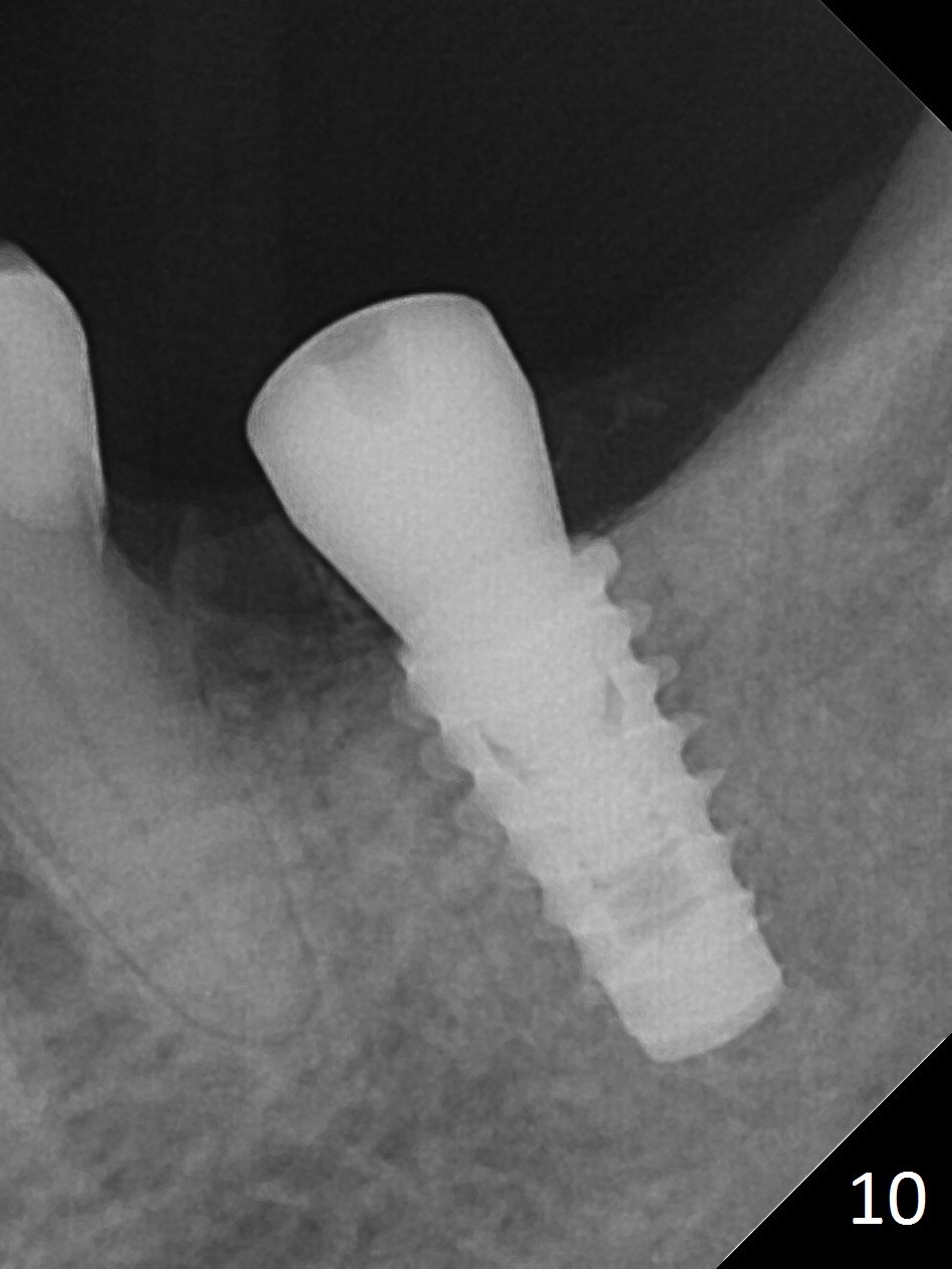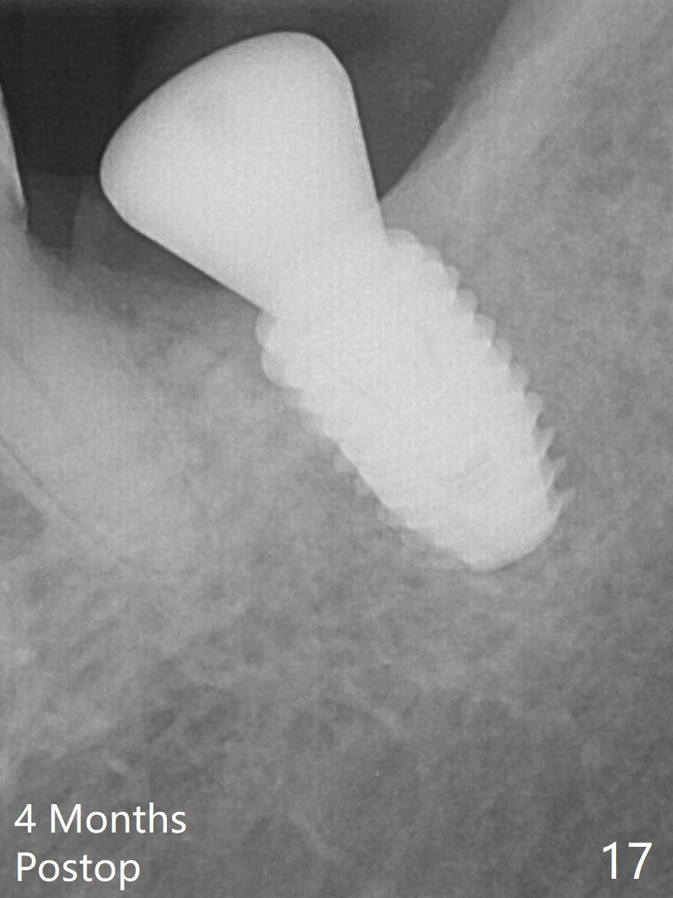 There is no apparent bone loss 4 months postop (Fig.10). There is chewing pain in spite of occlusal adjustment 7 months post cementation (Fig.11-13: increased radiolucency around the implant). The crown/abutment is removed and a healing abutment is placed (6x3 mm); the implant is stable. The patient return for re-evaluation in 3 months (15 months postop); radiolucency appears to reduce (Fig.14). But there is pain when the healing abutment is being removed. After local anesthesia, the implant is removed with a wrench. Following debridement of the osteototomy (intact, although tender), a 5x10 mm dummy implant with SLA surface is placed (Fig.15). After 5.5 mm tap, a 5.5x8.5 mm implant is placed with >50 Ncm (Fig.16). A 6.8x5 mm healing abutment is placed, followed by periodontal dressing. Re-analysis of preop CBCT shows that the bone density at the site is low: 70 units average. Progressive loading is necessary for this case 4-6 months postop. The soft and hard tissues around the implant seem to heal 4 months postop (Fig.17).