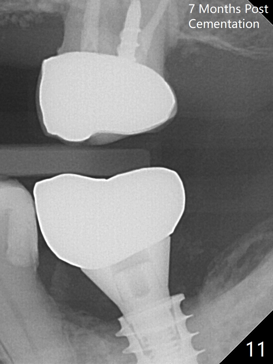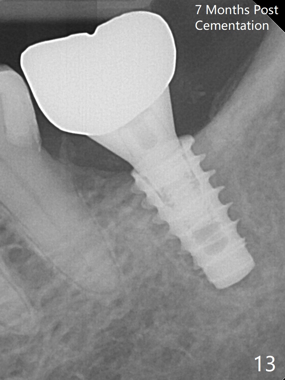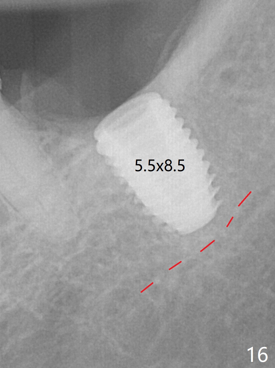 There is no apparent bone loss 4 months postop (Fig.10). There is chewing pain in spite of occlusal adjustment 7 months post cementation (Fig.11-13: increased radiolucency around the implant). The crown/abutment is removed and a healing abutment is placed (6x3 mm); the implant is stable. The patient return for re-evaluation in 3 months (15 months postop); radiolucency appears to reduce (Fig.14). But there is pain when the healing abutment is being removed. After local anesthesia, the implant is removed with a wrench. Following debridement of the osteototomy (intact, although tender), a 5x10 mm dummy implant with SLA surface is placed (Fig.15). After 5.5 mm tap, a 5.5x8.5 mm implant is placed with >50 Ncm (Fig.16). A 6.8x5 mm healing abutment is placed, followed by periodontal dressing. Re-analysis of preop CBCT shows that the bone density at the site is low: 70 units average. Progressive loading is necessary for this case 4-6 months postop. The soft and hard tissues around the implant seem to heal 4 months postop (Fig.17).