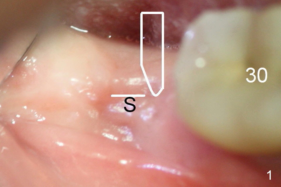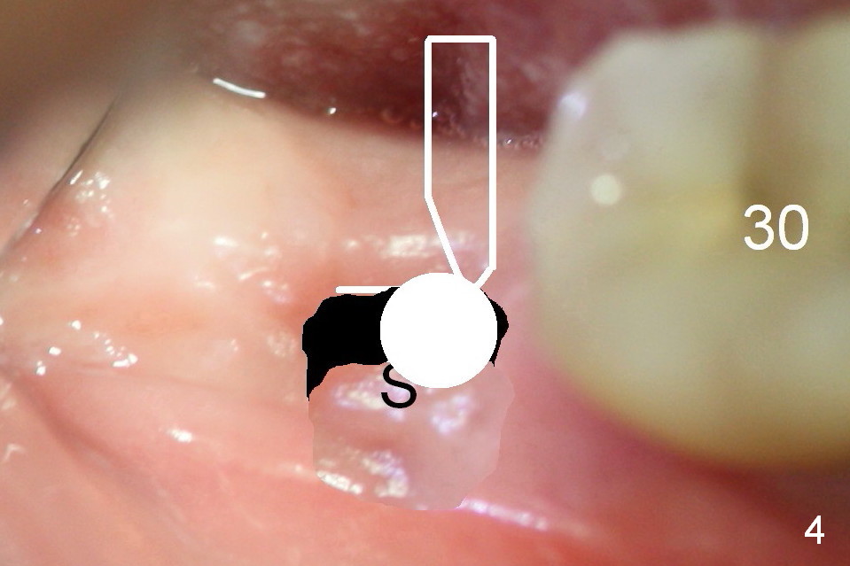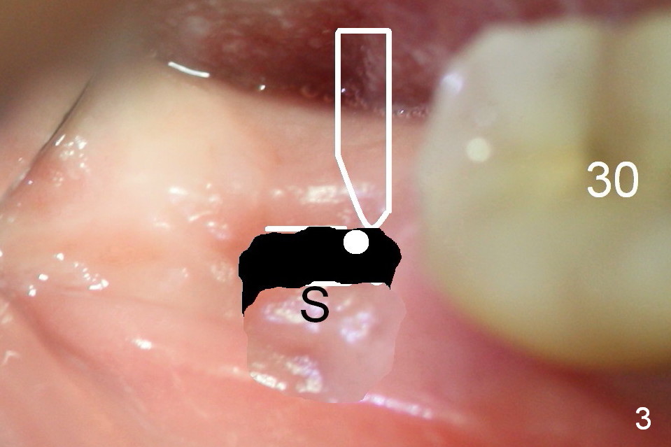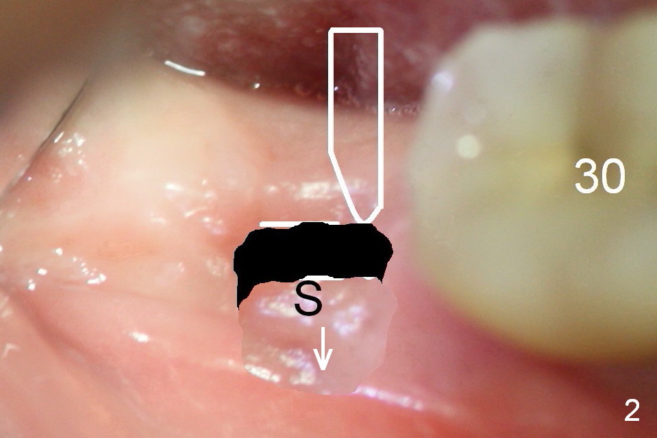 After incision and flap elevation, use #15 blade (Fig.1 white outline) to start bone expansion as lingual as possible (white line). Use bone scalpels, bone blades and D osteotomes to push the bone buccally (Fig.2 arrow). Use 2 mm pilot drill to initiate osteotomy as lingual and mesial as possible (Fig.3 white circle). The next step is to use bone expanders as apical as possible (Fig.4 white circle). If the apical bone is hard, use drills at 50 RPM (to collect bone).