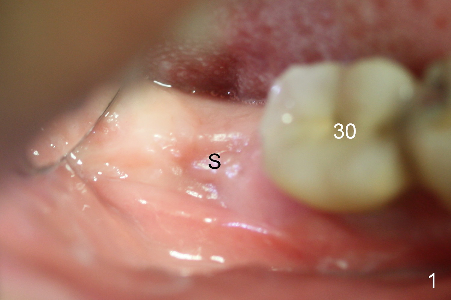 A 75-year-old man has apparent history of bruxism. The distal root of the tooth #31 had vertical fracture after root canal therapy. The tooth was extracted ~ 2 months ago while he returned to home country. It appears that there is buccal plate atrophy (Fig.1 S: socket).