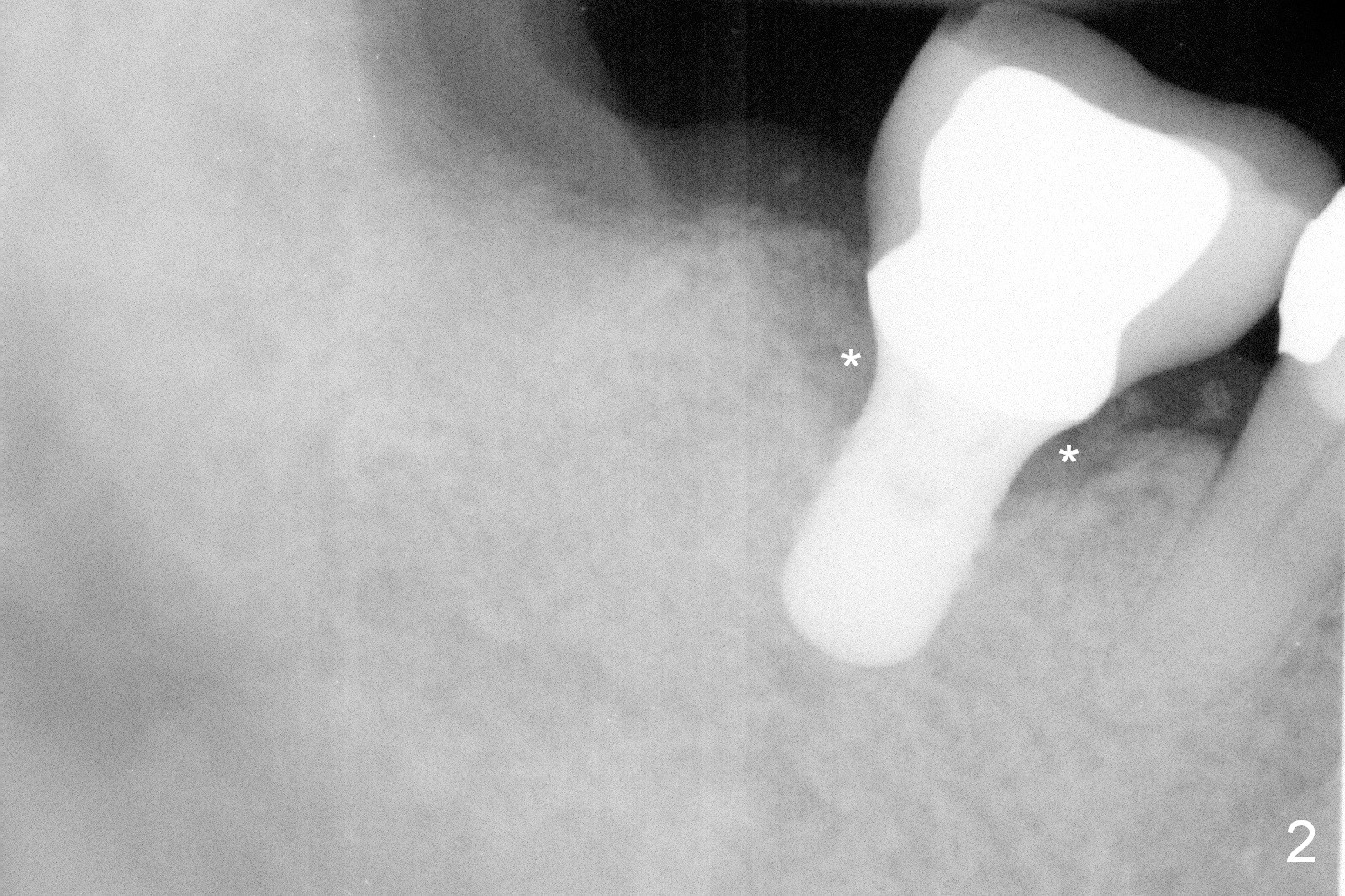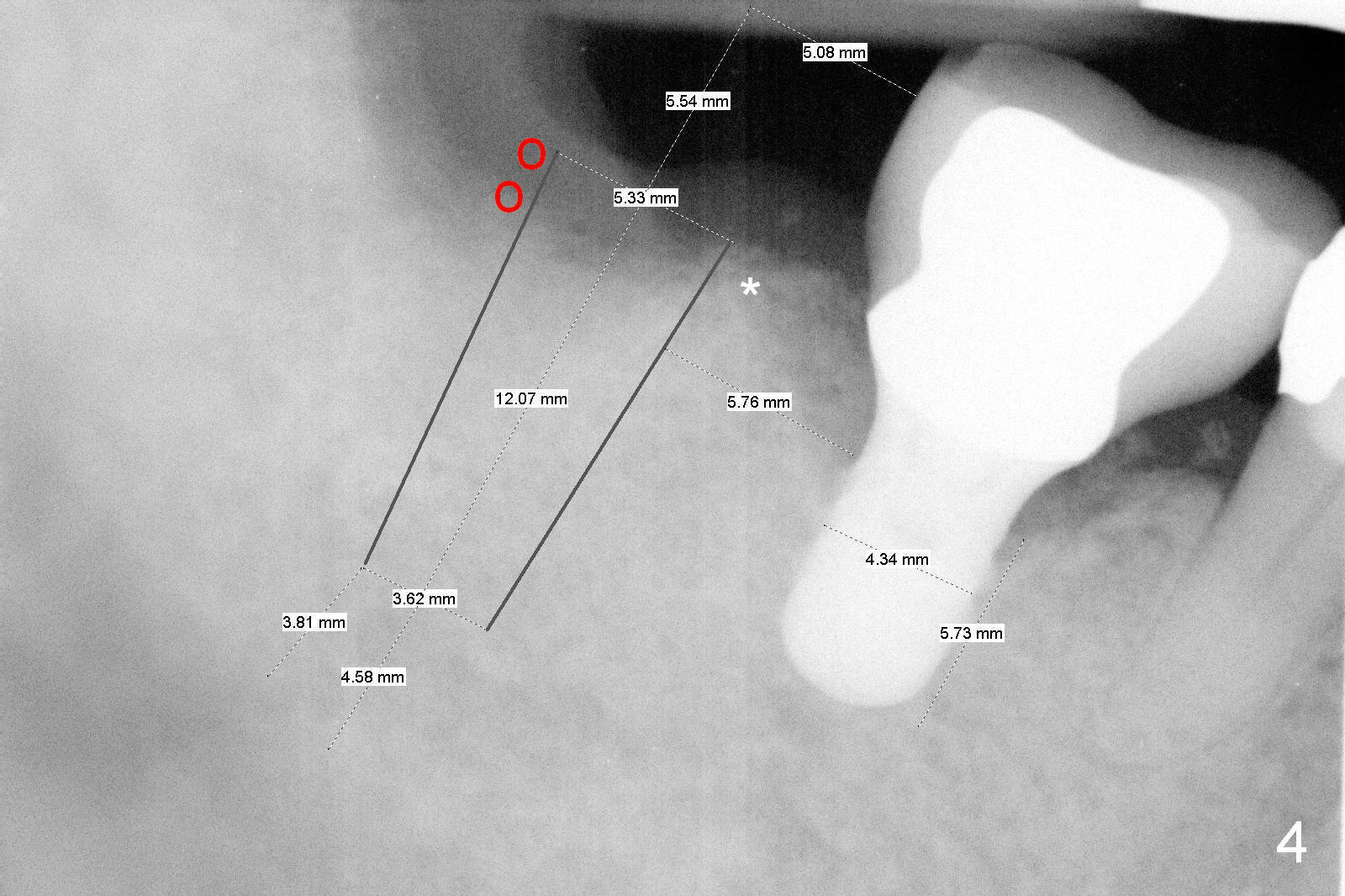 The design in Fig.4 overcomes these 2 shortcomings. The center of the implant is 5 mm from the neighboring tooth. Mesially there is more bone support (*), whereas distally bone graft is necessary (red circles). There is still enough space between the two implants; the minimum is 3 mm.