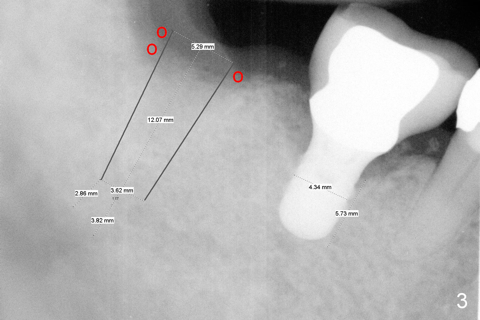 Fig.3 is a design to place a 5.3x12 bone level implant in the middle of the healing socket. The drawbacks are two folded. First the implant is placed too distally. Second, the implant is close to the underlying nerve.