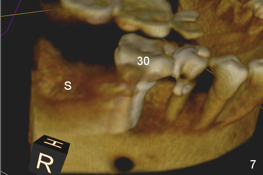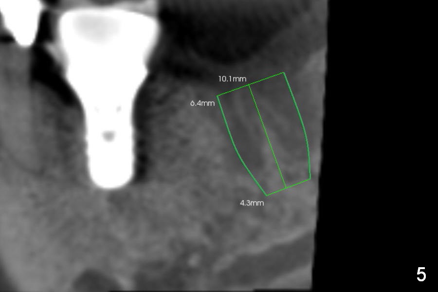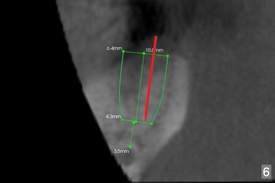 Preop CBCT shows that a 6.4x10 mm implant is appropriate if placed in the middle of the socket (septum), 6 mm from the crown of #30 (Fig.5). Coronal section confirms that because of the lingual slope of the socket, osteotomy should be placed lingually (Fig.6 red line). Three-D image is shown in Fig.7.