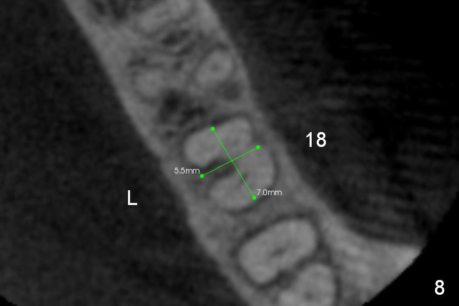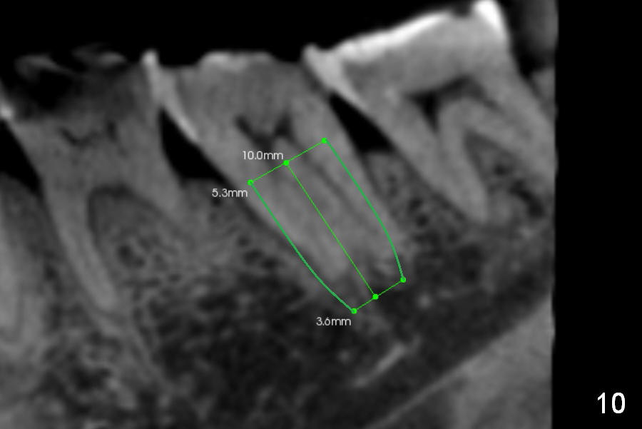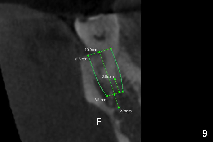 CBCT Analysis of the lower left 2nd molar reveals that the proper implant size is 5.3x10 mm (Fig.8-10). The root is C shaped; limiting factor is buccolingual width (5.5 mm, Fig.8 (axial section)). The major difference between #18 and 31 is the resorption of the buccal plate of the latter (traumatic extraction, Fig.9 (F: submandibular fossa)).
