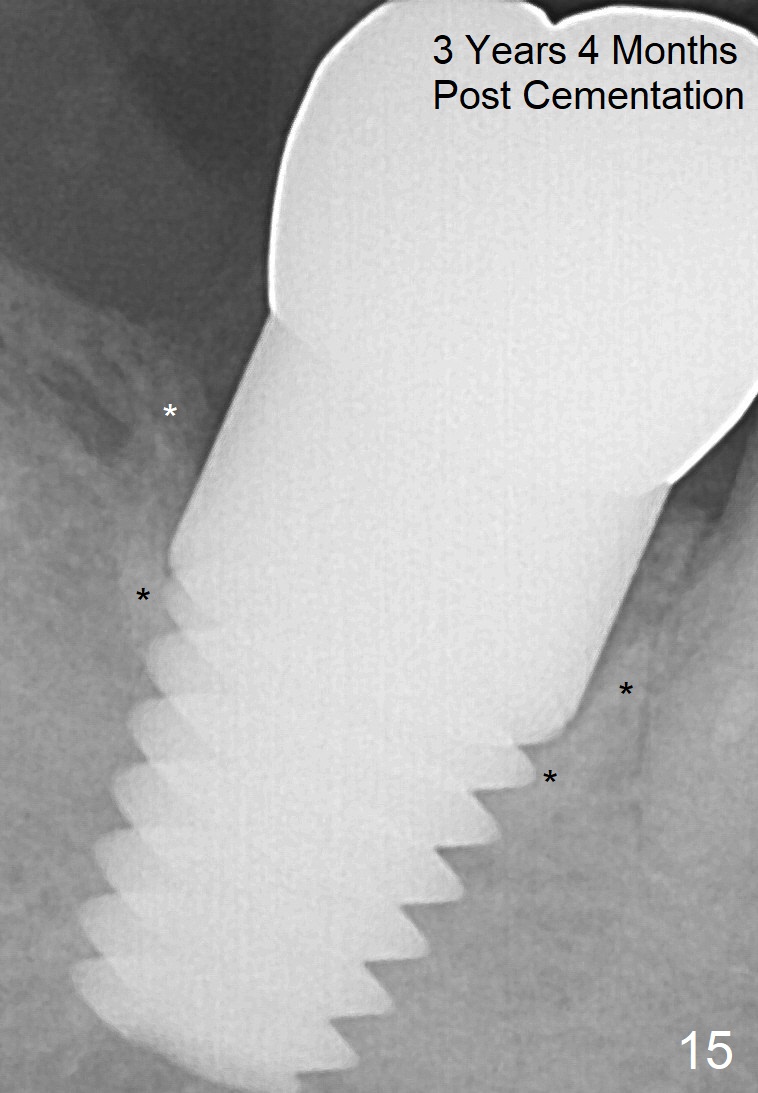The lamina dura-like dense bone forms coronally 3 years 4 months post cementation (Fig.15 *).