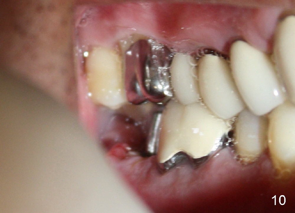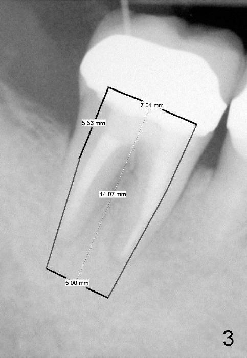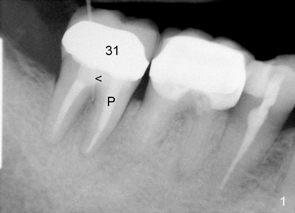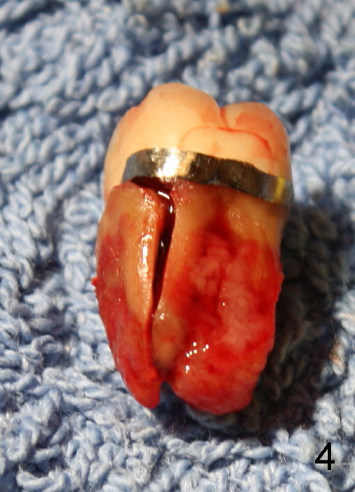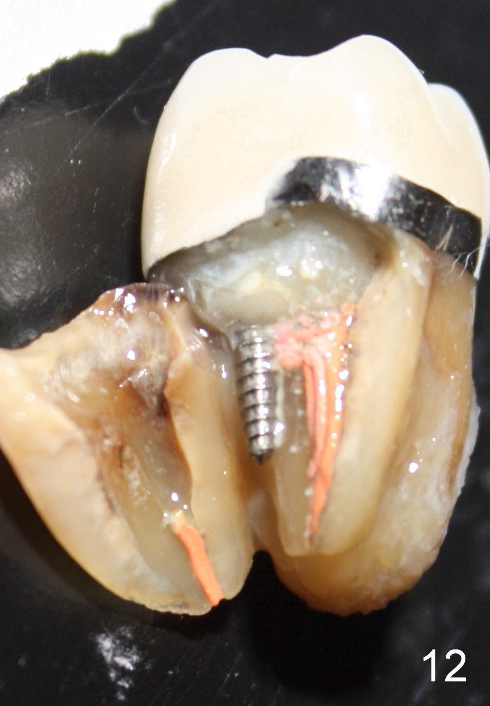 Fig.12 show root fracture associated with mesiobuccal post of the 2nd molar. In contrast the lower right 2nd premolar is intact without crown after root canal therapy. It appears that the post weakens the root.