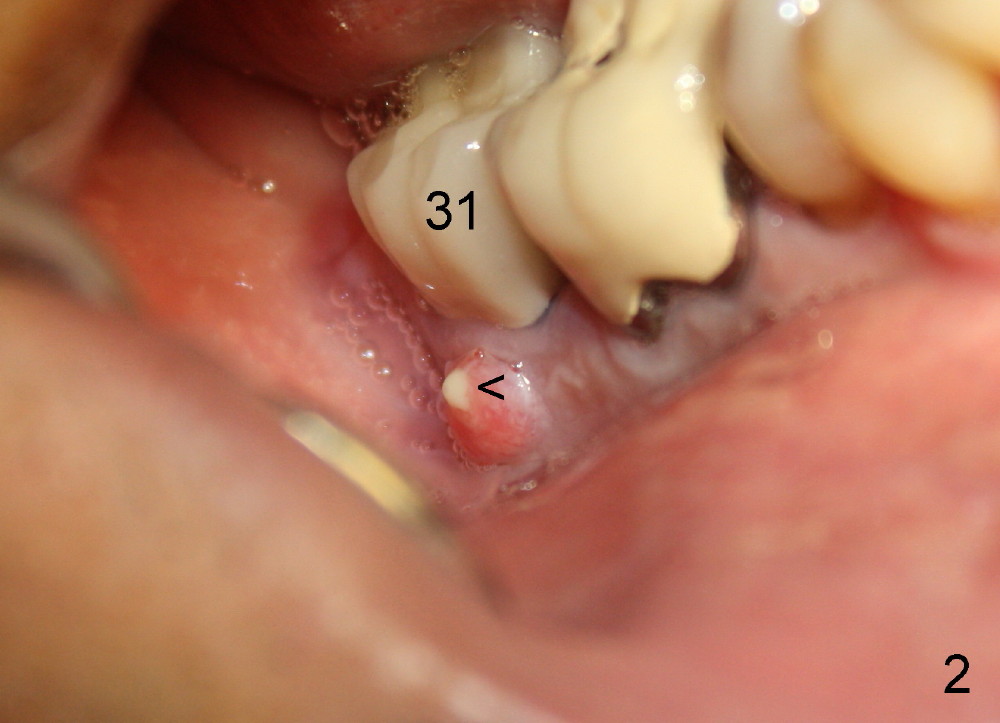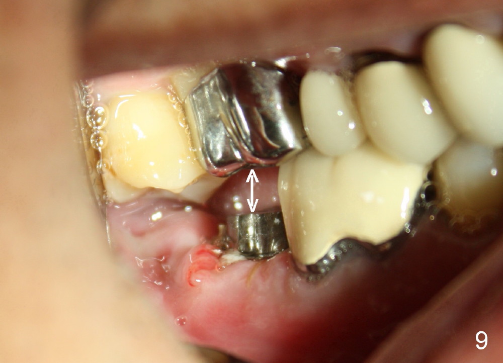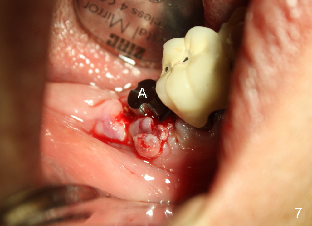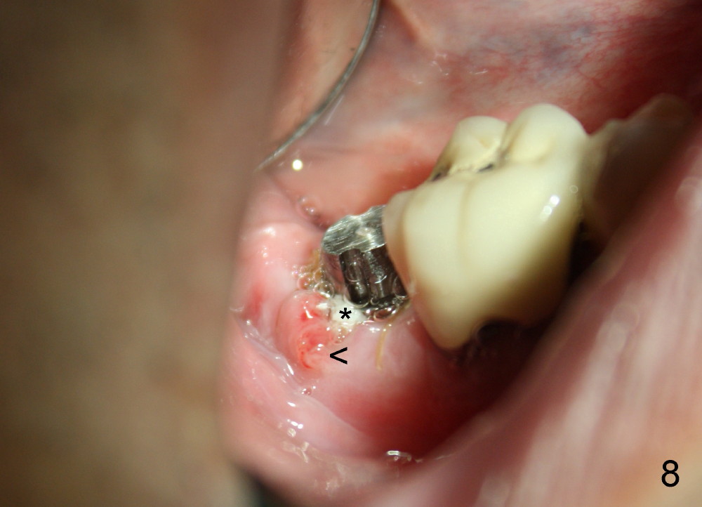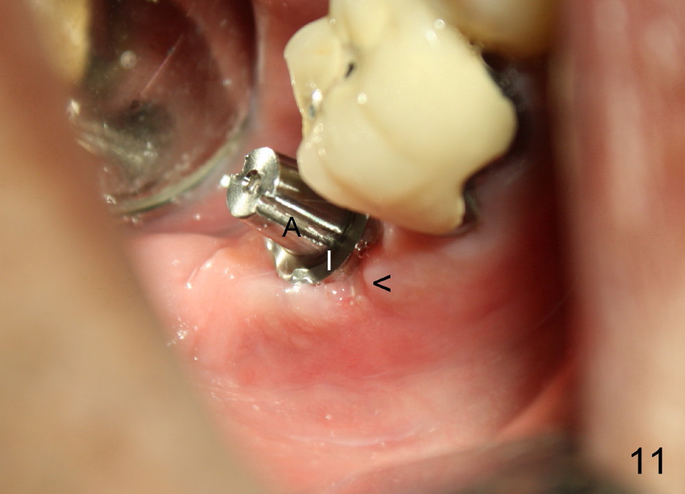 A 51-year-old man has experienced pain and swelling in the lower right 2nd molar for 7 months (Fig.1, P: post in the mesial root; <: gutta percha inserted into a buccal fistula). Fig.2 is taken immediately before extraction (<: purulent discharge from the mesiobuccal fistula) and immediate implant (Fig.3 implant design: 7x14 mm). A vertical root fracture is noted in the mesial root (Fig.4: lingual view). The septum is in fact absent, as compared to Fig.1. The mesiobuccal plate is low; the osteotomy starts lingual to the center of the socket. Fig.5 shows a 4.5x17 mm tap in place: approximately 3.5 mm in the new bone (~2.5 mm from the inferior alveolar canal). When a 7x17 mm tap (14 mm from the gingival margin) is placed in the socket, it looks relatively small. Fig.6 shows a 8x14 mm implant in place with a small gap distally. Mineralized cancellous allograft and Osteogen mixture is placed mainly buccally, followed by a thin strip of collagen dressing and sutures (Fig.7); an abutment (A) is placed to keep perio dressing in place. The perio dressing does not stay long. The buccal portion dislodges by itself 5 days postop. The lingual portion is removed in clinic. New dressing is going to be re-applied, because the buccal wound has not completely healed (Fig.8 <, albeit asymptomatic) with partial exposure of the bone graft (*). Why is the dressing lost so early? The abutment is not long enough; there is plenty of occlusal clearance (Fig.9 arrows). A longer abutment is used to increase mechanical retention for perio dressing (Fig.10). By the time the second perio dressing dislodges, the wound has healed (Fig.11, 13 days postop).