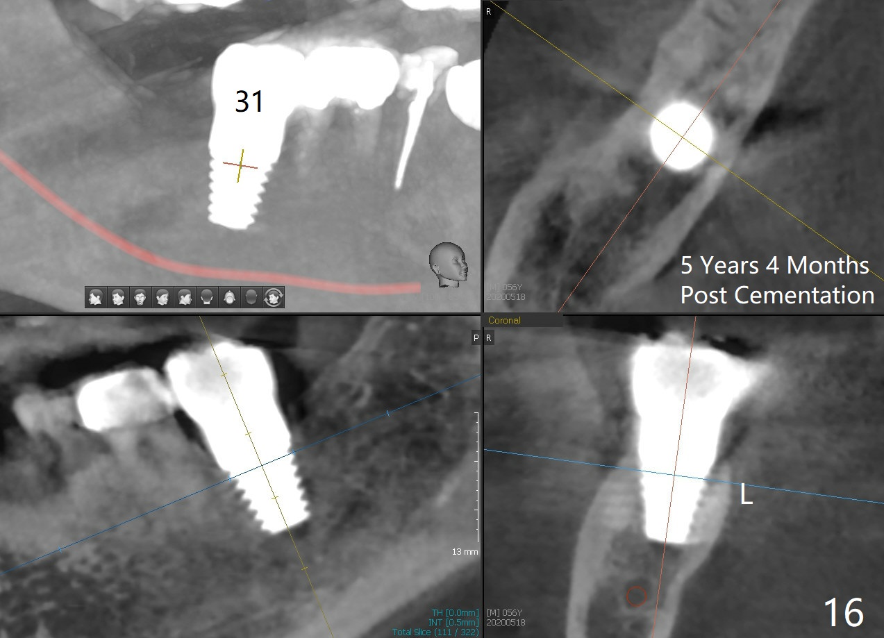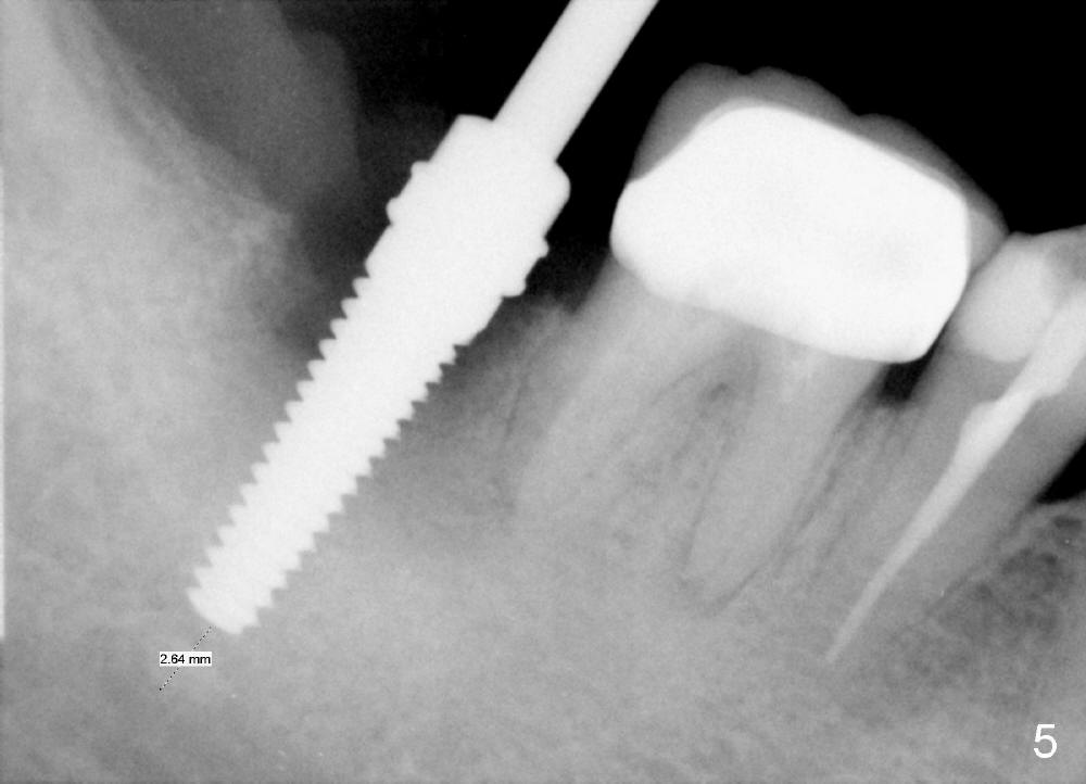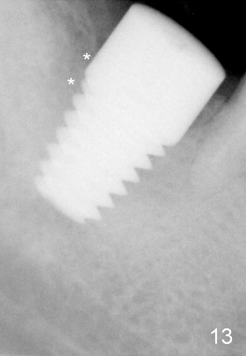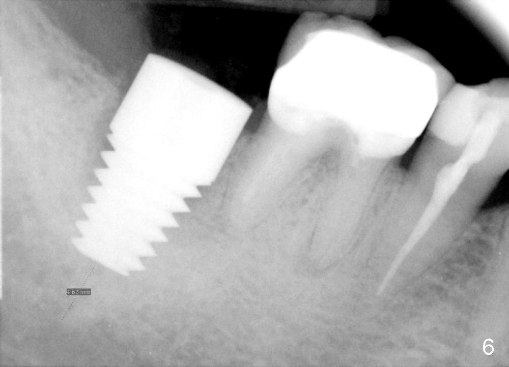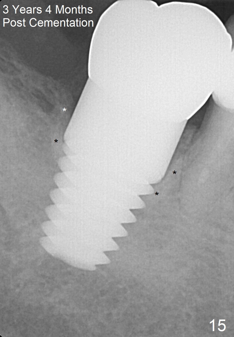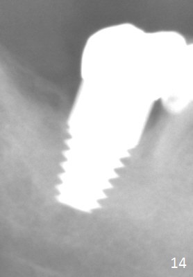 The patient returns for final restoration 5.5 months postop; it appears that the distal gap has disappeared (Fig.13 *). There is no bone loss 26 months post cementation (Fig.14). The lamina dura-like dense bone forms coronally 3 years 4 months post cementation (Fig.15 *). The 8 mm implant remains buried in the bone 5 years 4 months post cementation (Fig.16).