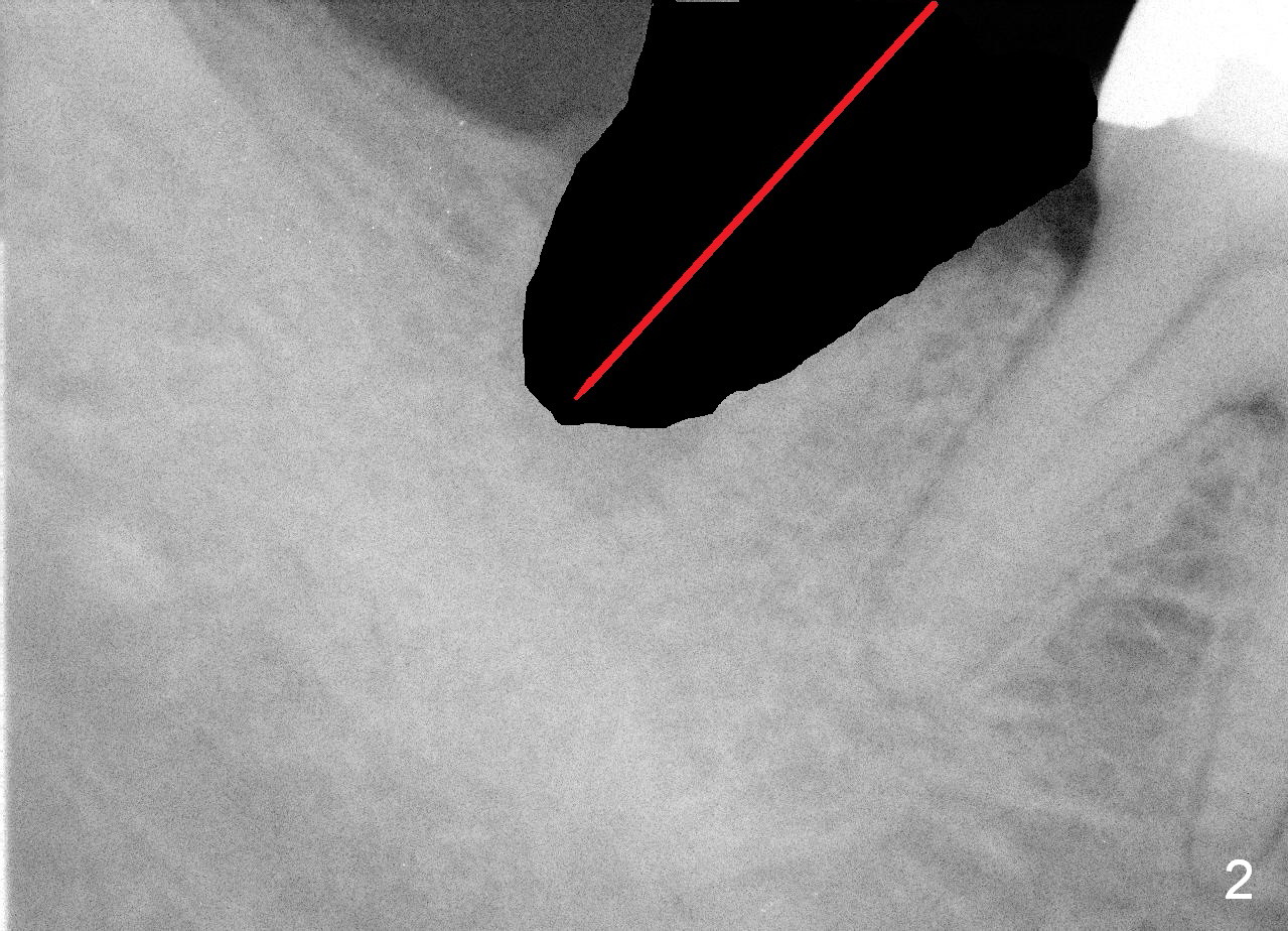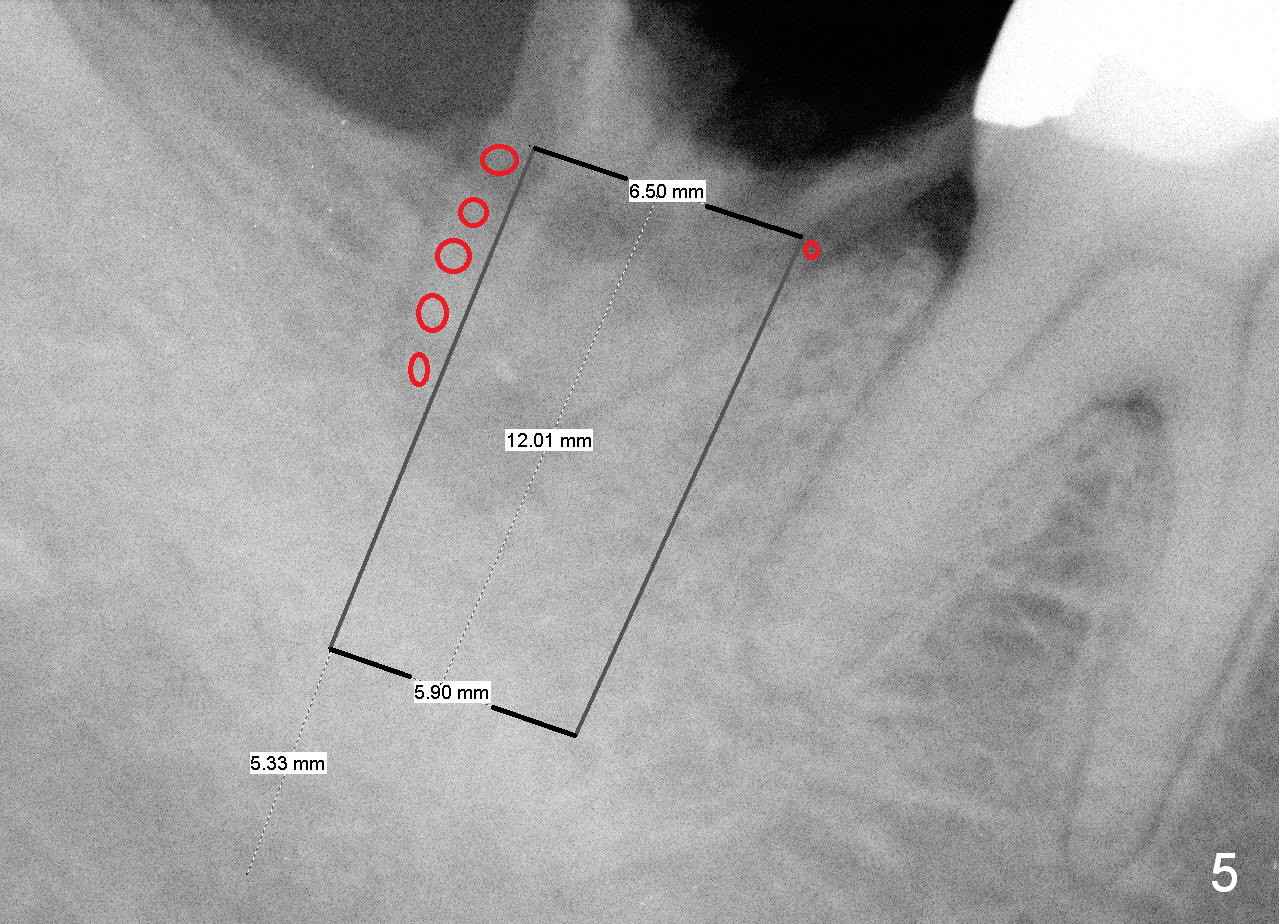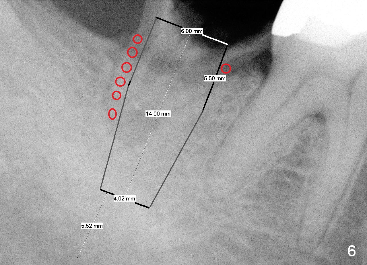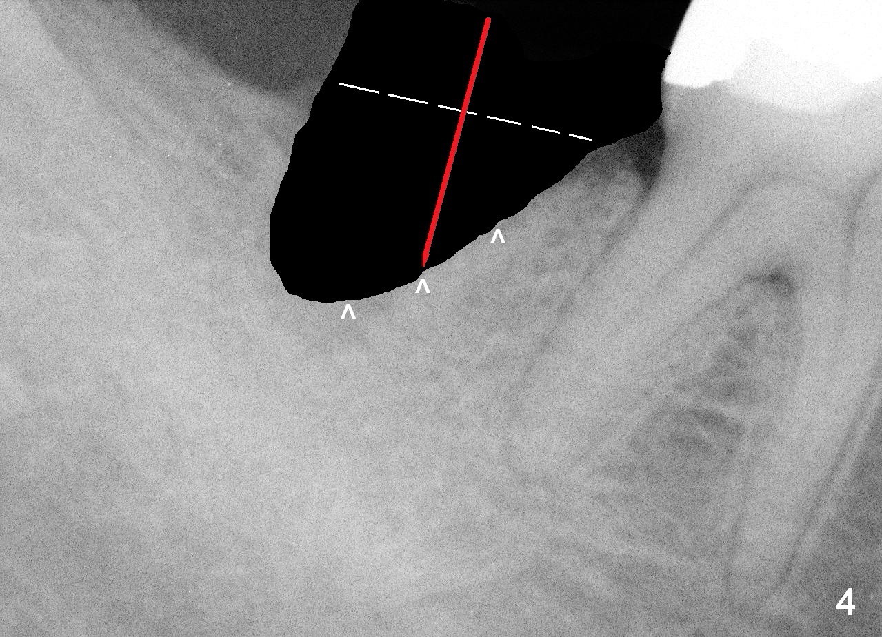 To correct this tendency, draw an imaginary line connecting the mesial and distal crests (Fig.4 white dashed line), bisect the imaginary line and initial osteotomy (red arrow) in the mesial slope of the socket (^). When a bone-level (Fig.5) or tissue-level (Fig.6) implant is placed, there is less chance of thread exposure mesiodistally. Bone graft (red circles) is placed to close the remaining socket gaps. If necessary, an incision is to be made to visualize exposed threads. Will this be done properly?