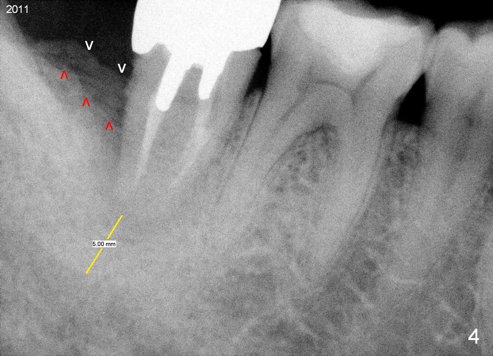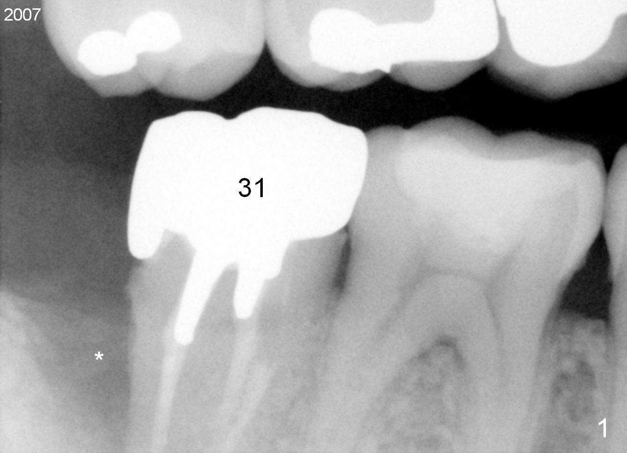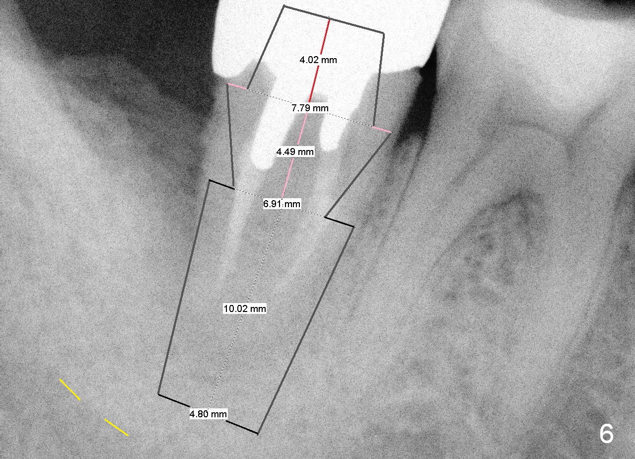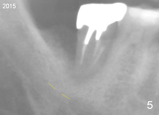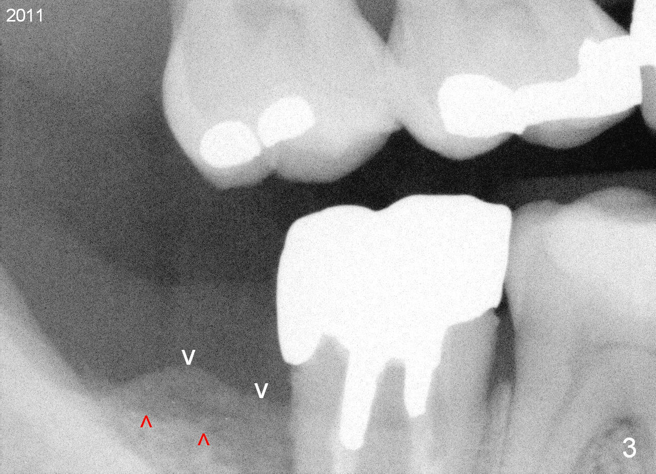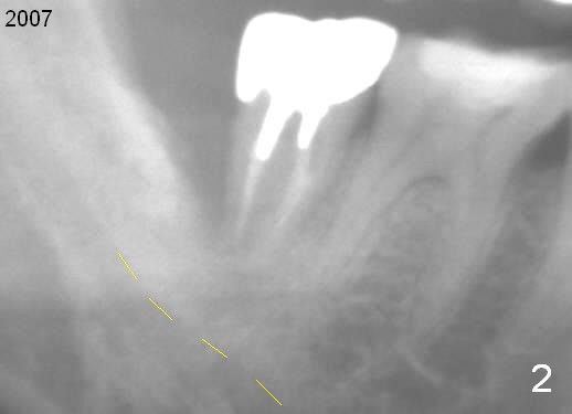 A 44-year-old man has had an asymptomatic distal defect of the tooth #31 for 8 years (Fig.1-5). Recently there is an acute episode of swelling and pain. A fistula develops mesiobucally. Panoramic X-ray films tend to show that the distal defect is deep (Fig.2,5; yellow dashed line: upper border of the Inferior Alveolar Canal). In addition, the distal defect may be not even buccolingually, as indicated by white and red arrowheads in Fig.3,4. Following placement of a 6.9x10 mm bone-level implant, a 7.8x4 (4.5) mm cemented abutment is inserted for try in (Fig.6). When it is fit, it is removed and a cover screw is temporarily placed. A piece of Osteotape (~10x4 mm) is placed distobuccally or distolingually (depending upon which wall is lower). A small amount of bone graft is packed between the most coronal portion of the implant and the Osteotape. The cover screw is then removed and the abutment is re-inserted and tightened by hand. An immediate provisional is fabricated with well-trimmed margin. Reline is done if necessary for securely holding bone graft in place. A new PA is to be taken prior to surgery to determine the extent of the lesion. Photos are taken to show the mesiobuccal fistula. Return to Lower Molar Immediate Implant Xin Wei, DDS, PhD, MS 1st edition 04/12/2015, last revision 05/25/2018