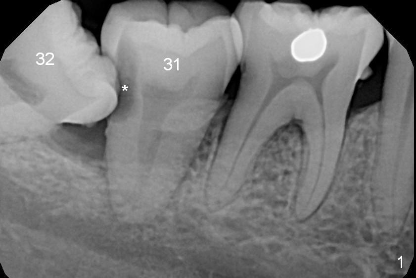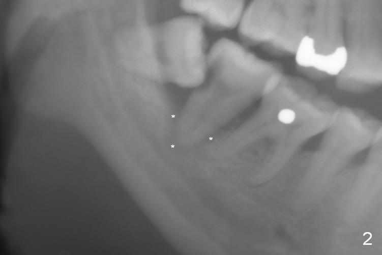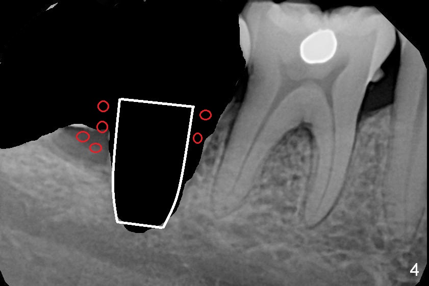 A 39-year-old woman has pain and mobility associated with the tooth #31 (Fig.1 (taken 5 months earlier), 2). It is easy to extract the mesioangularly impacted third molar (#32) after extraction of #31. After debridement and Clindamycin socket disinfection, collagen plug is placed in #32 socket, while allograft in the bottom half of the #31 one. The most coronal portion of the sockets are packed with mixture of collagen and Osteogen plugs and fixed in place with 4-0 Chromic gut (Fig.3). Two or 3 months postop, use #15 to start bone expansion at #31, followed by osteotomes or bone expanders and Tatum tapered taps. Take preop X-ray for depth measurement. The socket is close to the Inferior Alveolar Canal. In one word, no drill will be used for osteotomy. Place bone graft (Fig.4 red circles) prior to implant placement (white outline). Take CT post implant placement to confirm that the Inferior Alveolar Nerve is lingual to the implant.