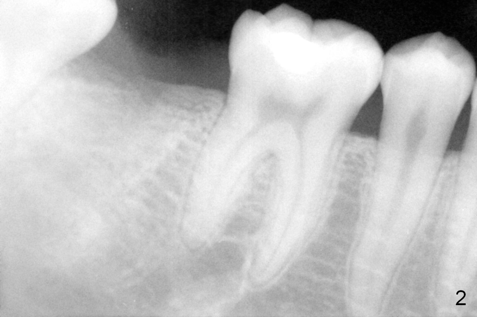 A 22-year-old man (HW) had #31 extracted without bone graft in other office 2 months ago. The socket appears to have healed asymptomatic. Pre-extraction panoramic X-ray shows periapical radiolucency (Fig.1 <). It is unknown that the lesion was eradicated during extraction or not. To reduce post-implant infection (1,2), oral antibiotic is to be taken preop and the osteotomy, once formed, will be treated with an antibiotic (Clindamycin or Metronidazole) or placebo (2% Xylocaine, 1:50,000 Epinephrine). If autogenous bone is harvested from the osteotomy, the bone will be mixed with an agent before placement. A case will be selected if extraction occurs less than 6 months. The 1st case is assigned to Clindamycin group, the present case to Metronidazole, the next to control as shown below.