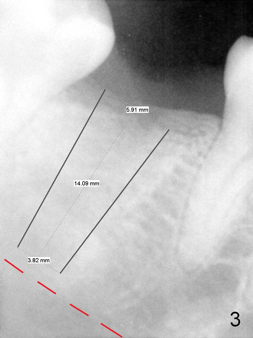 PA in Fig.2 is taken 2 months post extraction, while Fig.3 shows design of a 5.9x14 mm bone-level implant. It appears that the implant is a little too long (red dashed line: the superior border of the Inferior Alveolar Canal). Initial osteotomy depth will be 12 mm. In fact the implant was designed to be supracrestal distal (mistake, even if bone graft is well executed). An incision will be made for visibility.
