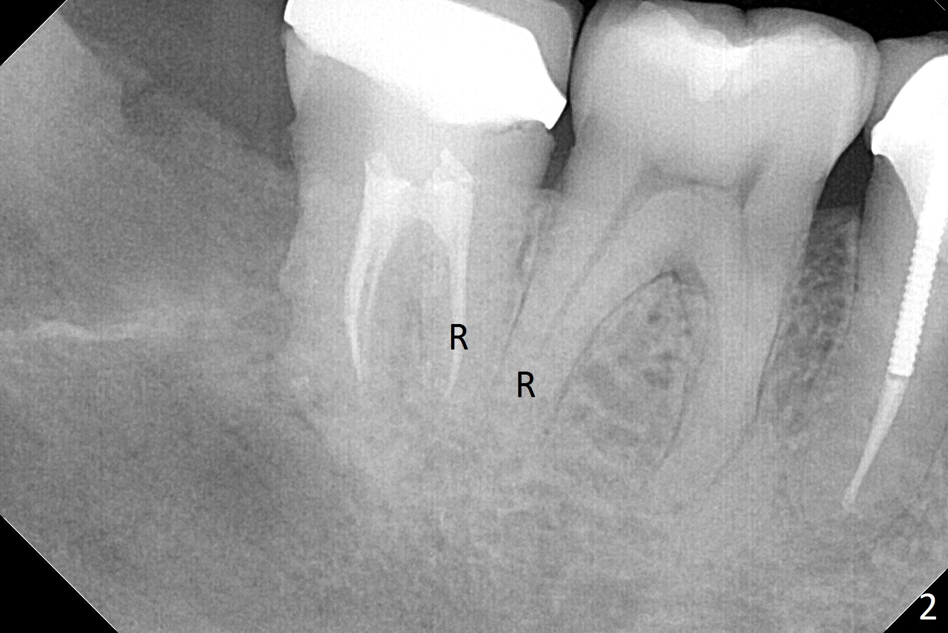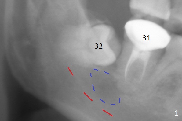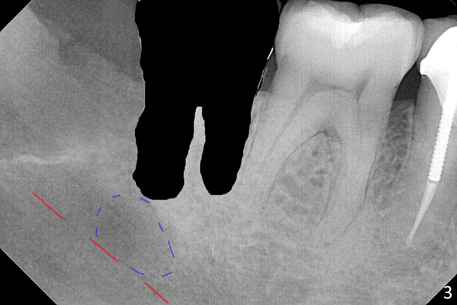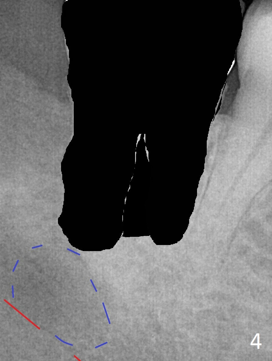 A 45-year-old woman presents to clinic with swelling and pain from the lower right posterior region. The tooth #32 is fully bony impacted. The distolingual gingiva of #31 is erythematous with deep pocket. The tooth is sensitive to percussion. Preop panoramic X-ray shows a radiolucent lesion between #31 and #32 (Fig.1 blue dashed line). Initial impression is infection from #32. Extraction of the latter turns out to be difficult. Purulent discharge is coming from underneath the coronal portion of the tooth. Curettage of the radiolucent lesion leads to hemorrhage. The curettage is not aggressive because of the underlying Inferior Alveolar Canal (red dashed line). Following copious irrigation, a 10x20 mm Osteogen plug is inserted into the socket with incision closure. Postop PA reveals that the roots the teeth #31 and 30 approximate to each other (Fig.2 R). In case the tooth #31 needs to be removed (Fig.3 black area), osteotomy for immediate implant will be established in the middle of the septal stump (Fig.5 red arrow) after removal of the coronal septum (Fig.4). CBCT may be necessary for determination of the osteotomy depth.