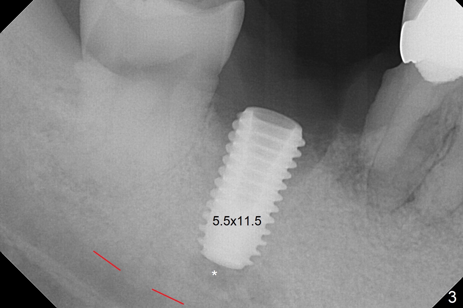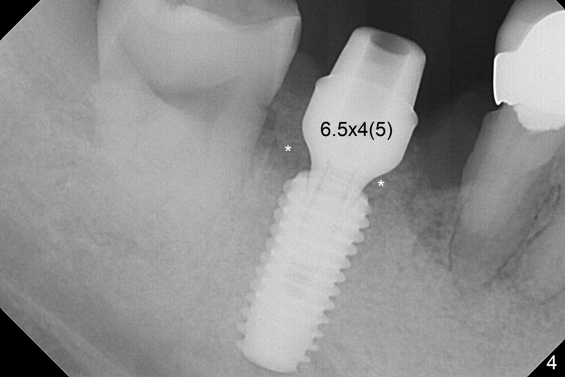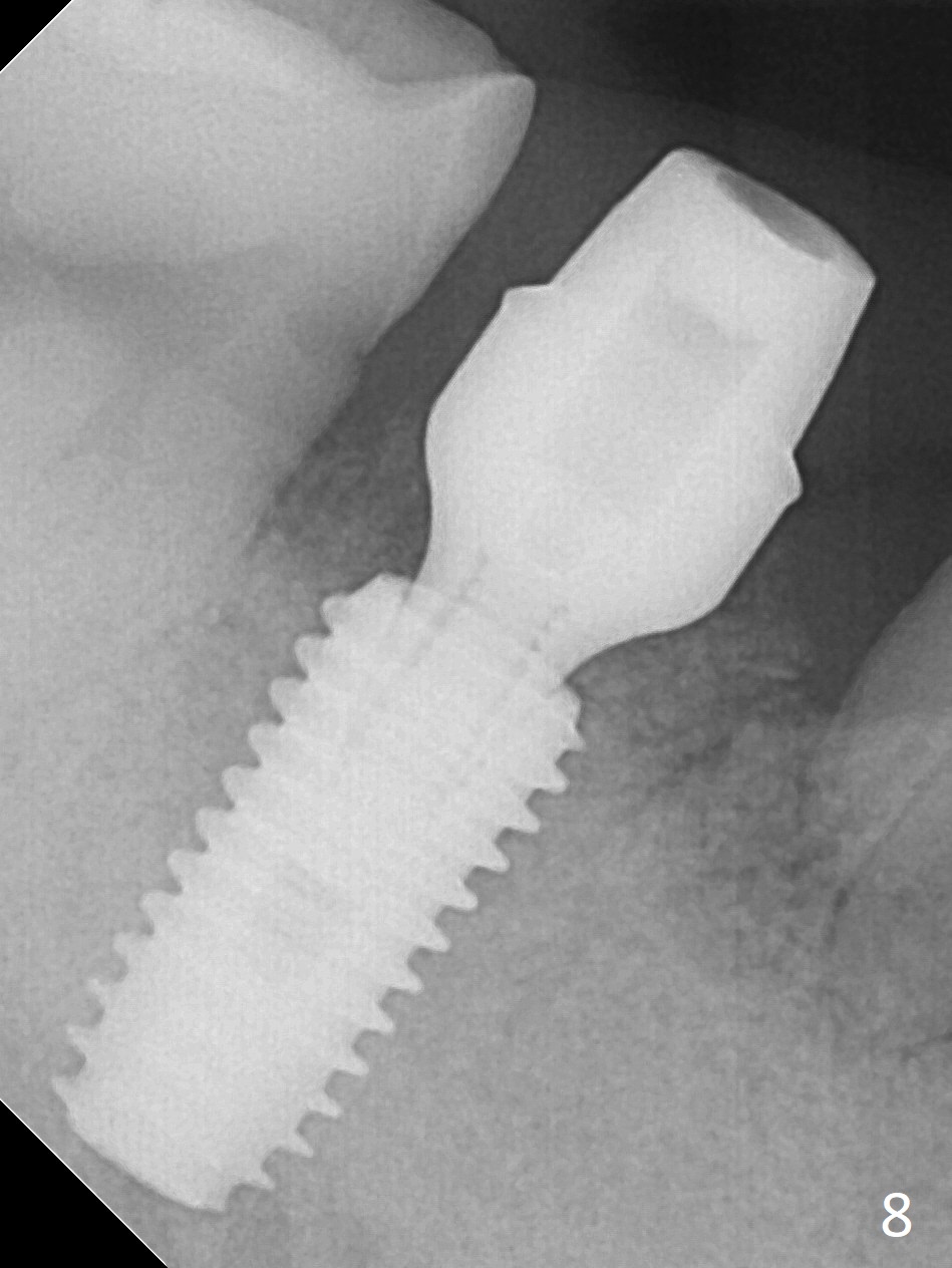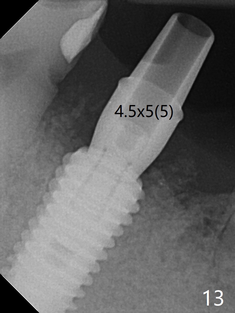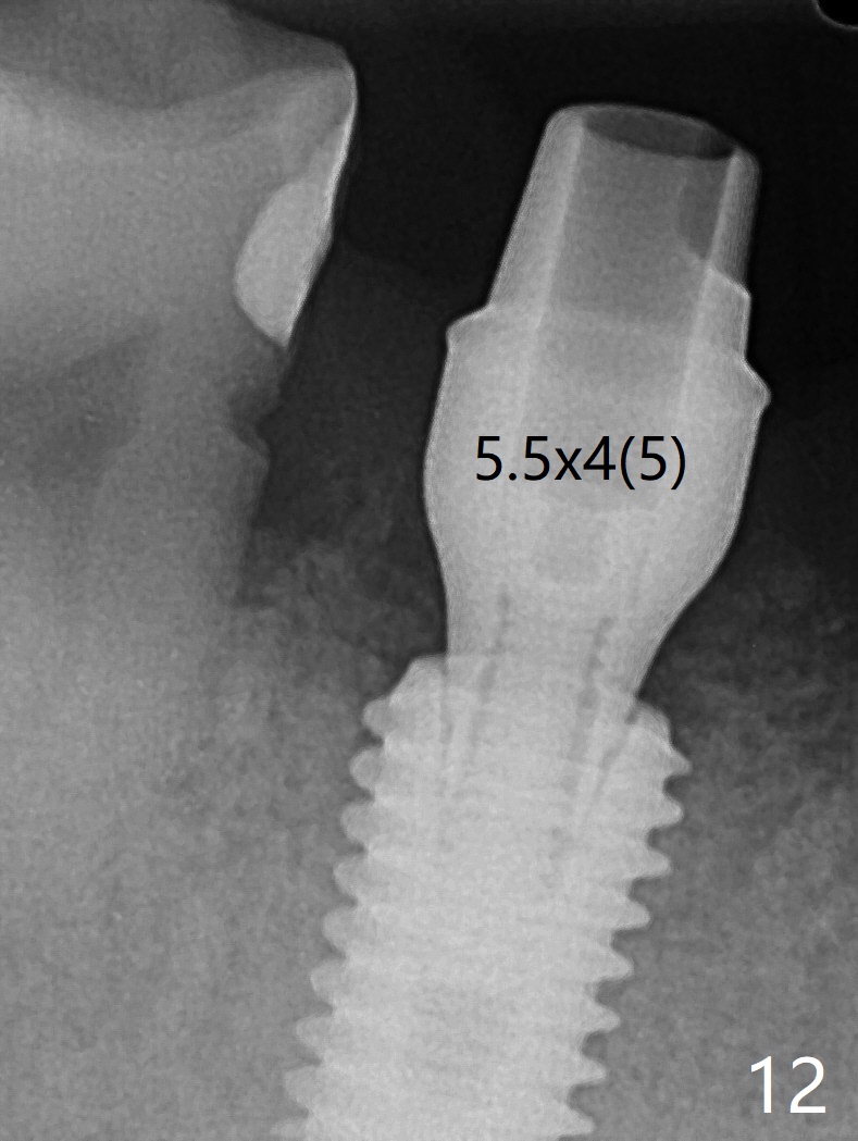 Although the tooth #30 has distobuccal root exposure (Fig.1 <), it is asymptomatic. In contrast the tooth #31 with the distoocclusal caries (*) is symptomatic. After use of 2 mm drill for 18 mm (lingual gingival margin), a calculated parallel pin is inserted (Fig.2 (D: 2 distal roots of the tooth #30)). It appears that a 11.5 mm long implant is appropriate for the site; a 5 mm cuff is expected. Following 4.8 mm drill, a 5.5x11.5 mm implant is placed initially (Fig.3) with an apical space (*) and clearance from the Inferior Alveolar Canal (red dashed line). The implant is placed deeper with placement of a 6.5x4(5) mm abutment and bone graft (*, Fig.4,5). After placement of collagen membrane over the graft, an immediate provisional is fabricated (Fig.6 P) with clearance from the opposing tooth (Fig.7 *). There is no bone loss 3.5 months postop (Fig.8). In fact the abutment has not been seated completely since its placement (Fig.4,5,8). The crown/abutment dislodges 3 years 3 months post cementation (Fig.9). The latter occurs for long incubation time because of opposing partial denture (Fig.10). After trimming proximal surfaces (Fig.11: arrowheads), the abutment remains incompletely seated (Fig.11) due to possible crestal bone interference (Fig.11 *). The smaller abutment by itself remains unseated (Fgi.12). One size small one is completely seated (Fig.13). Impression is taken. Two weeks later the abutment margin is supragingival. After screw torque at 20 Ncm, the crown is cemented with access hole. Excess cement is removed.