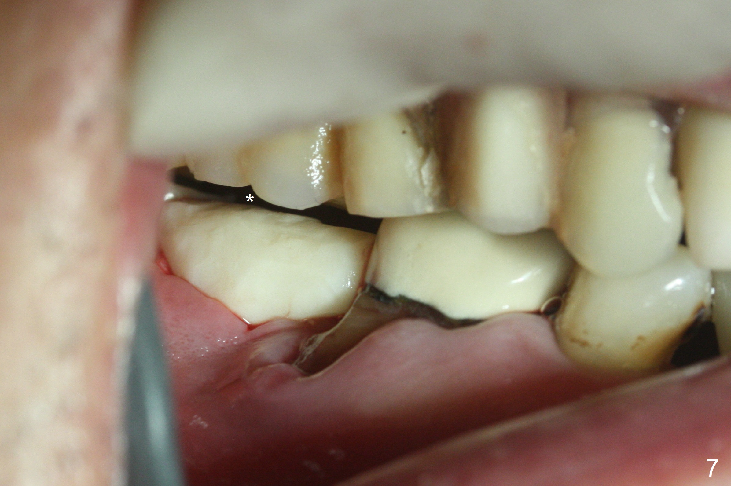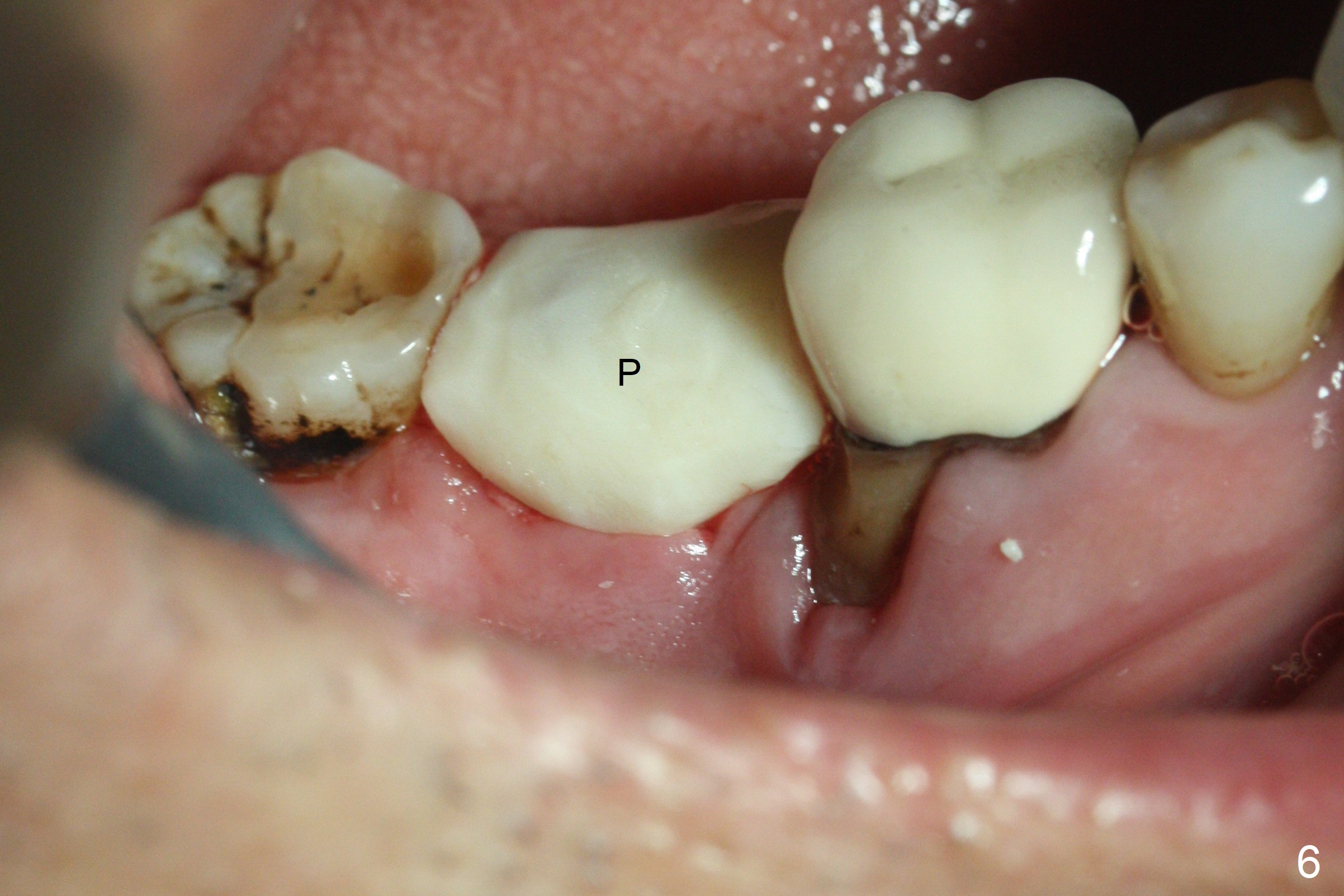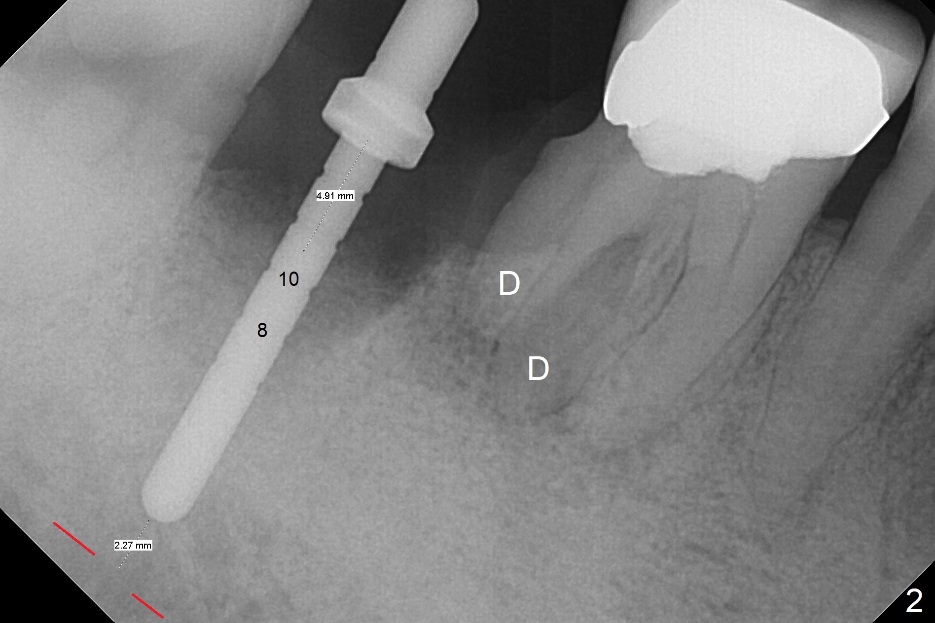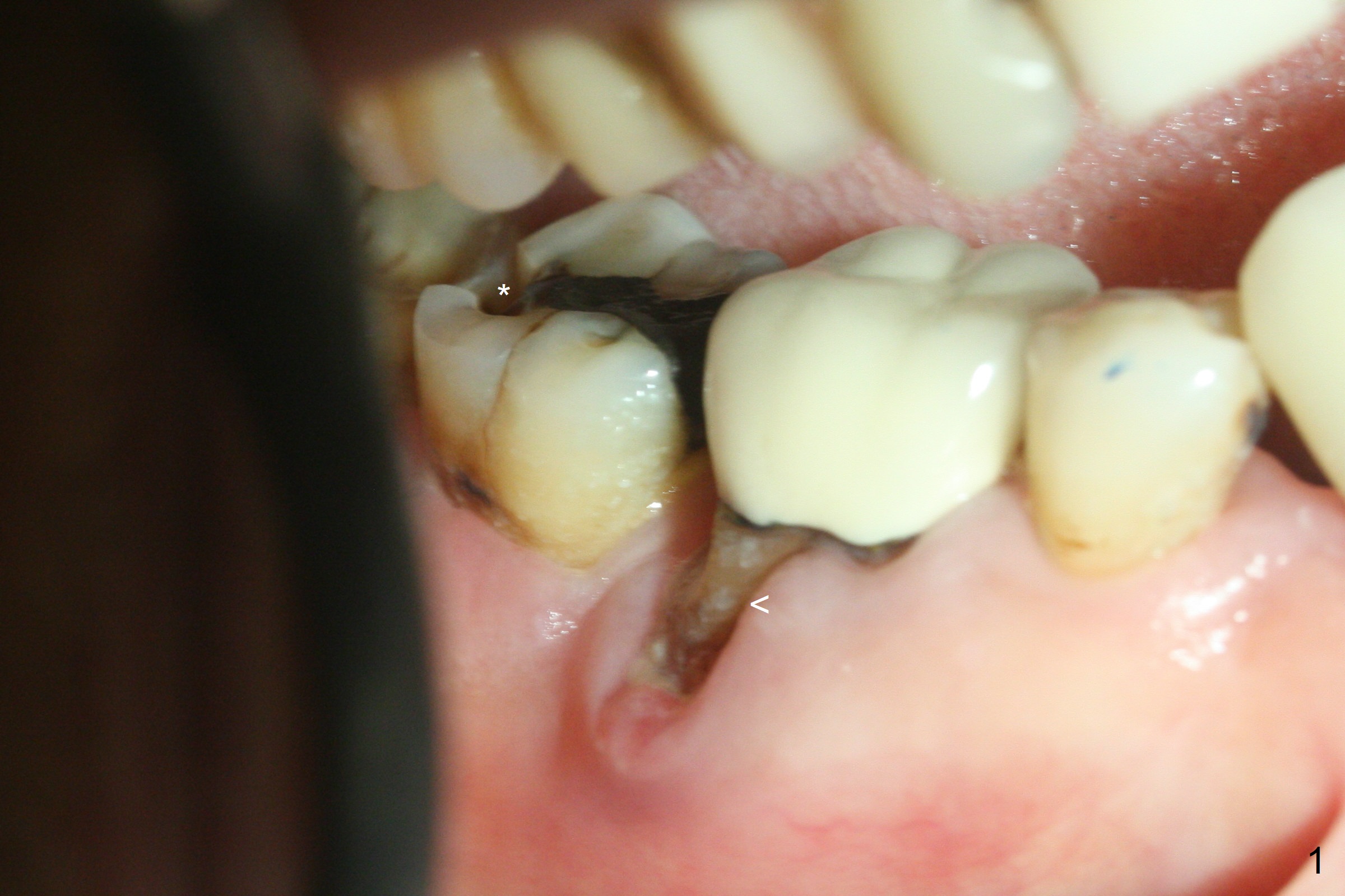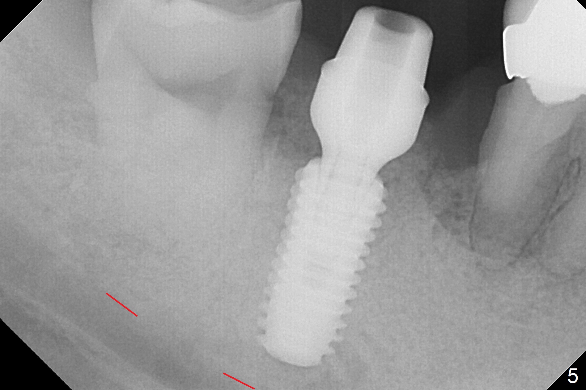 Although the tooth #30 has distobuccal root exposure (Fig.1 <), it is asymptomatic. In contrast the tooth #31 with the distoocclusal caries (*) is symptomatic. After use of 2 mm drill for 18 mm (lingual gingival margin), a calculated parallel pin is inserted (Fig.2 (D: 2 distal roots of the tooth #30)). It appears that a 11.5 mm long implant is appropriate for the site; a 5 mm cuff is expected. Following 4.8 mm drill, a 5.5x11.5 mm implant is placed initially (Fig.3) with an apical space (*) and clearance from the Inferior Alveolar Canal (red dashed line). The implant is placed deeper with placement of a 6.5x4(5) mm abutment and bone graft (*, Fig.4,5). After placement of collagen membrane over the graft, an immediate provisional is fabricated (Fig.6 P) with clearance from the opposing tooth (Fig.7 *). There is no bone loss 3.5 months postop (Fig.8). In fact the abutment has not been seated completely since its placement (Fig.4,5,8). The crown/abutment dislodges 3 years 3 months post cementation (Fig.9). The latter occurs for long incubation time because of opposing partial denture (Fig.10). After trimming proximal surfaces (Fig.11: arrowheads), the abutment remains incompletely seated (Fig.11) due to possible crestal bone interference (Fig.11 *). The smaller abutment by itself remains unseated (Fgi.12). One size small one is completely seated (Fig.13). Impression is taken. Two weeks later the abutment margin is supragingival. After screw torque at 20 Ncm, the crown is cemented with access hole. Excess cement is removed.
