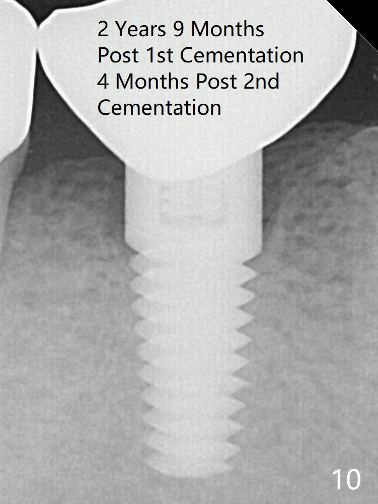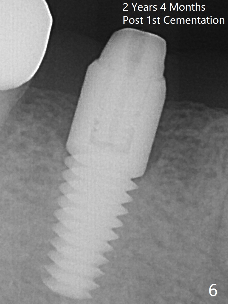 The crown over the implant has dislodged 3 times over 28 months post cementation (Fig.6). It appears that the top of the abutment is too rounded. Bone density seems to remain the same after cementation of a new crown (Fig.7).