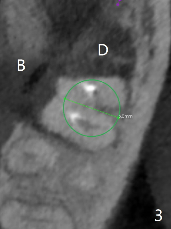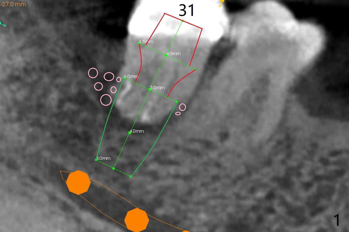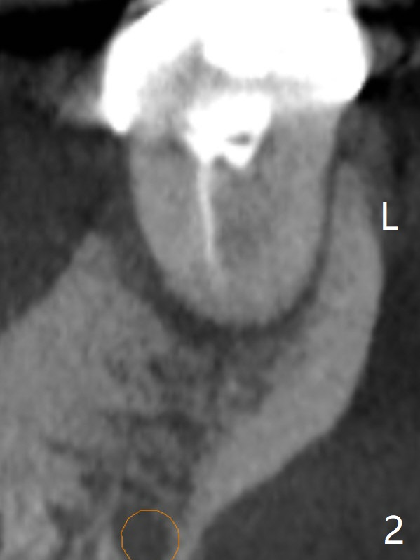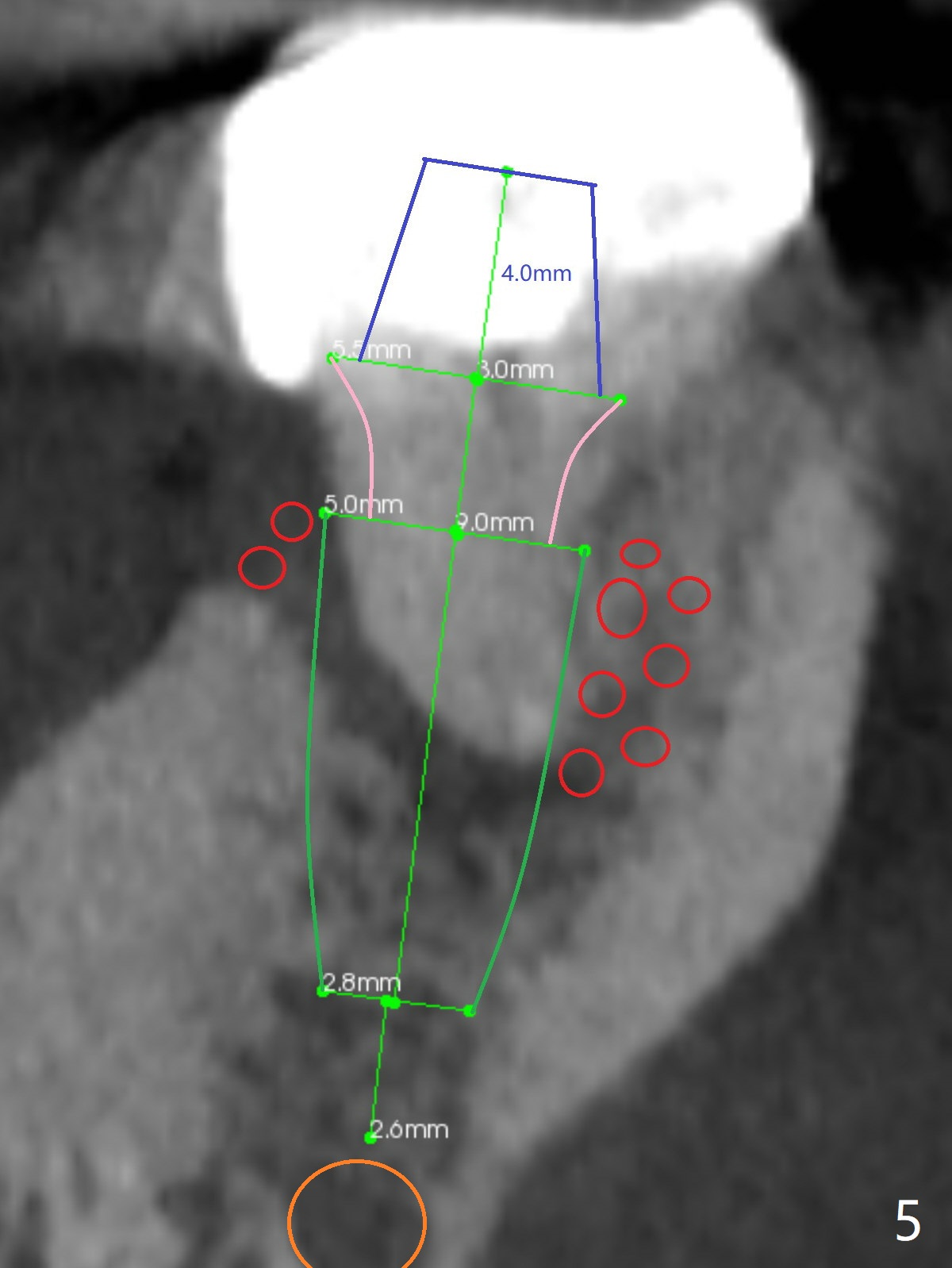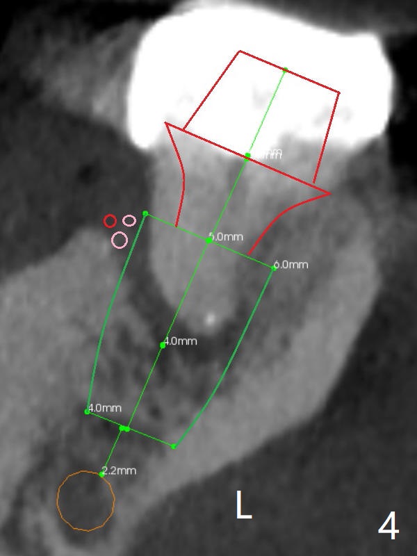 A 53-year-old man will return for #18 extraction and implant because of endo failure after the same treatment at #14 (Fig.1). It appears that the mesiolingual canal is missing for RCT (Fig.2 (coronal section at the mesial root)). Bony defect is buccodistal; try to place an implant as mesiolingual as possible (Fig.3 (axial section)). To reduce lingual (L) plate perforation and neuropathy (orange), the implant is expected to be 5-6x9 mm (Fig.4,5). Use 4 mm stopper from DIO Sinus Kit for osteotomy (Fig.1,4,5). If his vein is prominent, prepare PRF 1-2 tubes.