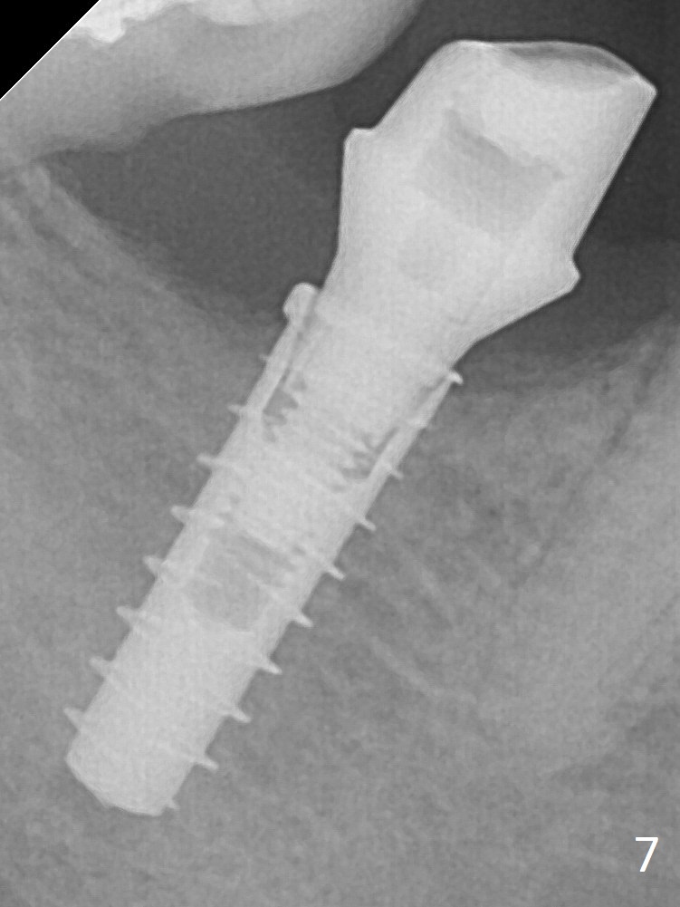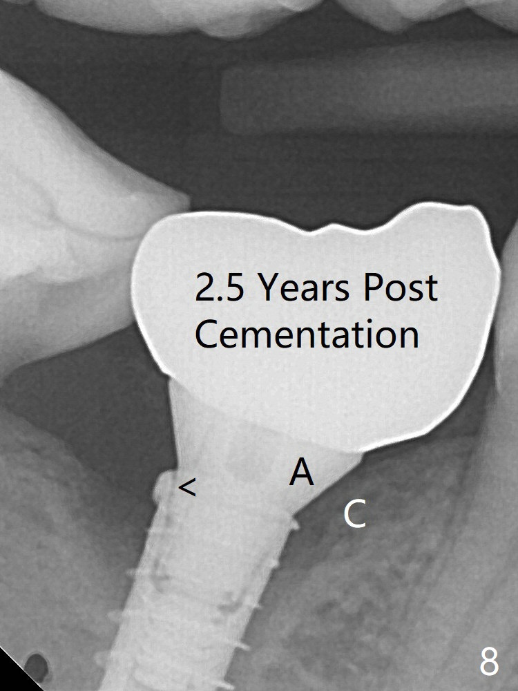The crown/abutment is loose 2.5 years post cementation due to incomplete abutment seating (Fig.8 < (no clearance between the abutment (A) and the mesial crest (C))). In fact the abutment has been incompletely seated since day one (Fig.5) and remains so 4 months postop (Fig.7). A 6x3 mm healing abutment is placed. When the patient returns, try in the smallest abutment with 2 mm cuff in the Planning Kit and place probably a 4x4(3) mm pair abutment from 5x4(2) mm existing one. Torque and take PA with sensor 1 to confirm seating before impression. Or use 5.5 mm profile drill before reseating the crown/abutment.
