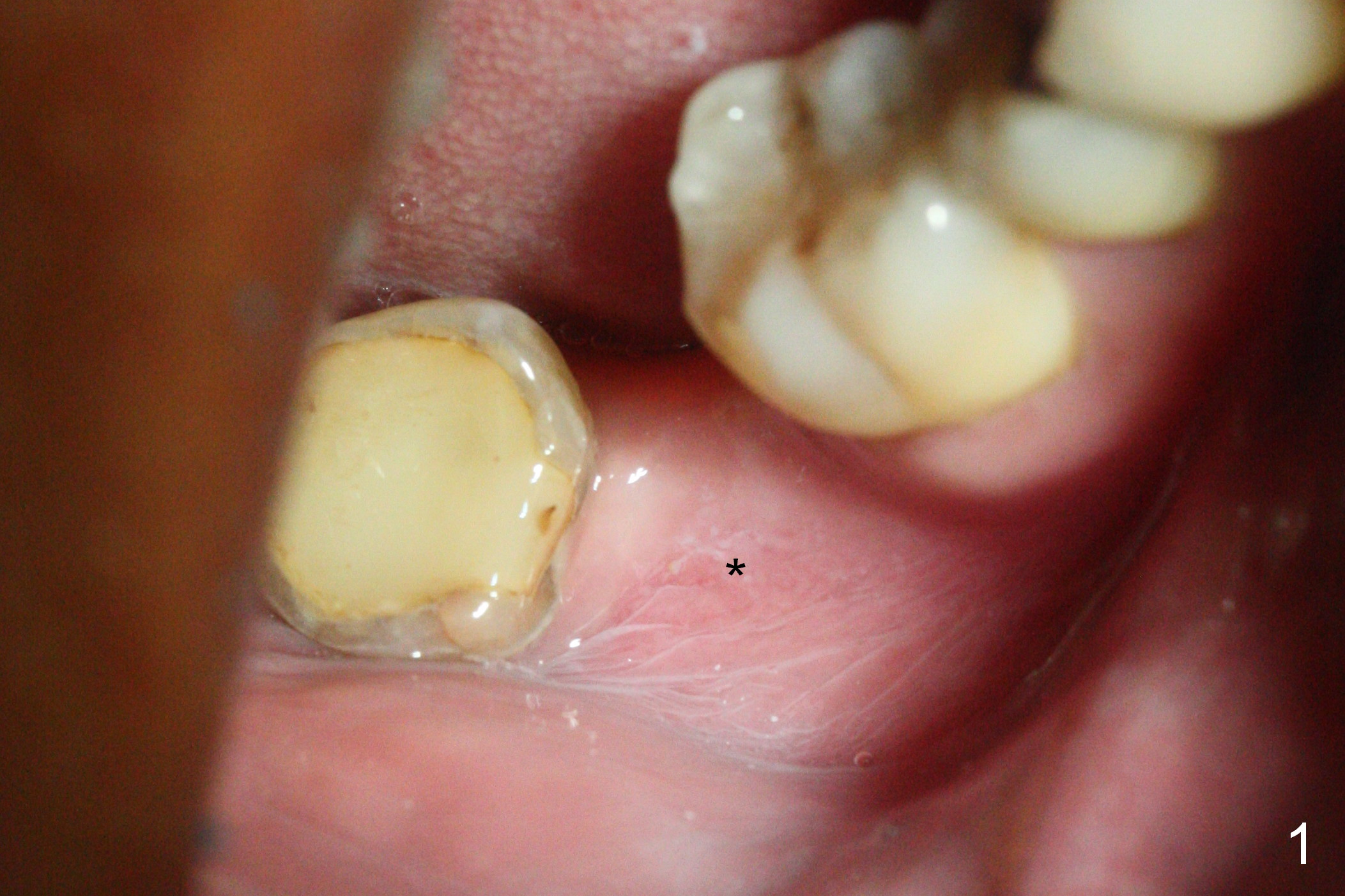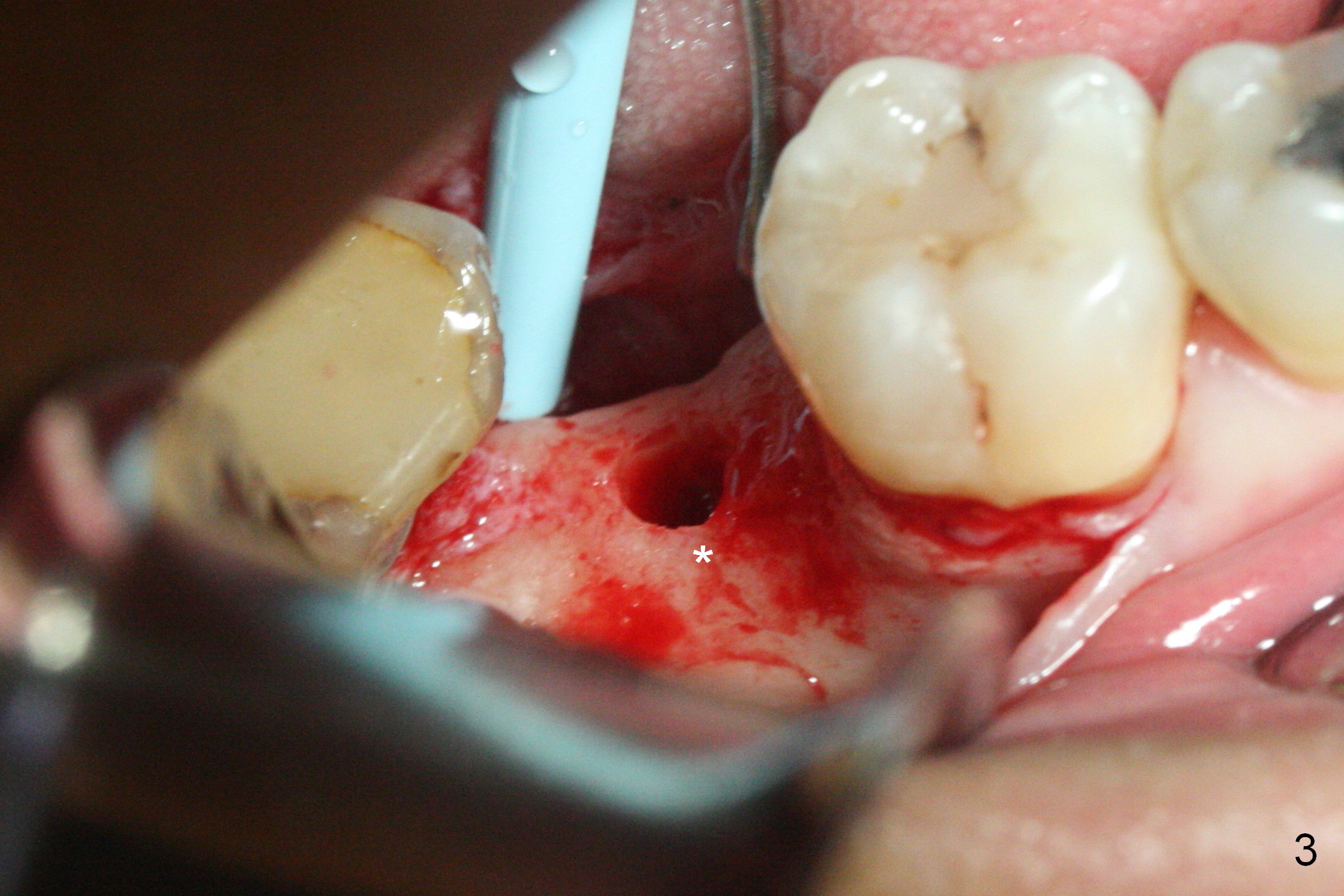 The ridge at #31 is also narrow buccolingually (Fig.1 *). After incision and 1.6 mm pilot drill, a guide pin with 7 mm length is inserted to confirm trajectory and depth; it appears that 11 mm osteotomy has enough clearance from the superior border of the Inferior Alveolar Canal (IAC, Fig.2 red dashed line). Following Marking Bur, 3.3 mm Magic Drill and final drill, the buccal plate seems to be thin (Fig.3 *). When a 4x11 mm IBS implant and 5x4(2) mm pair abutment are placed, the distal thread is exposed (Fig.4 >), the abutment contacts the opposing tooth (data not shown) and there is 2.7 mm clearance from IAC. After increasing the osteotomy 1-2 mm, the implant is placed deeper; the autogenous bone with Osteogen is placed around the plateau of the implant (Fig.5 >), particularly buccally, followed by collagen membrane. When sutures are placed around the abutment, the buccal ridge looks bulkier (Fig.6) than preop (Fig.1). It may remains so long term. The flap surgery makes it possible for simultaneous GBR and reduction in possibility of peri-implantitis. Last, periodontal dressing is applied.