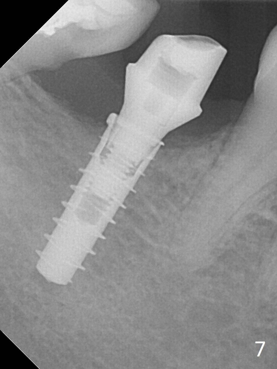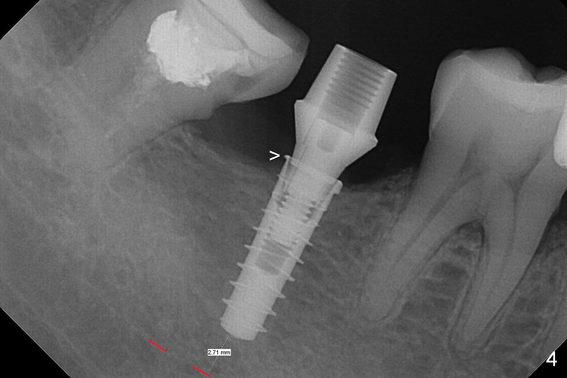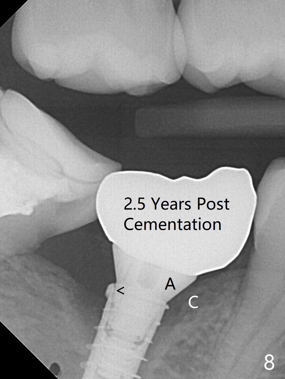 There is no apparent bone loss 4 months postop (Fig.7), related to the advantage of the narrow implant (less traumatic). The crown/abutment is loose 2.5 years post cementation due to incomplete abutment seating (Fig.8 < (no clearance between the abutment (A) and the mesial crest (C))). A 6x3 mm healing abutment is placed. When the patient returns, try in the smallest abutment with 2 mm cuff in the Planning Kit and place probably a 4x4(3) mm pair abutment from 5x4(2) mm existing one. Torque and take PA with sensor 1 to confirm seating before impression. Or use 5.5 mm profile drill before reseating the crown/abutment.