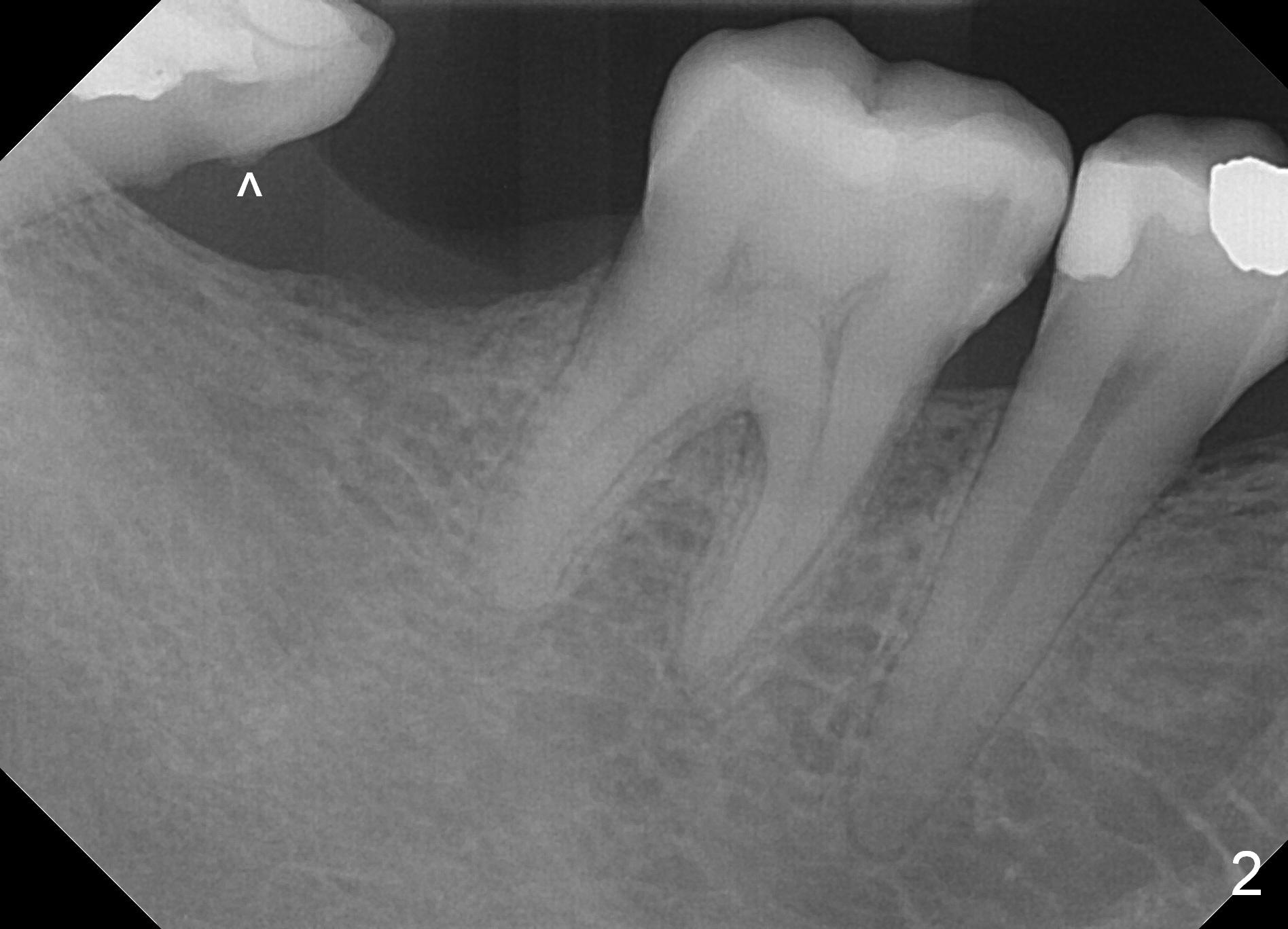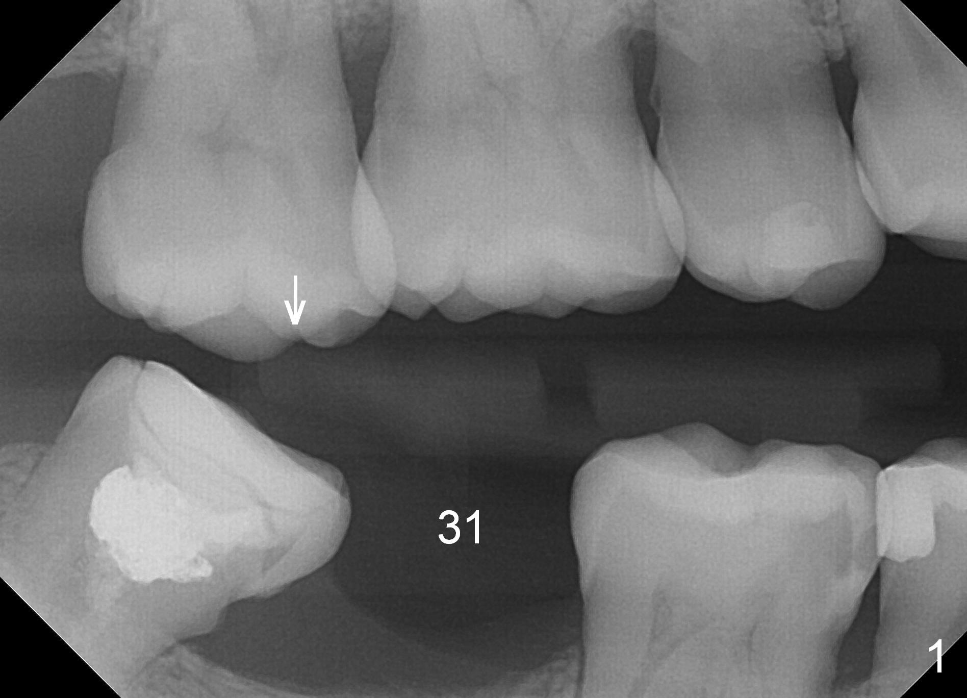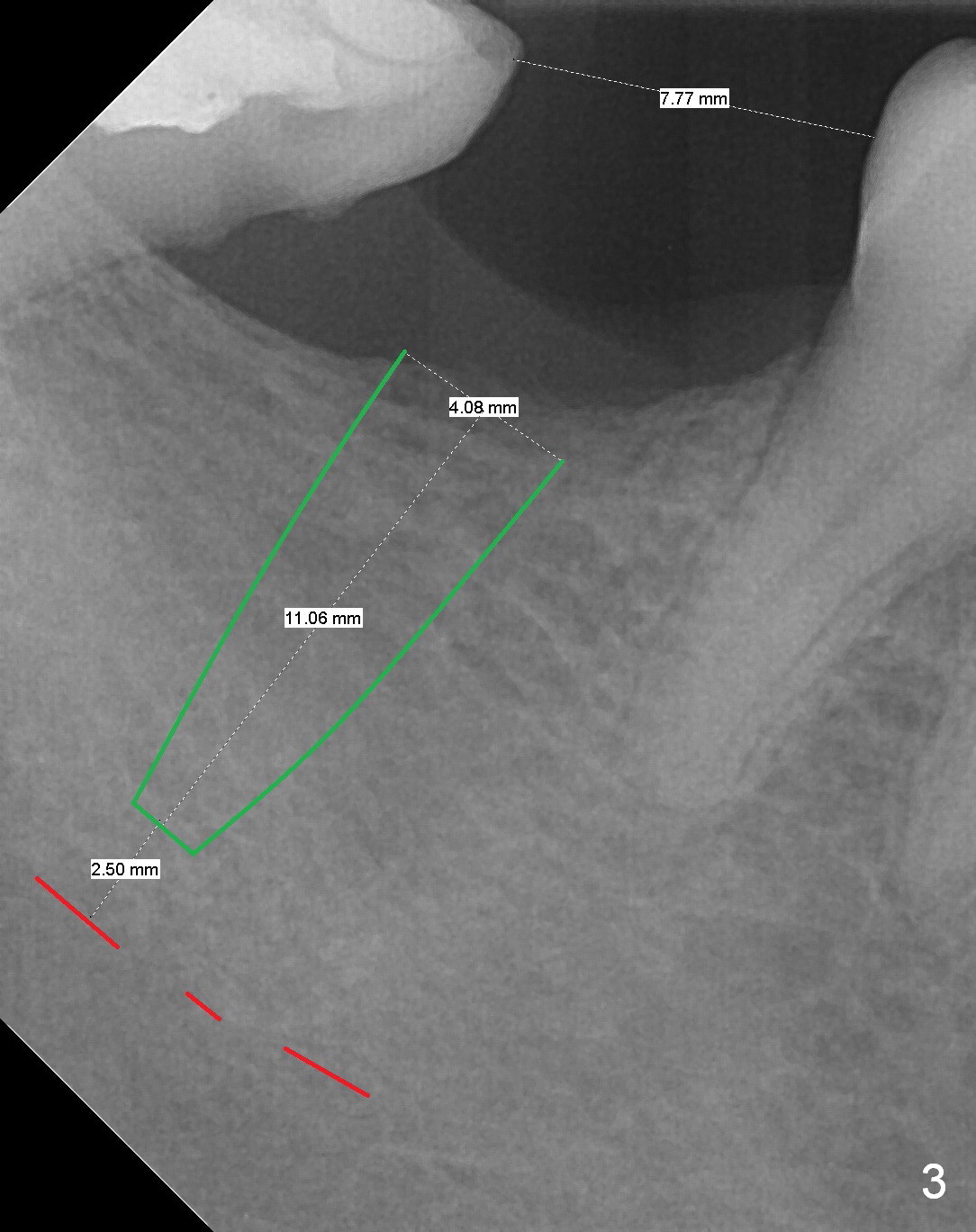 A 39-year-old man presents to office for #19/20 composite redo. After discussion he agrees to restore #31 with implant (Fig.1-3). He worries about bone loss (buccolingually) because of 8-year loss of the tooth. Fortunately the mesiodistal space is less than 8 mm (Fig.3). A 4 mm IBS implant (Titanium V (Bicon as well) stronger (not easily break) than Titatium IV (Tatum, DIO)) should be able to sustain mastication if the tooth #32 is not extracted. After local anesthesia, remove calculus in the mesial surface of #32 (Fig.2 ^). Also prepare for MO composite at #30.