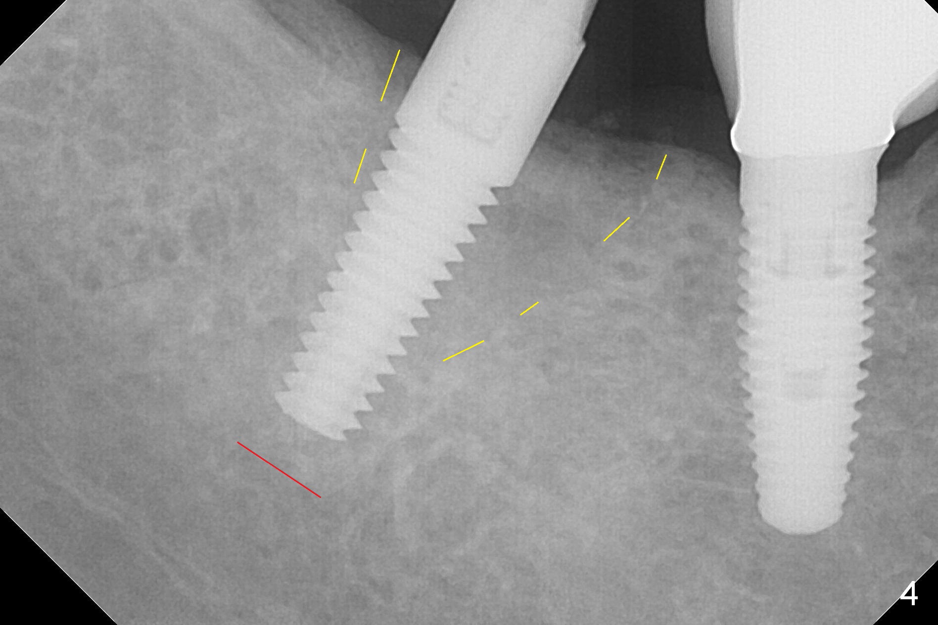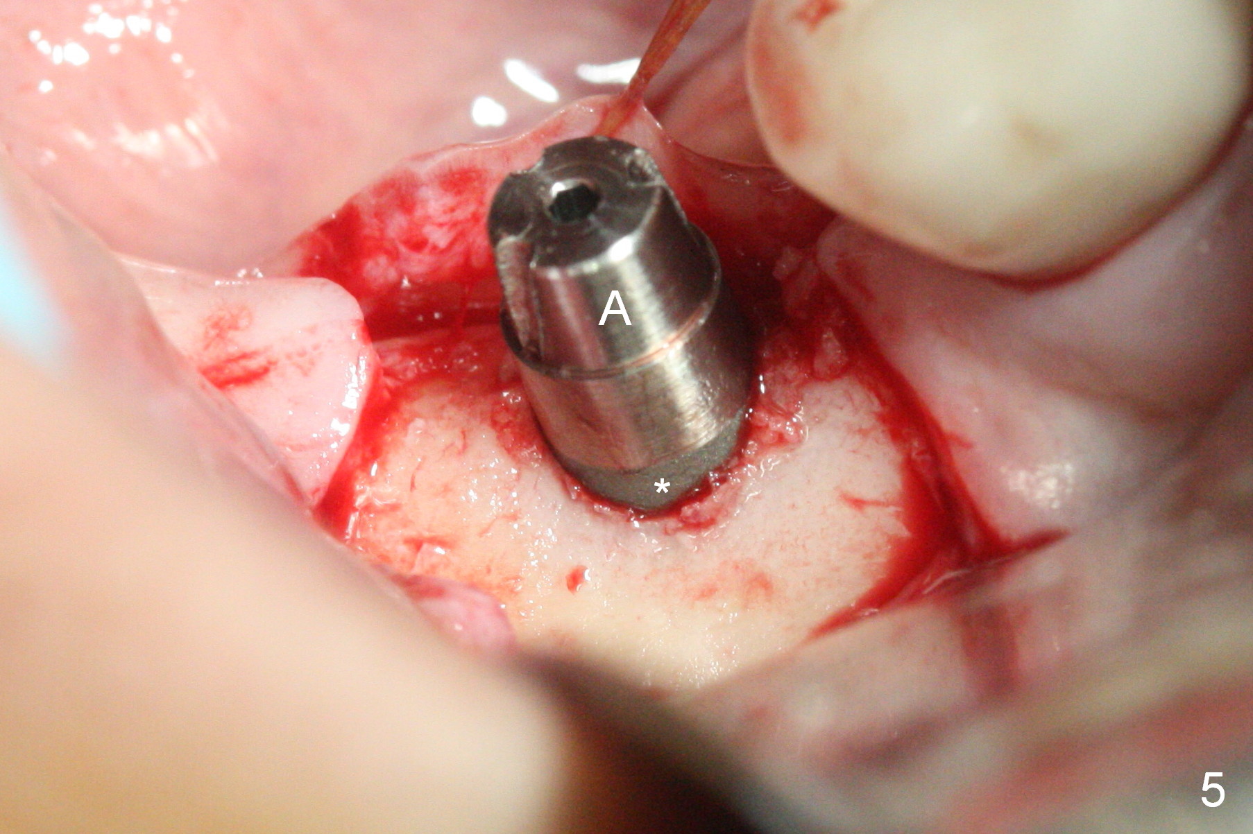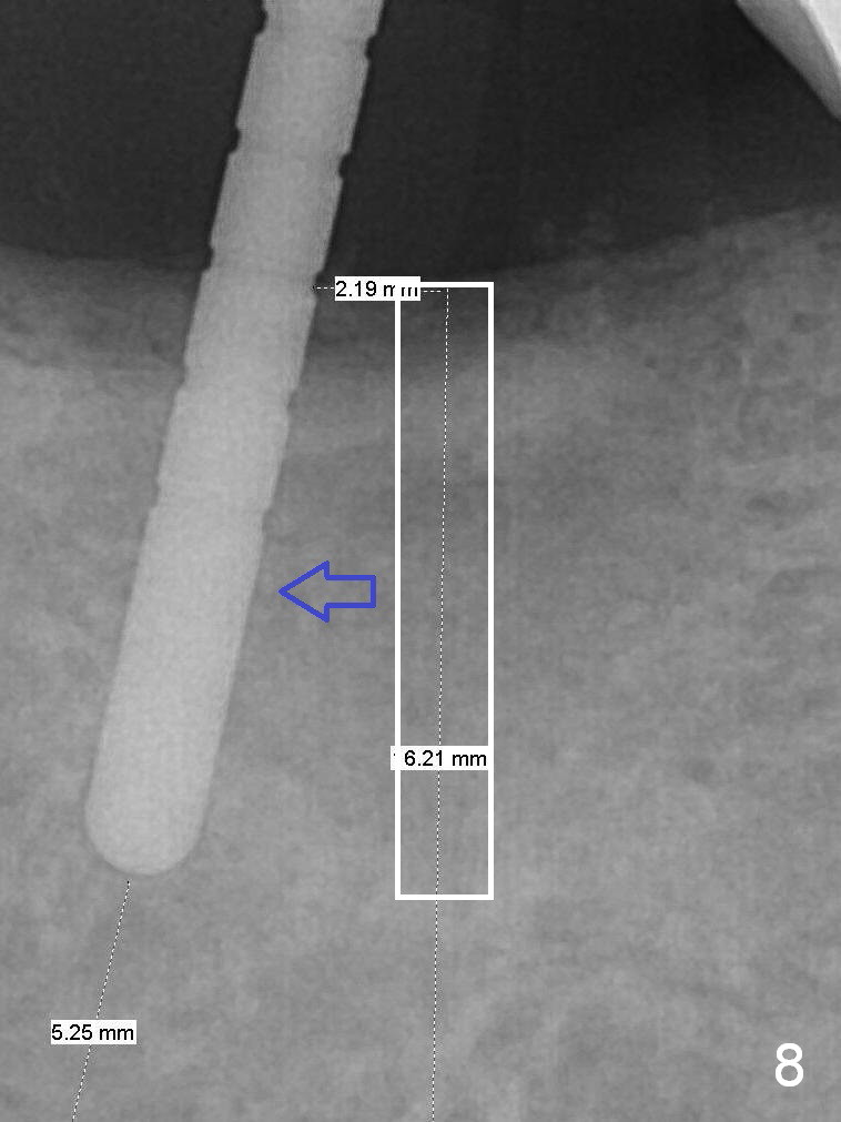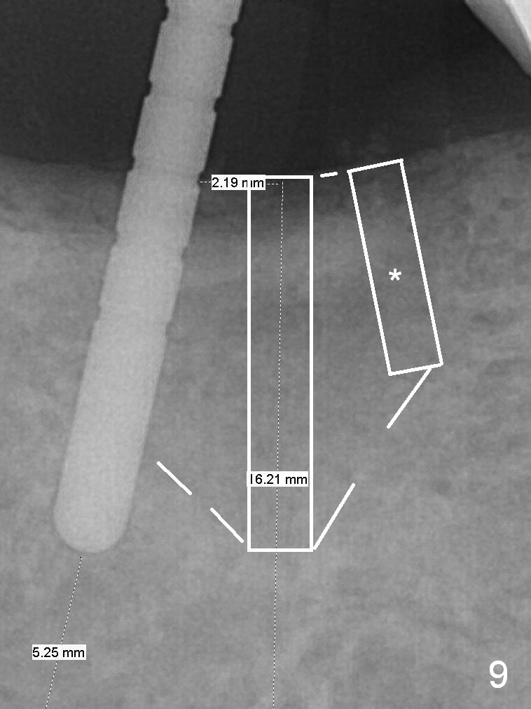 Initial osteotomy at the site of #31 using 2 mm pilot drill for 11 mm appears to be distal by 2-3 mm (Fig.1, Fig.10 A (circle, occlusal view of the edentulous and dentate (#29 and 30) areas)). Lindamann bur is used to move the osteotomy (Fig.8 white rectangle, Fig.10 B). It seems that the osteotomy returns distal as the osteotomy increases (Fig.2 (5x17 mm tap), Fig.8 arrow, Fig.10 C (green circle)). It appears to be late to change; a 5x17 mm tissue-level implant is placed with > 60 Ncm (Fig.3-5). The buccal and lingual rough surface of the implant (Fig.5 *) is covered by autogenous bone/Osteogen and Collagen Dressing (Fig.6 *). After suturing (Fig.7), periodontal dressing is applied around the abutment (Fig.5 A (4.5x3 mm)).