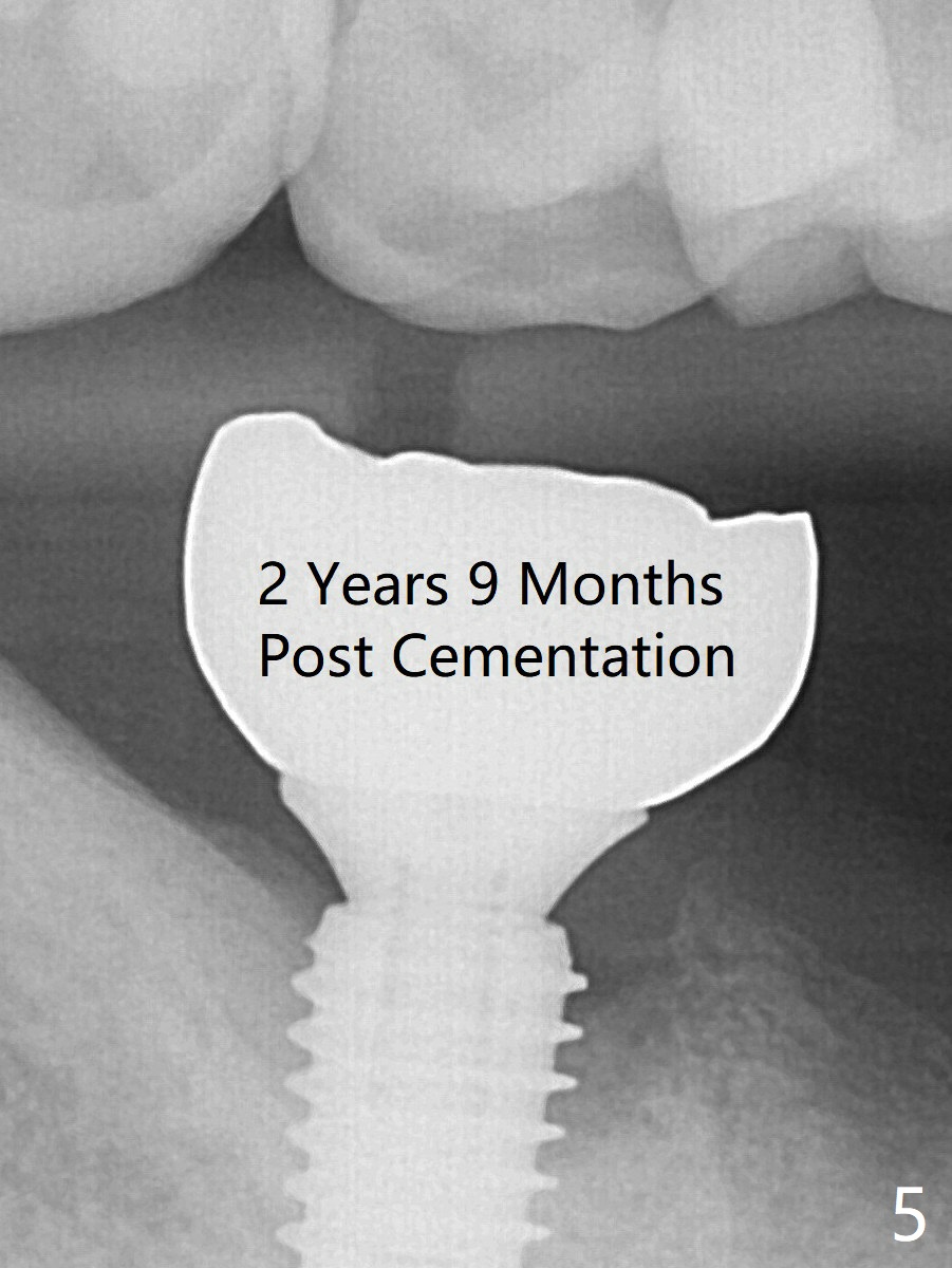 The last two drills for sequential osteotomy are 4.3x13 and 4.8x11.5 mm. A 5x11.5 mm UF implant is placed slightly subcrestal with insertion torque > 50 Ncm (Fig.2). Following placement of 6.5x2 mm healing abutment, the opposing tooth needs adjustment for height. Orthodontic intrusion of the opposing tooth is scheduled 2 days later. It is accidental to find root fracture of the mesial root of the tooth #30 (Fig.1 <). There is minimal bone resorption coronally 5 months postop (Fig.3). A provisional is fabricated at #31 to assist in intrusion of the tooth #2. The tooth #30 is lost during the pandemic, followed by looseness of the crown and abutment at #31. When the complex is reseated, the occlusal scheme is changed, suggesting incomplete seat of the abutment earlier (Fig.5).