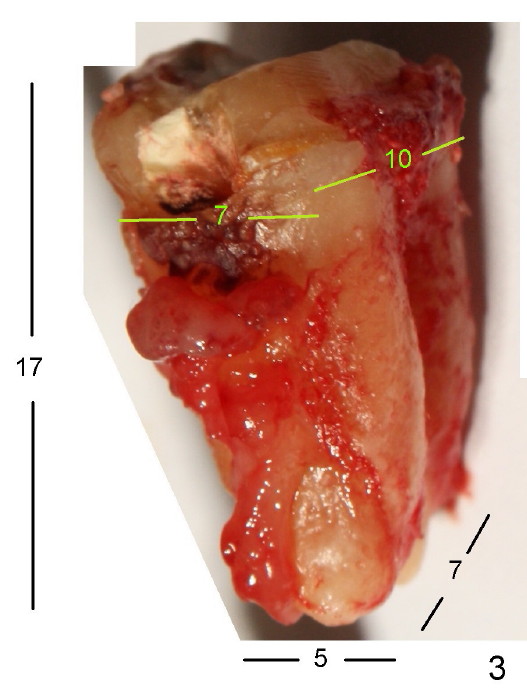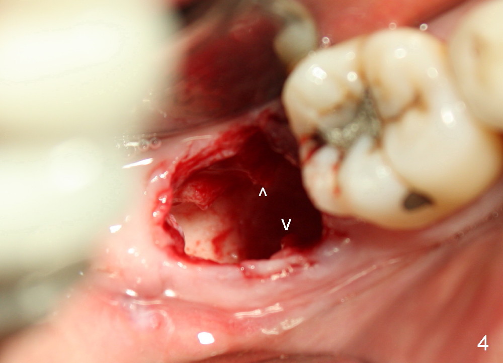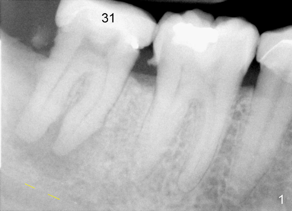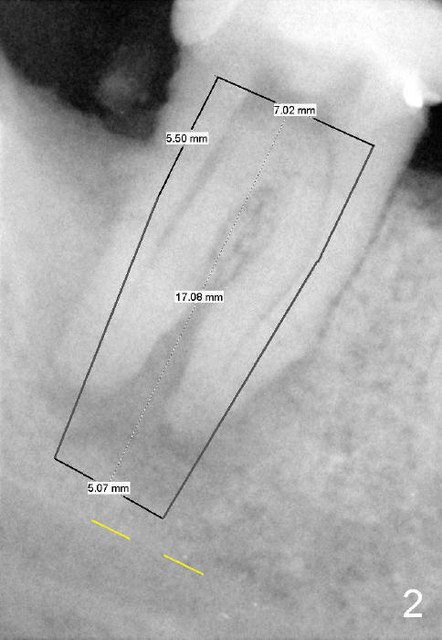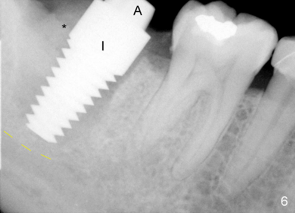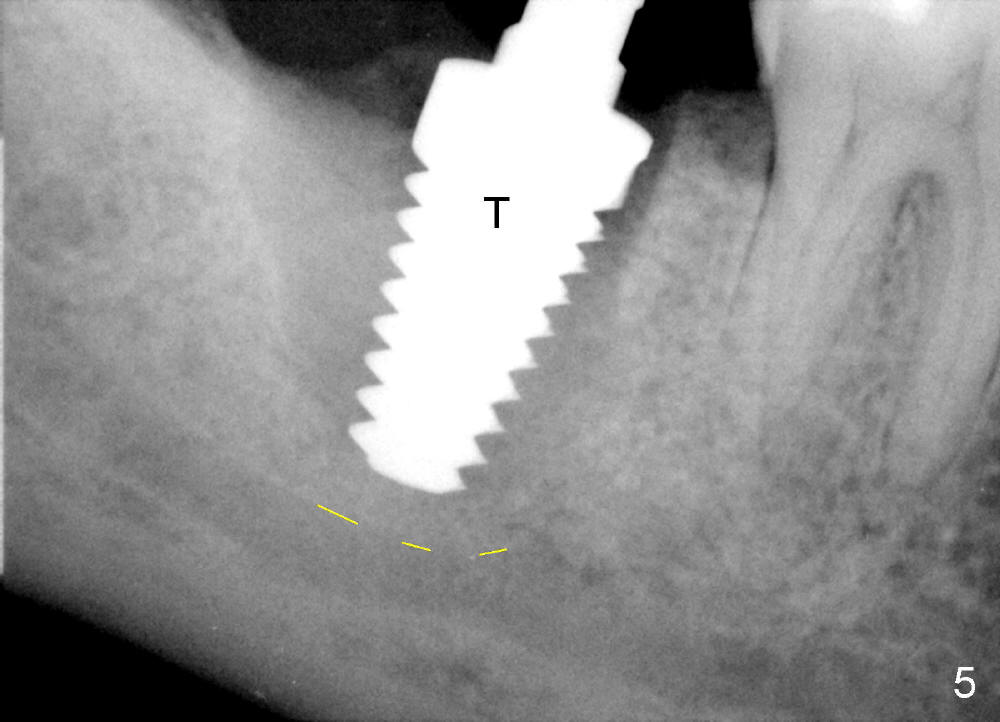 The tooth #31 of a 38-year-old lady has endo perio disease (Fig.1). Due to the large periapical lesion, there will be no solid (new) bone available for primary stability of an immediate implant (Fig.2: 7x17 mm). Yellow dashed line represents the upper border of the Inferior Alveolar Canal (IAC). Infiltration anesthesia is administered first. The mesiodistal widths of the root of the extracted tooth are 10 and 7 mm at the coronal and apical ends, respectively; the buccolingual ones 7 and 5 mm; the length 17 mm (Fig.3). The socket appears much larger than the root (Fig.4). To prevent paresthesia, no drills are used. Instead, a series of tap drills (6,7,8x17 mm) are sequentially inserted into the socket. The largest tap (Fig.5 T; 8x17 mm) binds to the socket securely with separation from IAC. Block anesthesia has to be administered before removal of the tap. A tapered implant (8x17 mm) is placed with insertion torque greater than 60 Ncm (Fig.6 I); allograft mixed with Osteogen is placed around the implant (*). Collagen dressing covers the opening of the remaining socket. The wound is protected with perio dressing, which is partially secured by an abutment (A in Fig.6). No paresthesia is reported by the patient a few hours postop.