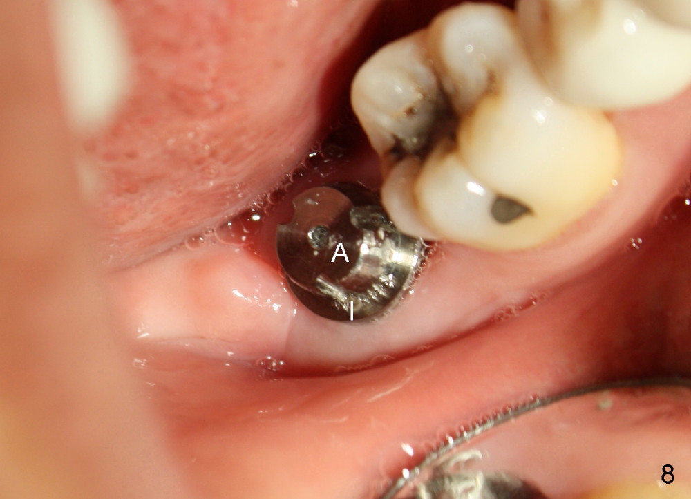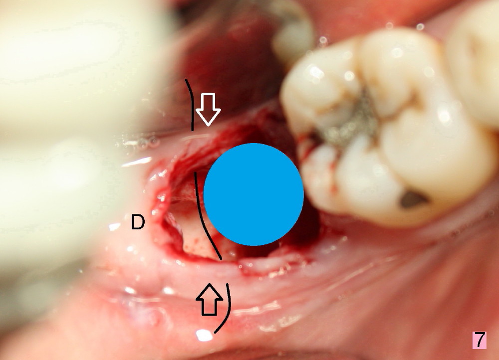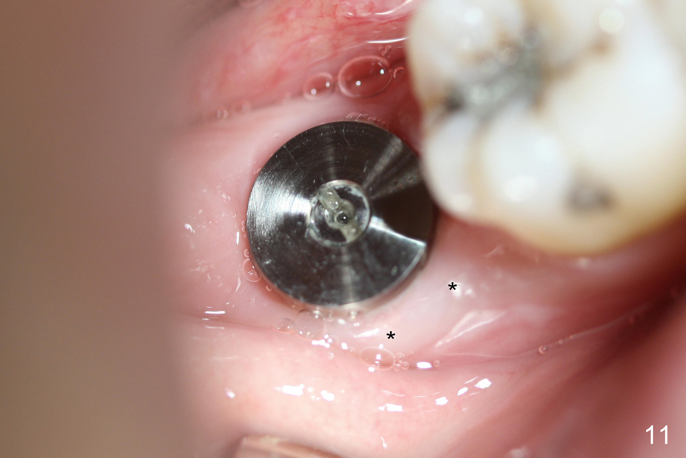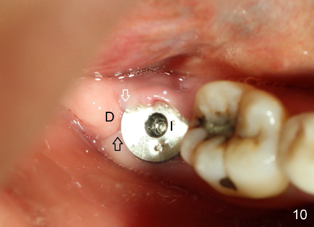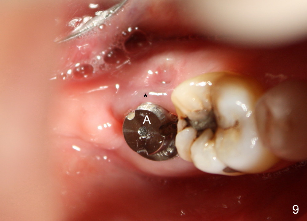 The patient returns 22 days postop (Fig.8-10). The gingiva heals around the implant. There is excess lingual gingiva (Fig.9,10 *), which should recede gradually. Fig.7 is an illustration (from Fig.4) to show how the socket is closed.. A suture is placed (black line) to approximate buccal (black arrow) and lingual (white arrow) gingiva distal to the implant (blue circle).
