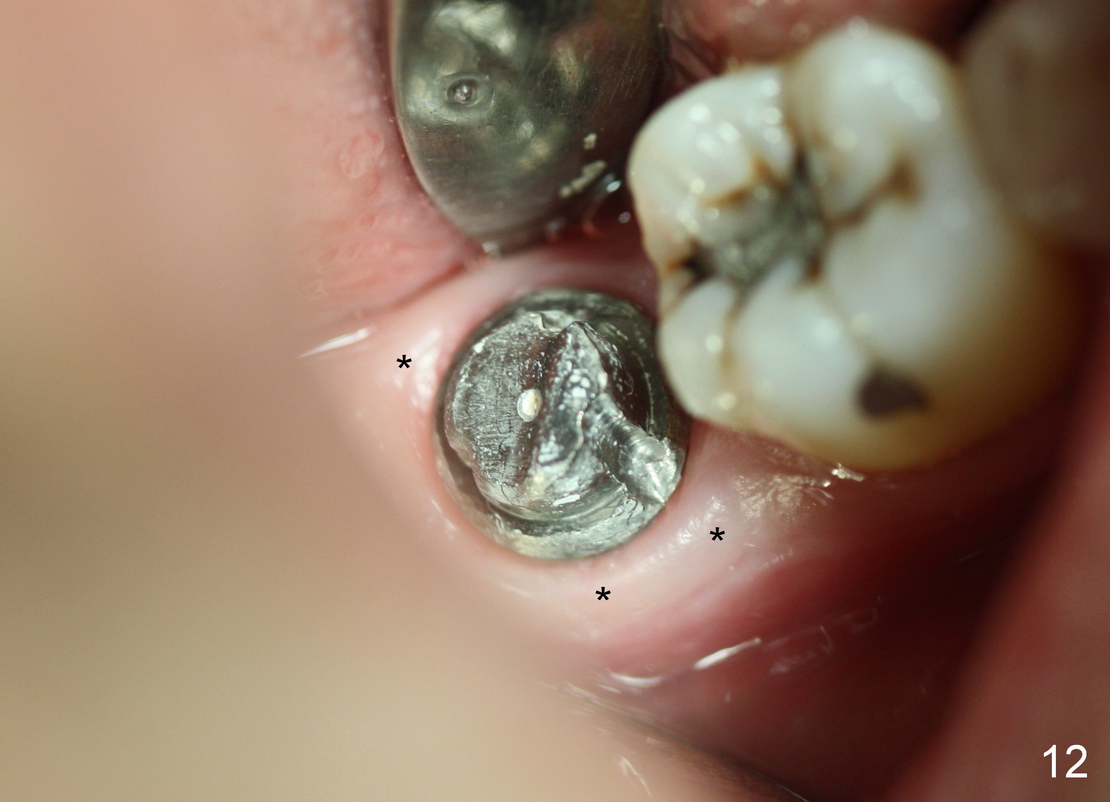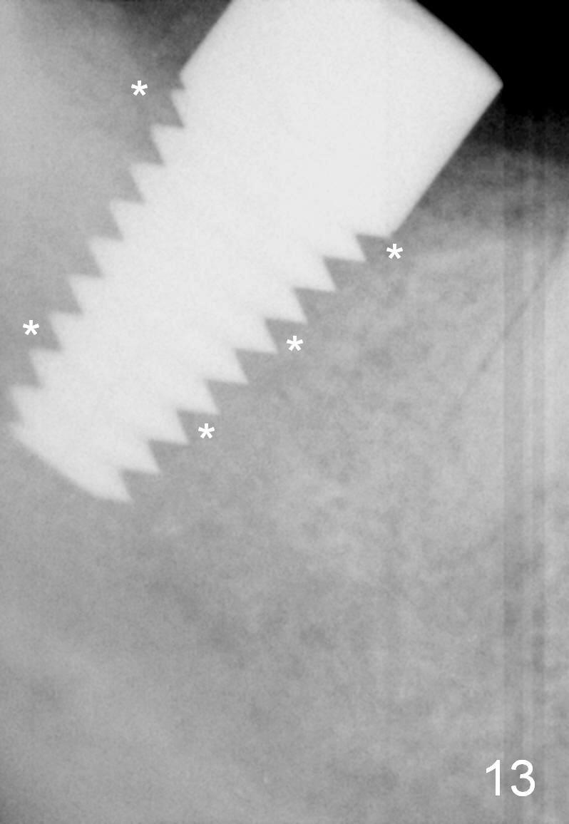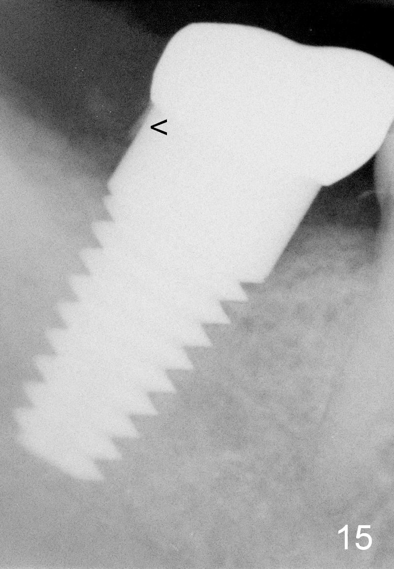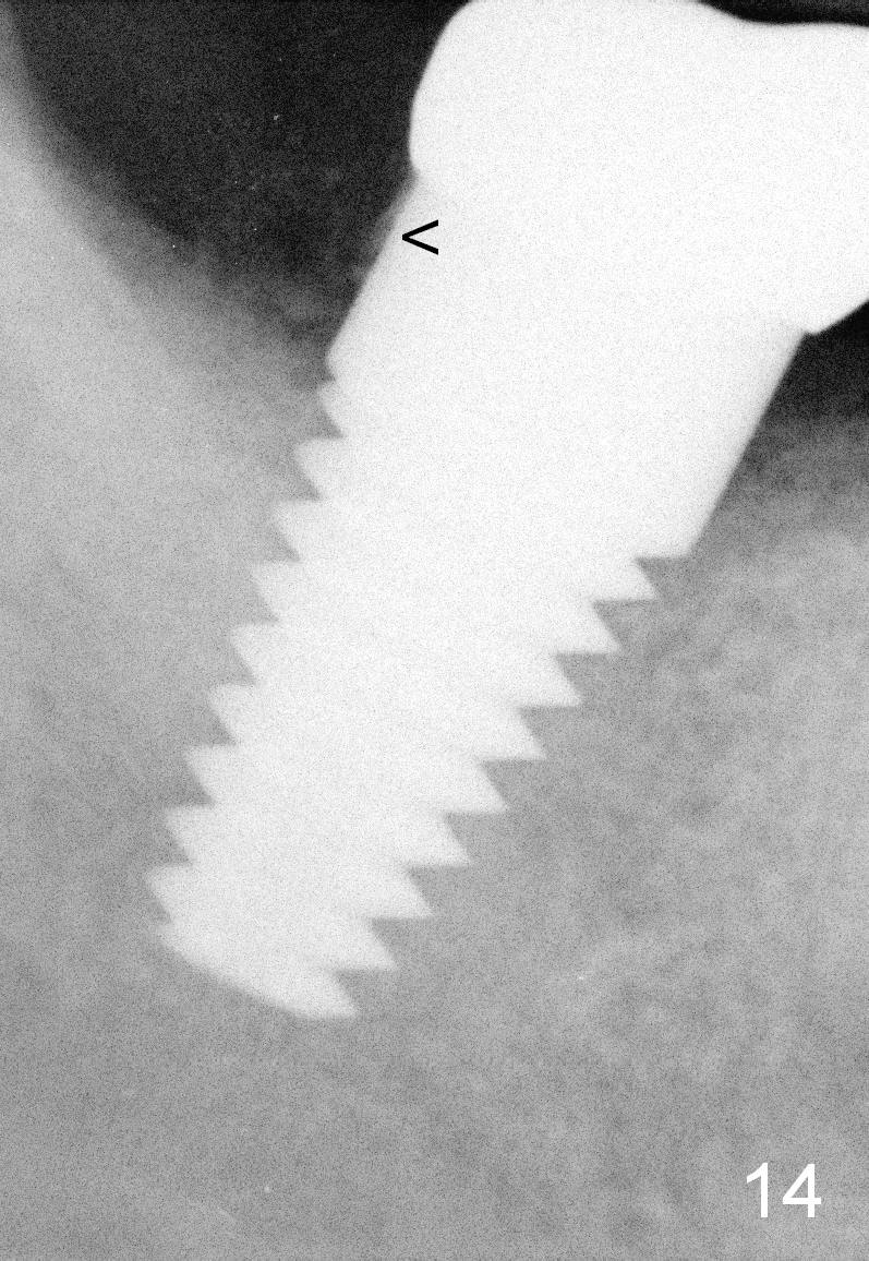 The gingiva forms a band (cuff) around the implant (Fig.11 *) and bone has apparently filled the peri-implant gap (Fig.13 *) 3.5 months postop. The gingival cuff is present immediately pre-crown cementation (Fig.12 *). The bone density around the implant continues to increase 2 and 7 months post cementation (Fig.14,15), in spite of retention of residual cement distally (<).