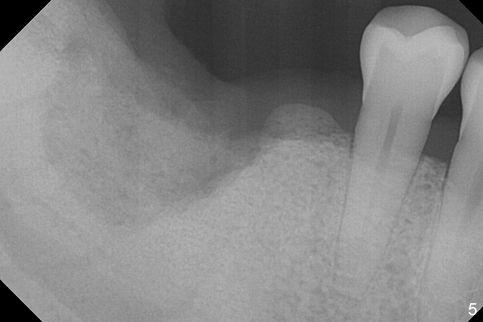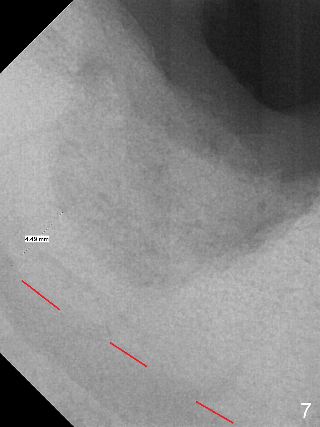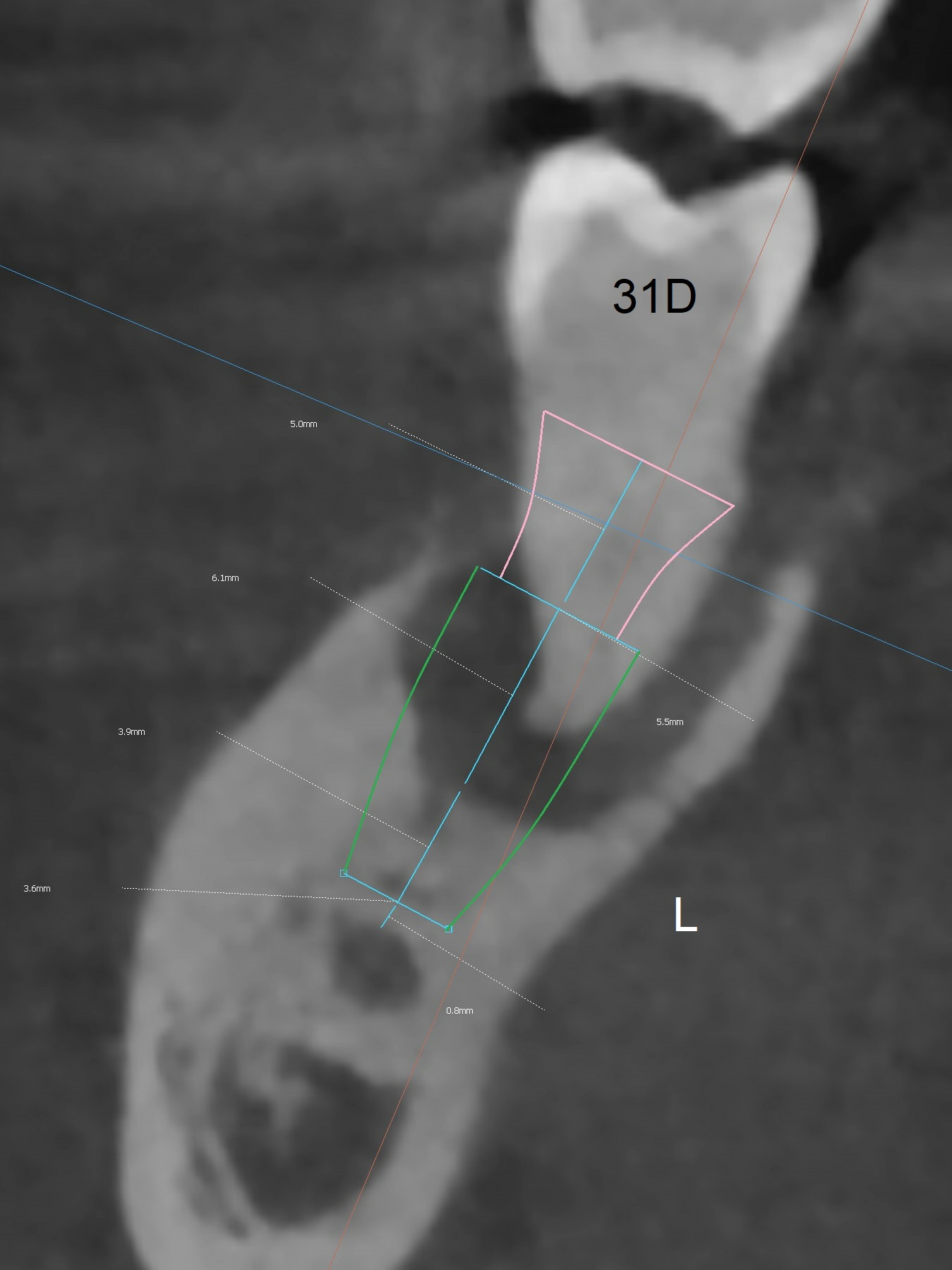 Extraction of the mobile tooth #31 (Fig.1) and debridement of the large socket are not difficult. But making osteotomy buccally does not seem to be easy. It will be difficult to restore. Instead, socket preservation is accomplished by filling the socket with approximately 1.5 cc of Mineralized Cortical/Cancellous allograft until the crest (Fig.2,5). The socket opening is closed by insertion of 4 pieces of PRF membranes (Fig.3) and 4-0 Chromic gut sutures (Fig.4). In the end of surgery, it appears that osteotomy in the center of the socket could be a better approach. Postop re-analysis of CT (Fig.6) and PA (Fig.7) shows that there is 3.9 mm of the native bone to support a 5.5x10 mm implant. Sinus Lift Master Kit should be used with 2 mm initial drill and 2.8 and 3.6 mm round drills with 4 mm stopper.
