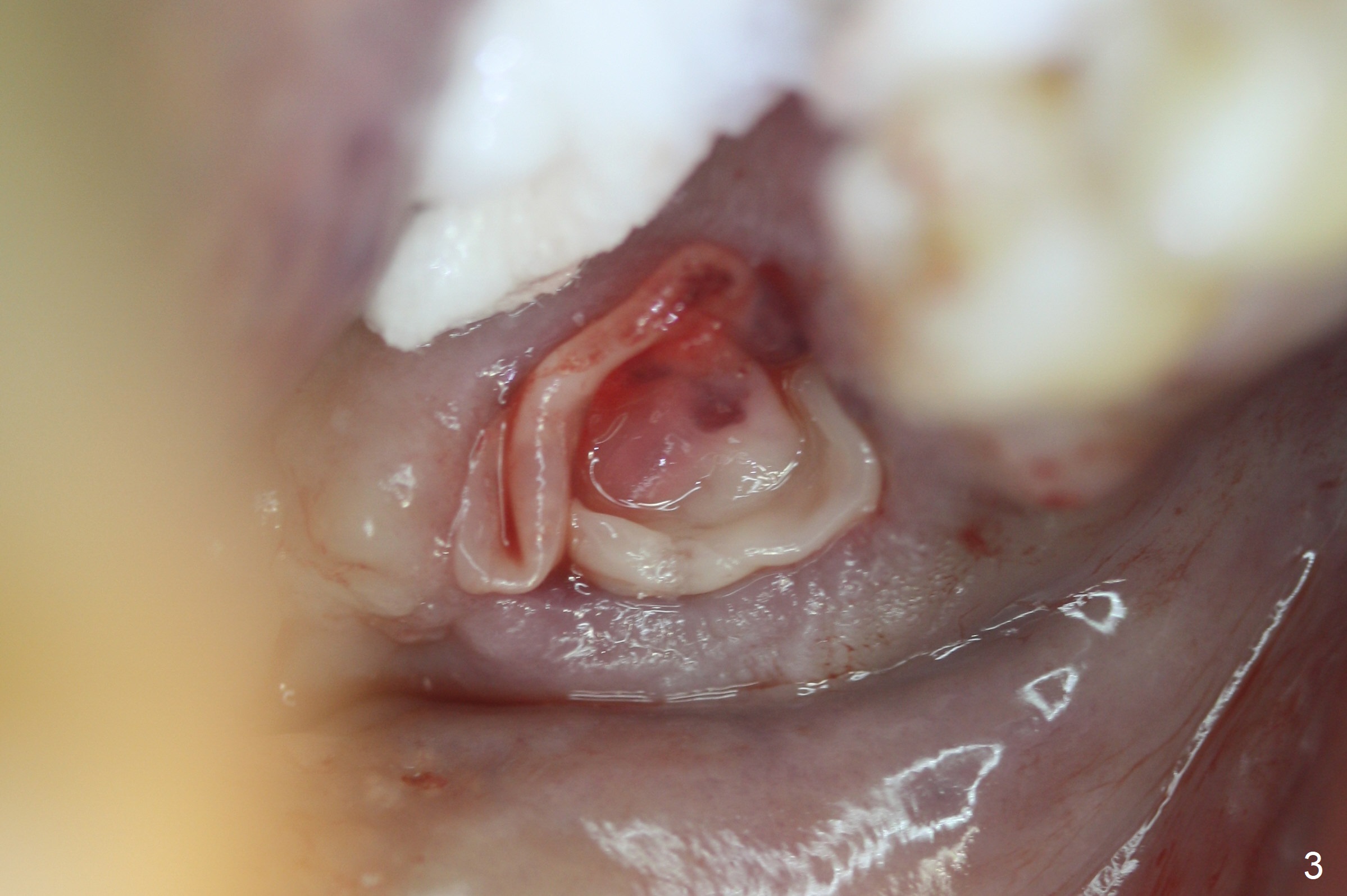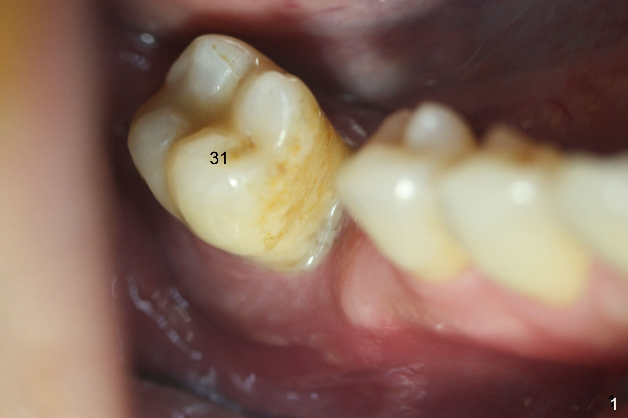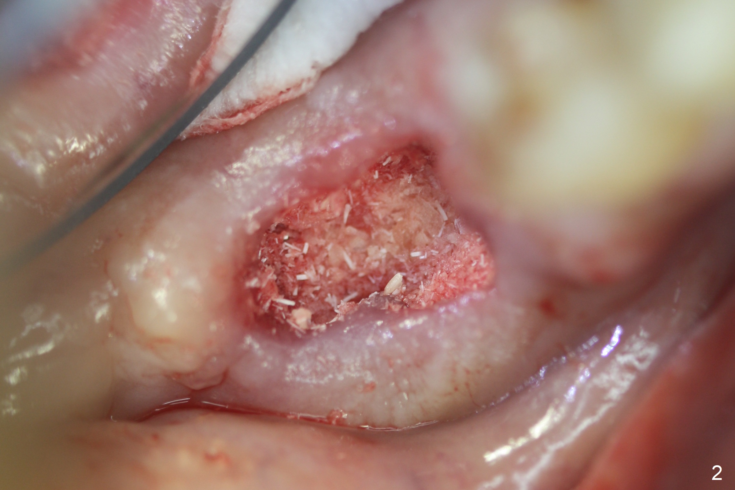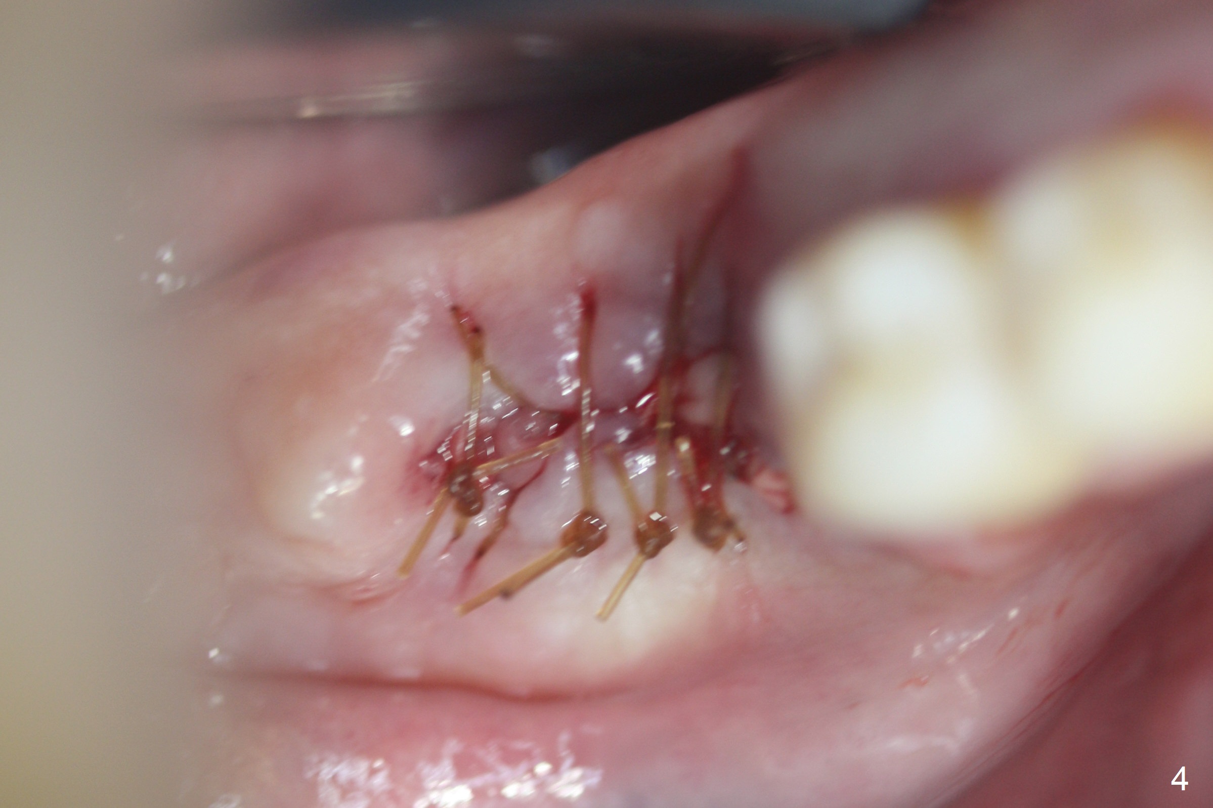 Extraction of the mobile tooth #31 (Fig.1) and debridement of the large socket are not difficult. But making osteotomy buccally does not seem to be easy. It will be difficult to restore. Instead, socket preservation is accomplished by filling the socket with approximately 1.5 cc of Mineralized Cortical/Cancellous allograft until the crest (Fig.2,5). The socket opening is closed by insertion of 4 pieces of PRF membranes (Fig.3) and 4-0 Chromic gut sutures (Fig.4). In the end of surgery, it appears that osteotomy in the center of the socket could be a better approach. Postop re-analysis of CT (Fig.6) and PA (Fig.7) shows that there is 3.9 mm of the native bone to support a 5.5x10 mm implant. Sinus Lift Master Kit should be used with 2 mm initial drill and 2.8 and 3.6 mm round drills with 4 mm stopper.
