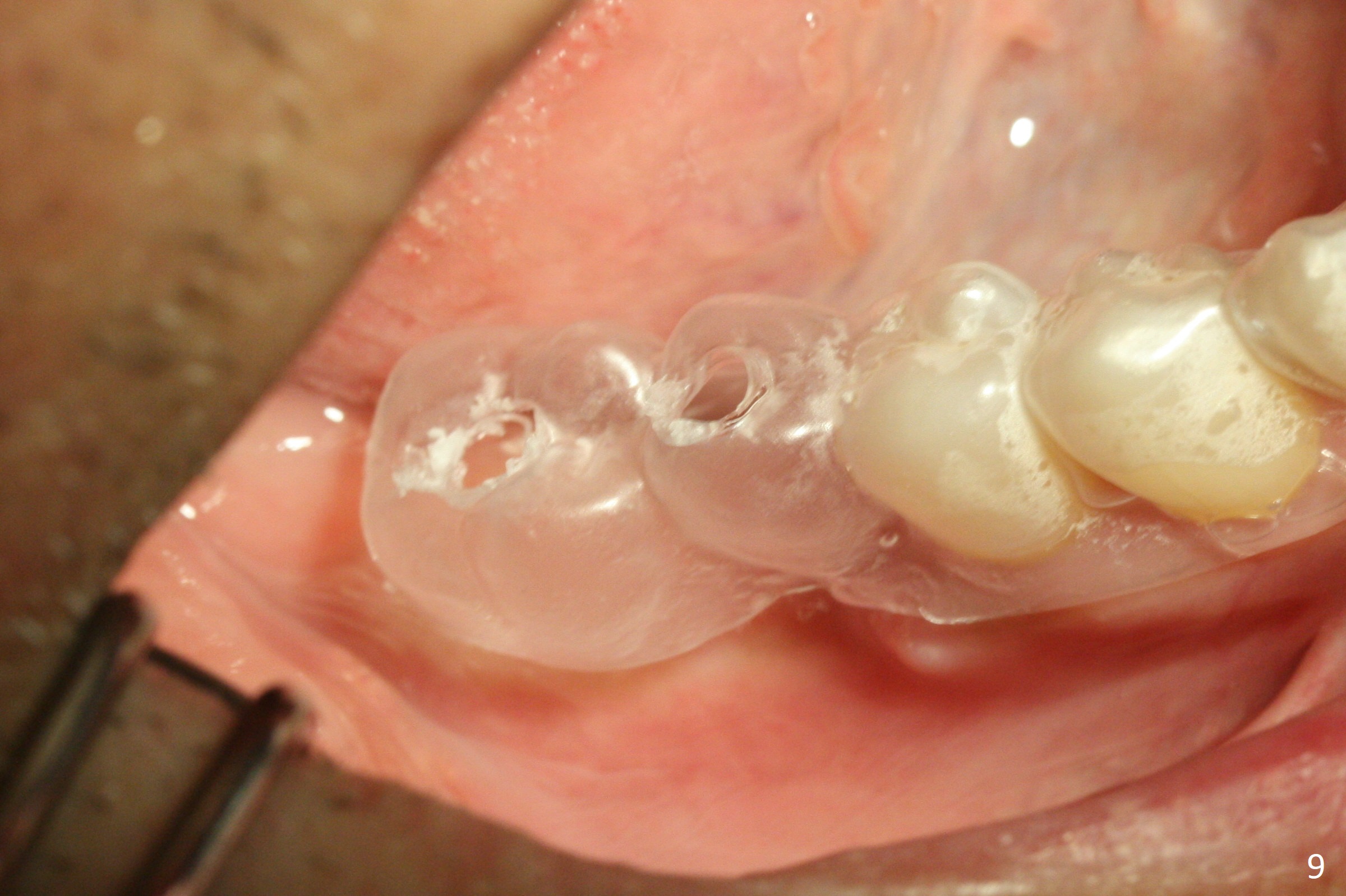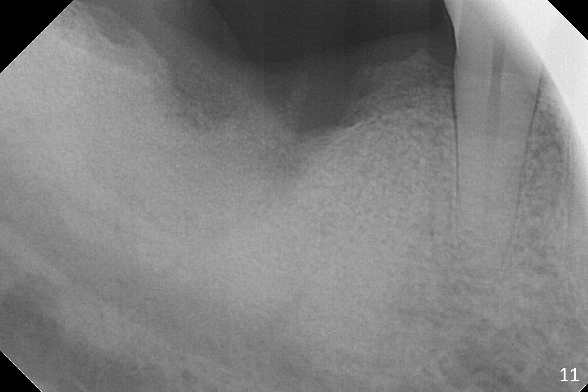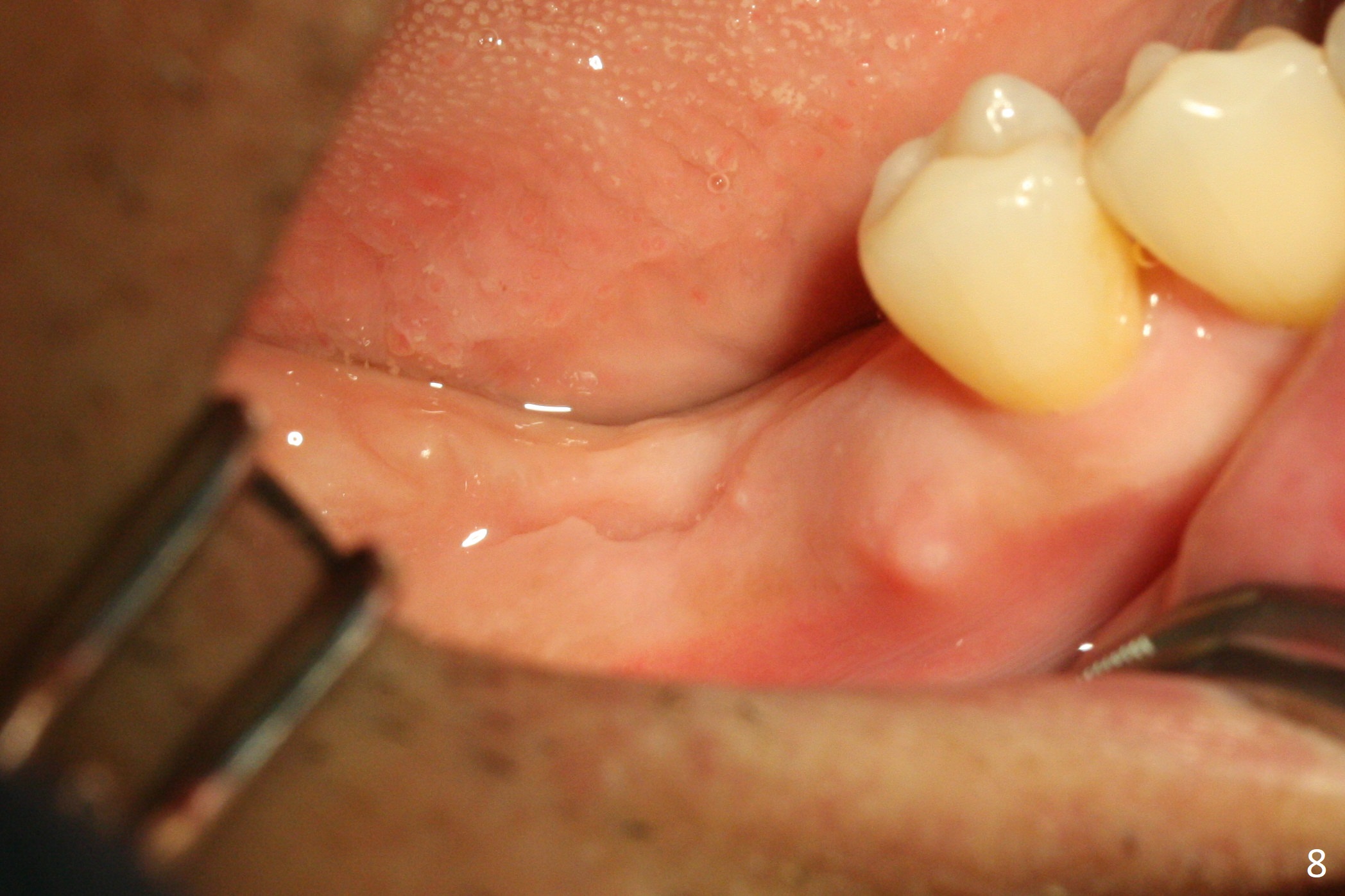 The socket heals 3 months postop (Fig.8,11). There is vertical loss of the ridge at #31 (Fig.9,10). The implant placed at #31 will be shorter than that at #30 (Fig.12). The patient will return for implant placement 4 months postop.