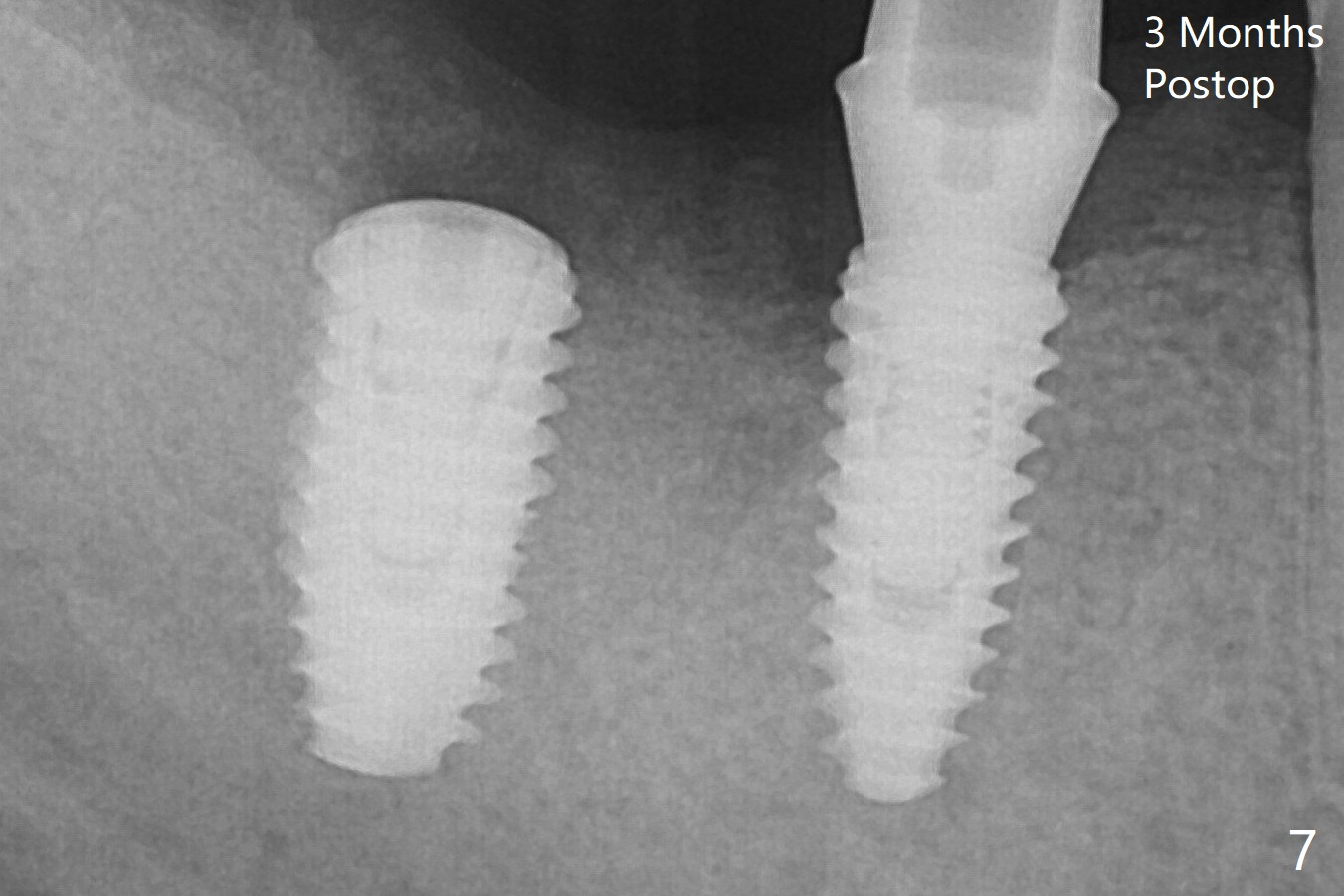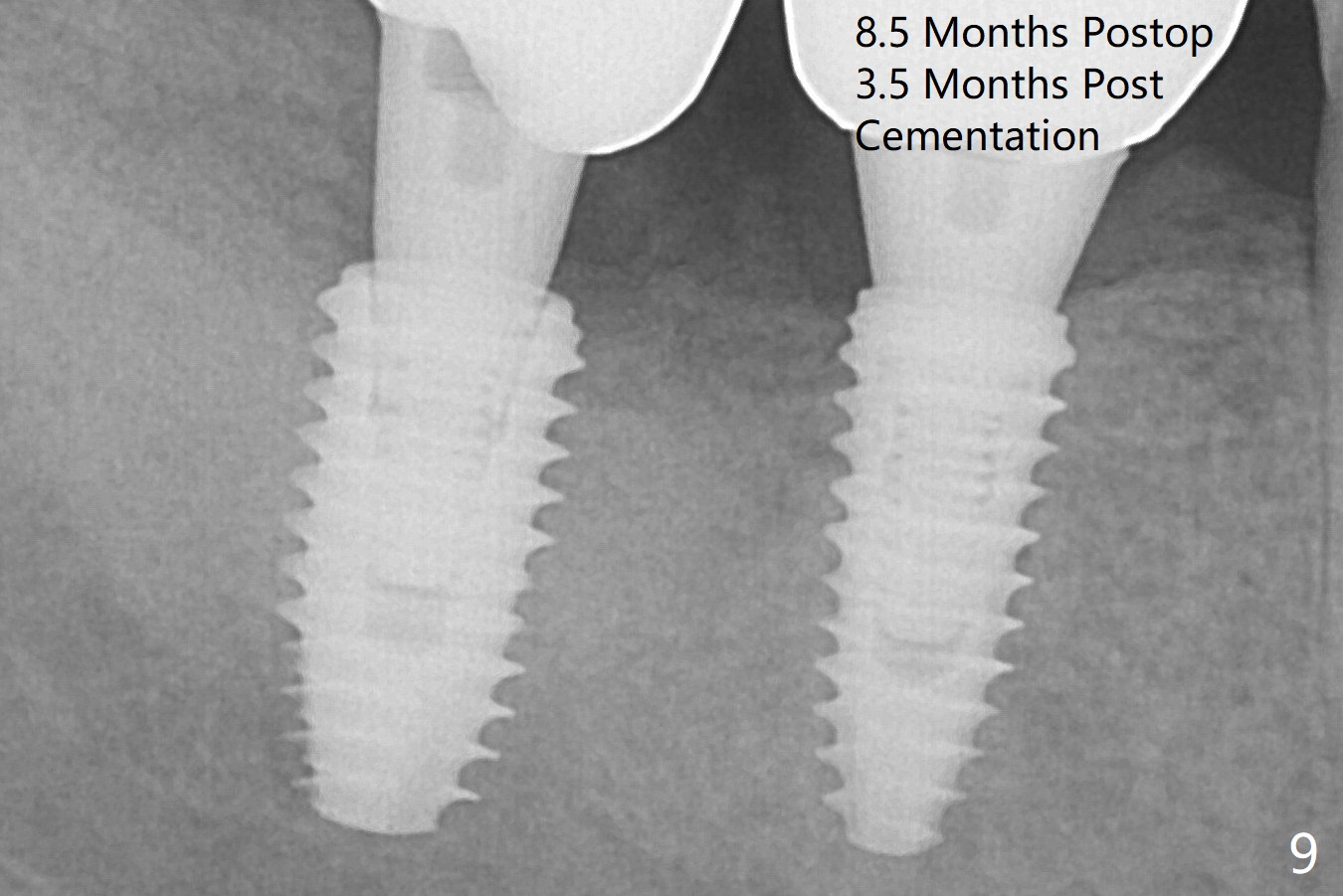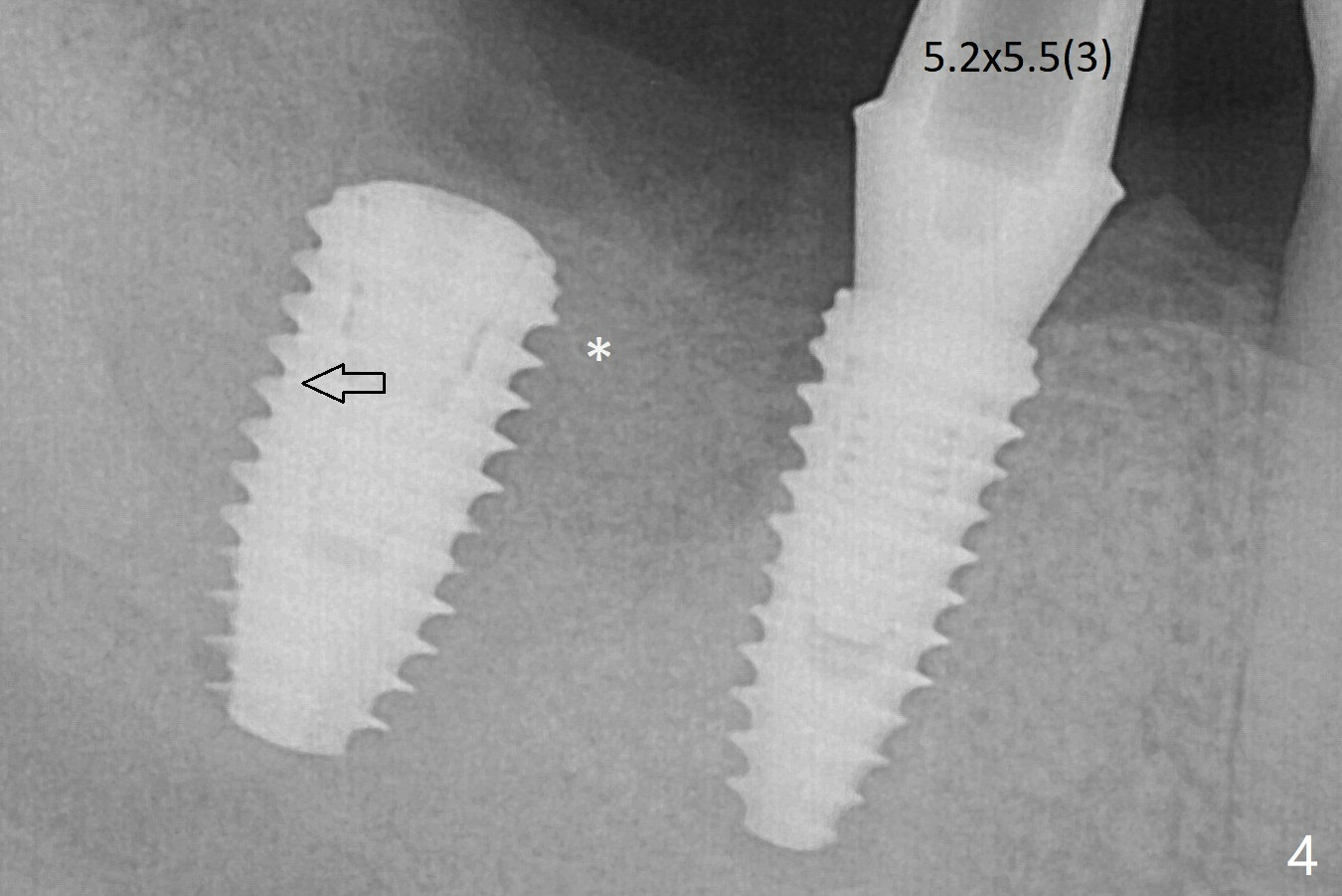 The loose implant is pushed distal (Fig.4 arrow) with placement of autogenous bone mesial (*). The stable implant at #30 (Fig.3) and its abutment (Fig.4) are used as a post to hold periodontal dressing, which covers the wound at #31 after placement of collagen plug and suturing. The bone graft seems to remain in place, while the implants remain parallel to each other 3 months postop (Fig.7). The implant is uncovered with placement of a 6.8x7 mm healing abutment 4 months postop. When a cementation abutment (4.5x5.5(4) mm) is placed, the buccal margin is much lower than the lingual. The patient enjoys mastication with the new implant crowns 3.5 months post cementation; the bone density around the implant at #31 increases (Fig.9).