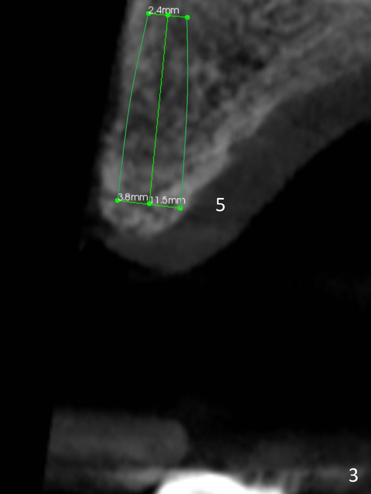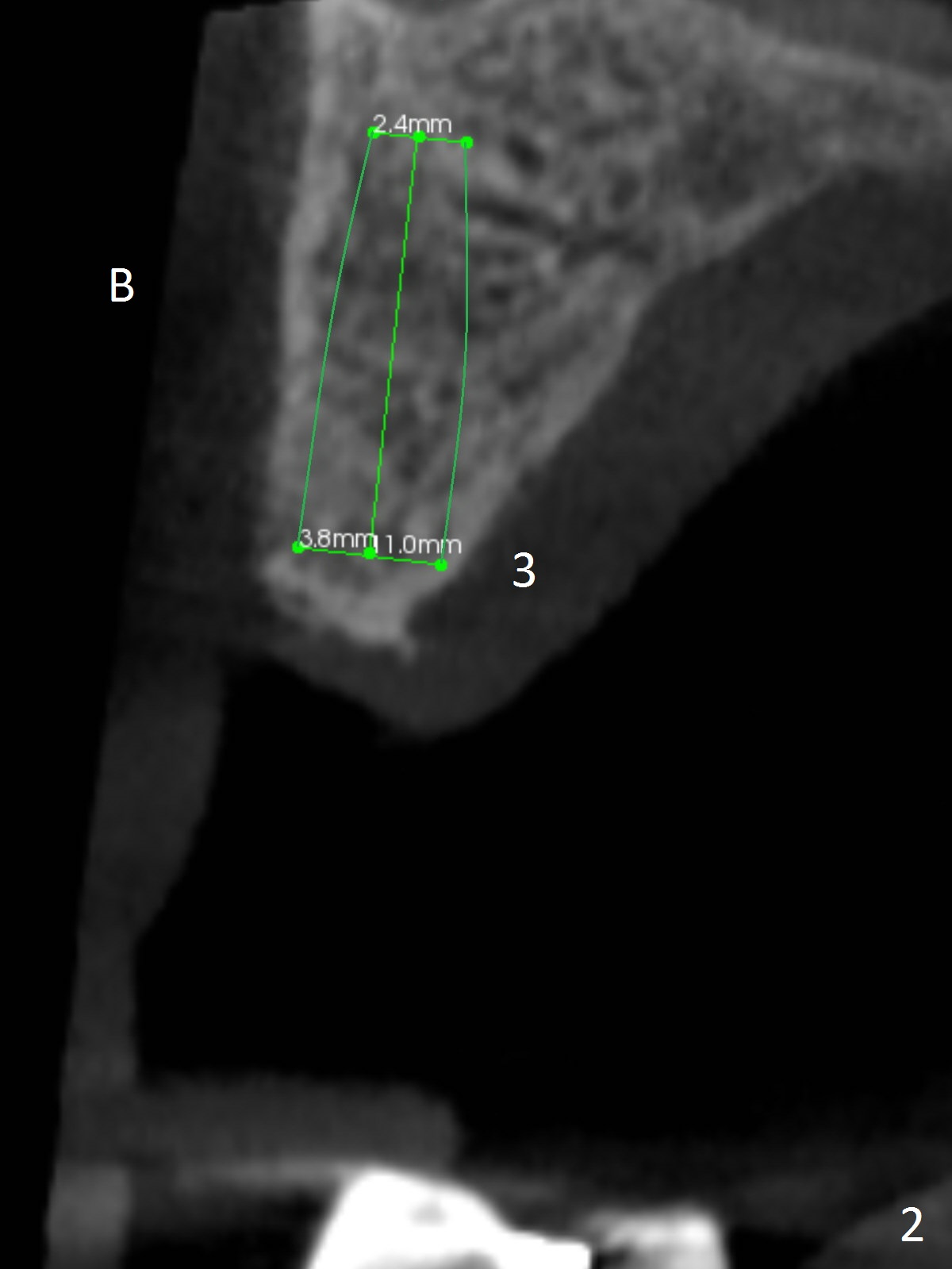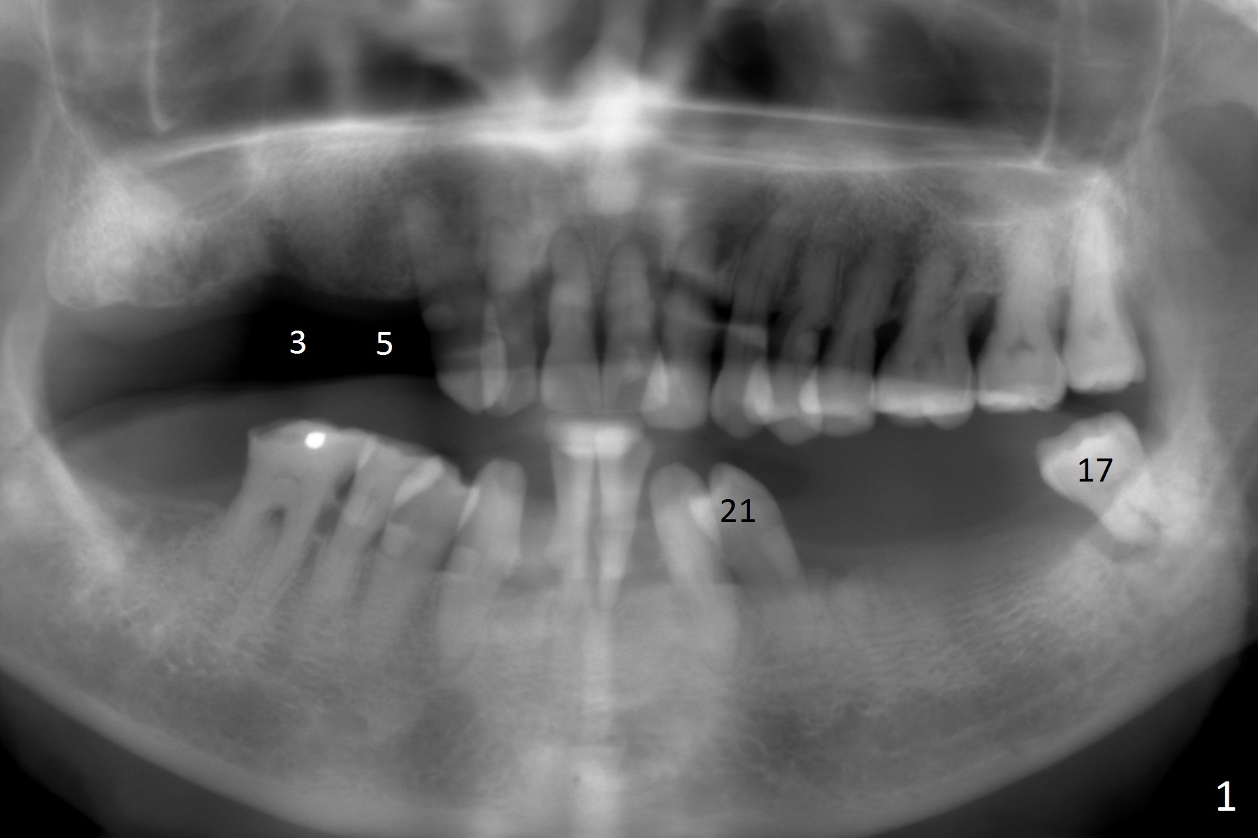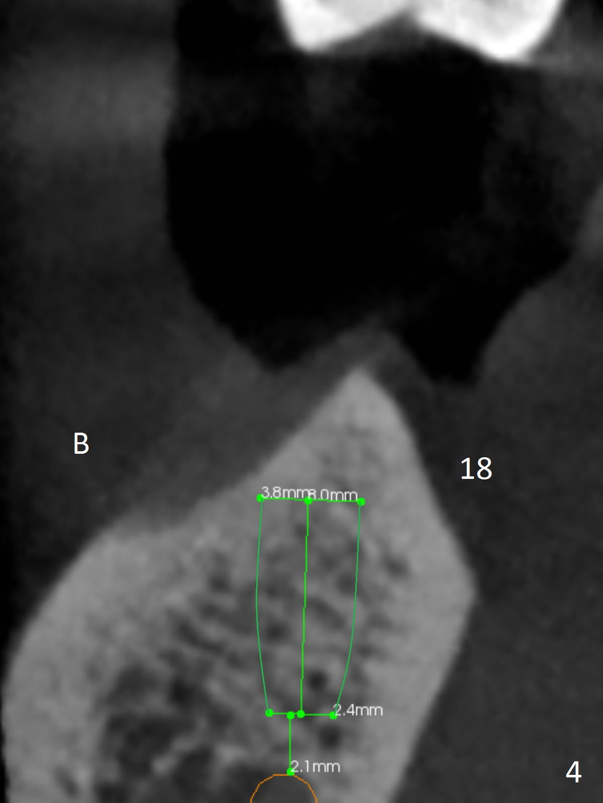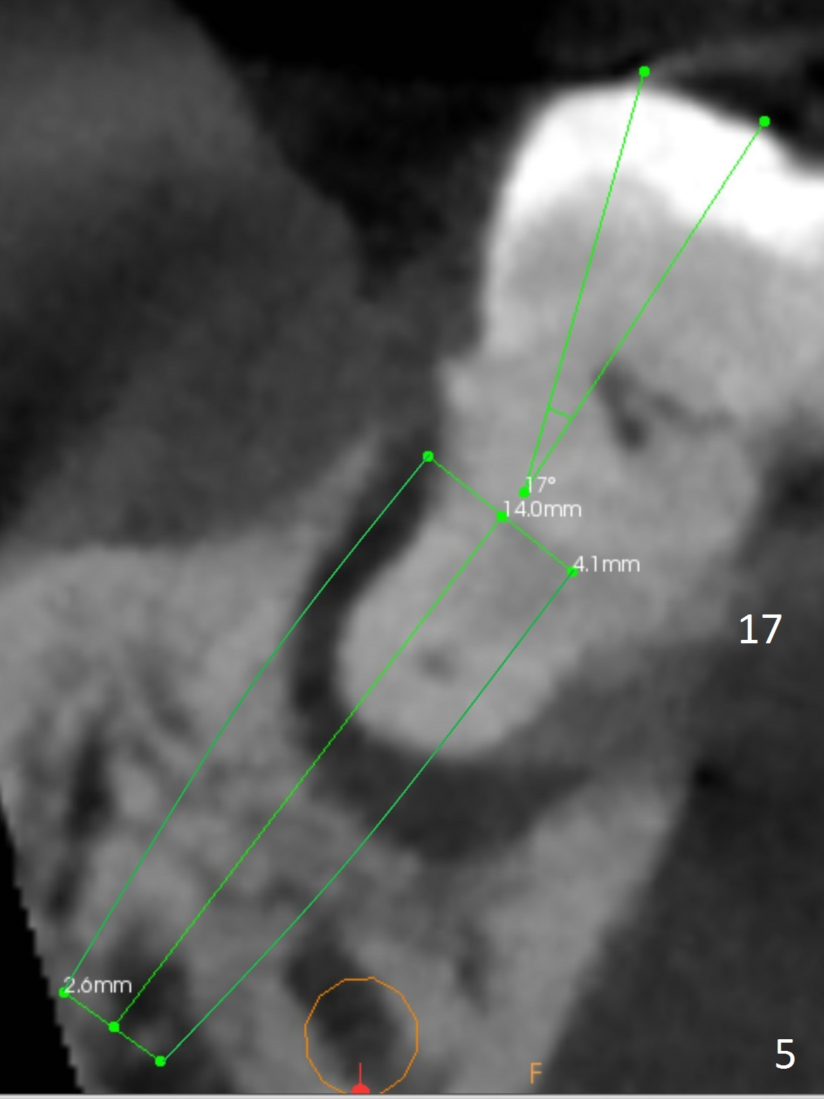 A 83-year-old woman requests lower RPD to replace #18-20 and 23-26 (Fig.1), although UR FPD supported by implants at #3 and 5 (Fig.2,3) is a better option. For the RPD, an implant will be placed at #18 (Fig.4) or 17 (Fig.5) with ball abutment. At #18, a shorter implant will be placed at the top of the Inferior Alveolar Canal (brown), while at #17, a longer implant will be placed buccal (B) to the canal.