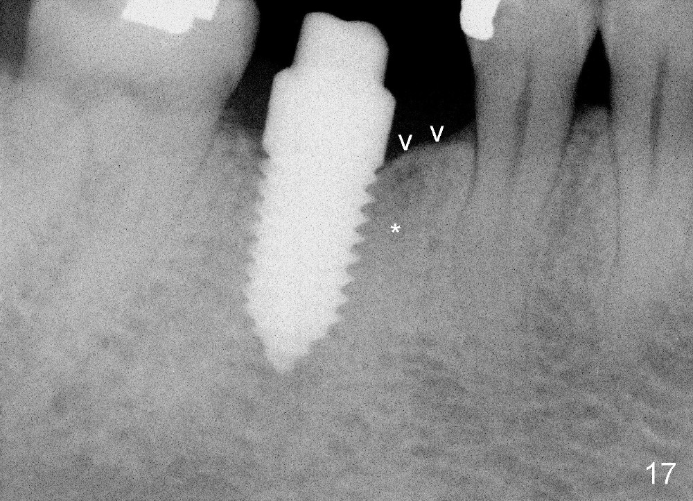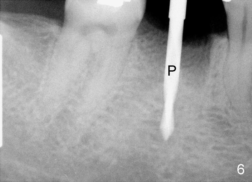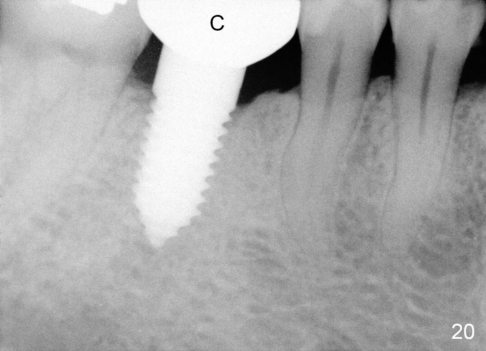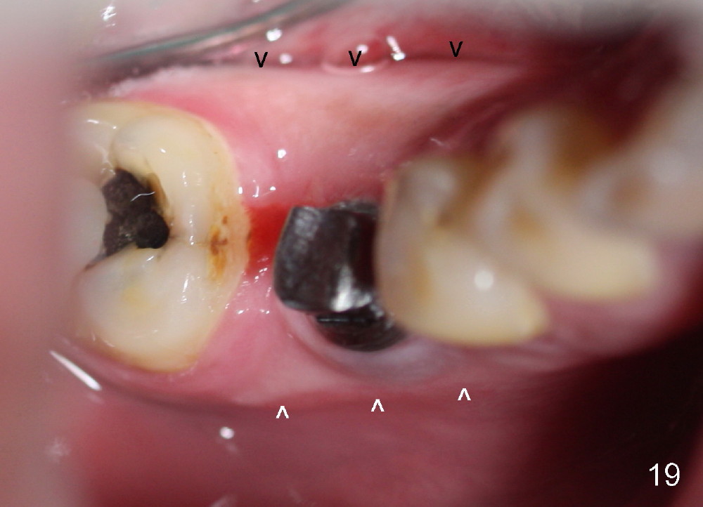 A 38-year-old lady agrees to have implant placement 7 years after loss of the crown of the lower right first molar (Fig.1,2). When the tooth is extracted, the septum is found to be low (Fig.3,4). To confirm it, a PA is taken (Fig.5). To initiate an osteotomy in the septum, it is trans-sectioned with thin osteotomes as shown in Fig.4 insert (black line). A 2 mm pilot drill is placed in the septum (Fig.6: P). The osteotomy is enlarged by 2.5-4.0 mm reamers (Fig.7,8), followed by insertion of 6x17 mm tapered tap at the depth 14 mm (Fig.9). The osteotomy is further enlarged by 4.5 and 5.0 mm reamers. A 6.0x14 mm one piece implant is placed initially. The trajectory is not ideal. A 6.0x14 mm one piece implant is placed initially. The trajectory is not ideal. The implant is removed from the osteotomy partially and reinserted with improved trajectory (Fig.11, compare to Fig.10 (red line)). Primary stability is high. There is not much bone mesiodistally so that the trajectory is easily changed in that direction. After abutment preparation, mixture of autogenous bone (harvested from reamers) and allograft is placed in the residual mesial and distal sockets (Fig.12). To contain the bone graft, an immediate provisional is placed (Fig.13 P). The occlusal plane of the provisional is significantly lower than that of the adjacent teeth to avoid micromovement of the implant. The patient is advised to eat soft food on the left side. Six days postop, the patient returns for prophy. The provisional is removed; the bone graft appears to be incorporating into the socket (Fig.14). After recementation, the provisional remains in place for 3.5 months; PA shows increased bone density in the mesial and distal sockets (Fig.15, compare to Fig.5,11). Due to insurance coverage, the patient defers fabrication of definitive restoration for at least 7 months. The immediate provisional is finally lost 8.5 months postop: the gingiva attaches to the 1-piece implant (Fig.16), while the density of the mesial socket increases (Fig.17 *) with formation of the cortex (lamina dura) coronally (v). Before the provisional (Fig.18 P) is removed for cementation of the definitive restoration, black shadow (*) is noted over the buccal gingiva. It is partially due to buccal placement (Fig.19) and partially due to buccal atrophy over a period of 10.5 months postop. How to prevent buccal placement? Positioning the first pilot drill in the septum buccolingually is a key. Eleven months post crown (Fig.20 C) cementation, the black shadow remains, but there is no tenderness. If the implant threads are immediately underneath the periosteum, there is tenderness.