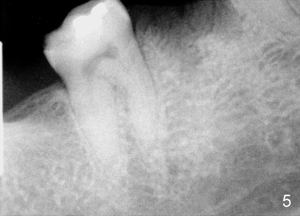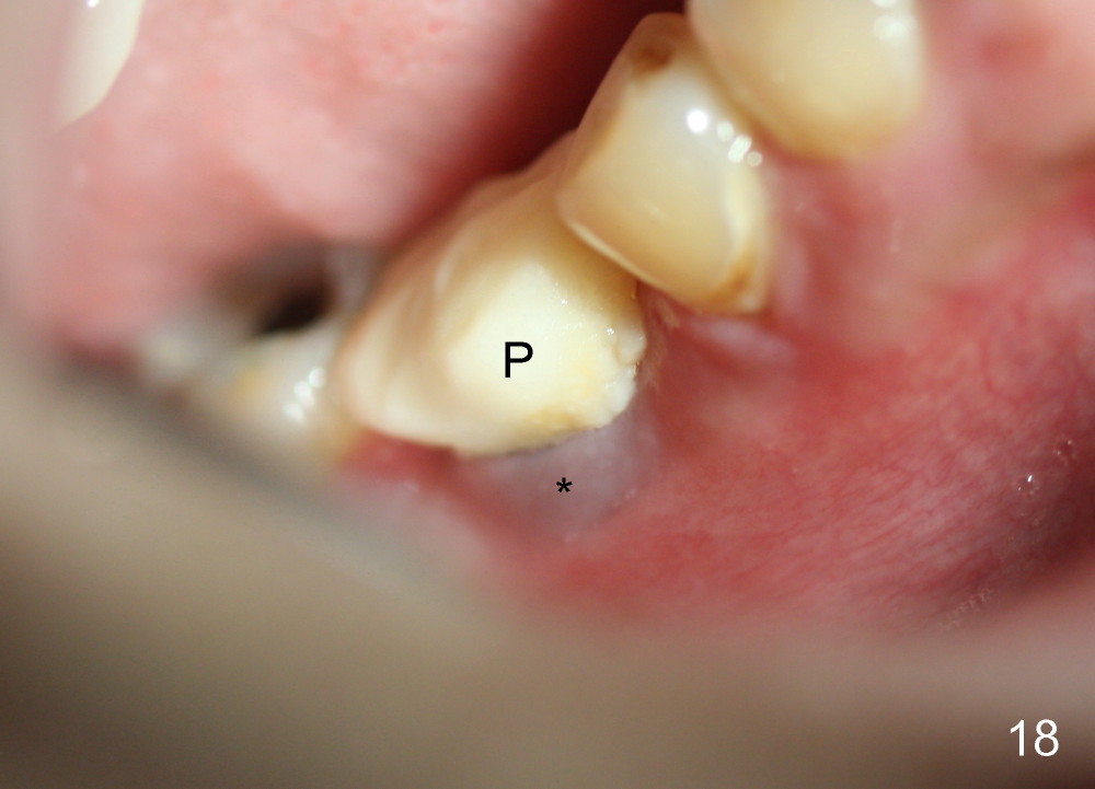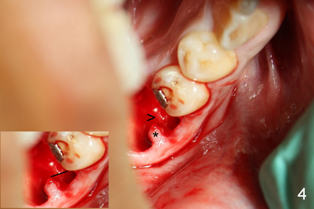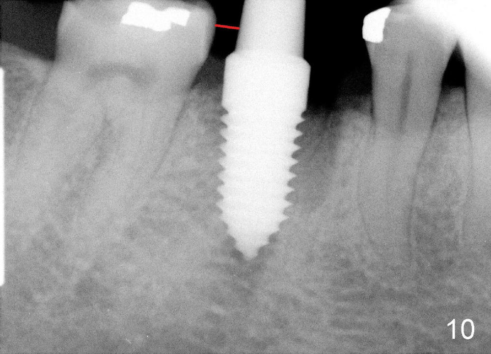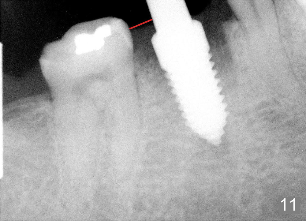A 38-year-old lady agrees to have implant placement 7 years after loss of the crown of the lower right first molar (Fig.1,2). When the tooth is extracted, the septum is found to be low (Fig.3,4). To confirm it, a PA is taken (Fig.5). To initiate an osteotomy in the septum, it is trans-sectioned with thin osteotomes as shown in Fig.4 insert (black line). A 2 mm pilot drill is placed in the septum (Fig.6: P). The osteotomy is enlarged by 2.5-4.0 mm reamers (Fig.7,8), followed by insertion of 6x17 mm tapered tap at the depth 14 mm (Fig.9). The osteotomy is further enlarged by 4.5 and 5.0 mm reamers. A 6.0x14 mm one piece implant is placed initially. The trajectory is not ideal. A 6.0x14 mm one piece implant is placed initially. The trajectory is not ideal. The implant is removed from the osteotomy partially and reinserted with improved trajectory (Fig.11, compare to Fig.10 (red line)). Primary stability is high. There is not much bone mesiodistally so that the trajectory is easily changed in that direction. After abutment preparation, mixture of autogenous bone (harvested from reamers) and allograft is placed in the residual mesial and distal sockets (Fig.12). To contain the bone graft, an immediate provisional is placed (Fig.13 P). The occlusal plane of the provisional is significantly lower than that of the adjacent teeth to avoid micromovement of the implant. The patient is advised to eat soft food on the left side. Six days postop, the patient returns for prophy. The provisional is removed; the bone graft appears to be incorporating into the socket (Fig.14). After recementation, the provisional remains in place for 3.5 months; PA shows increased bone density in the mesial and distal sockets (Fig.15, compare to Fig.5,11). Due to insurance coverage, the patient defers fabrication of definitive restoration for at least 7 months. The immediate provisional is finally lost 8.5 months postop: the gingiva attaches to the 1-piece implant (Fig.16), while the density of the mesial socket increases (Fig.17 *) with formation of the cortex (lamina dura) coronally (v). Before the provisional (Fig.18 P) is removed for cementation of the definitive restoration, black shadow (*) is noted over the buccal gingiva. It is partially due to buccal placement (Fig.19) and partially due to buccal atrophy over a period of 10.5 months postop. How to prevent buccal placement? Positioning the first pilot drill in the septum buccolingually is a key. Eleven months post crown (Fig.20 C) cementation, the black shadow remains, but there is no tenderness. If the implant threads are immediately underneath the periosteum, there is tenderness.