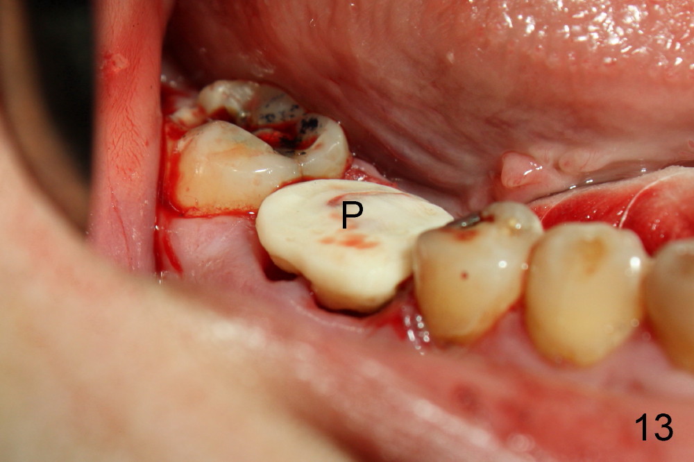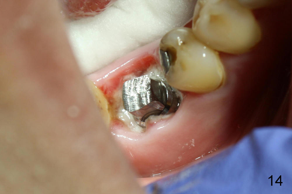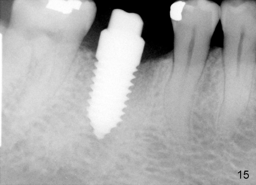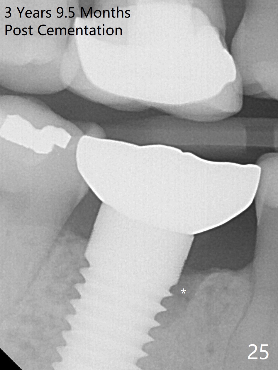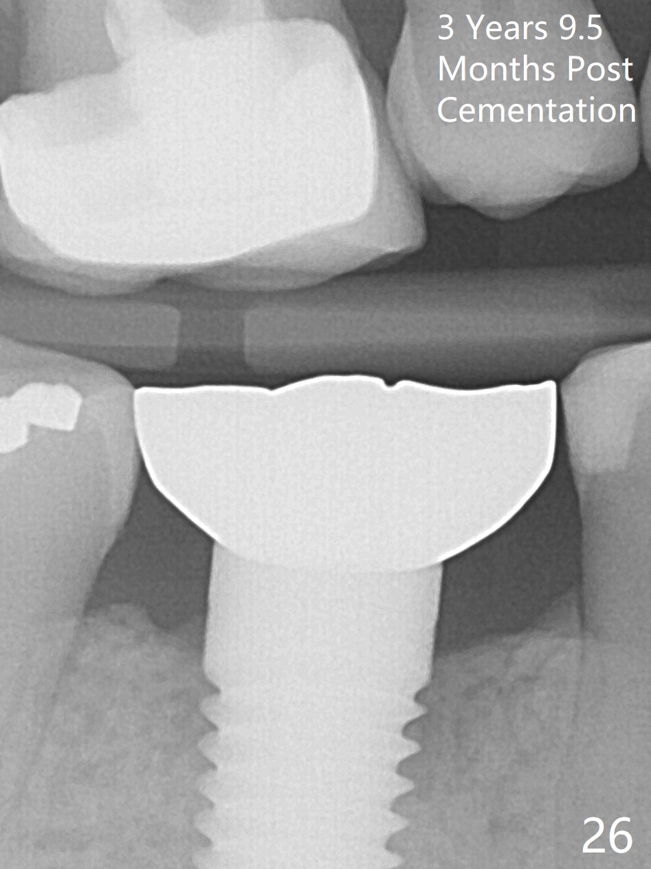 The patient will return for immediate implant at #14. Do not forget placing an implant as palatal as possible. There is no sign of infection at #30 three years 9.5 months post cementation because of water pik for #3 endo failure (Fig.25,26).