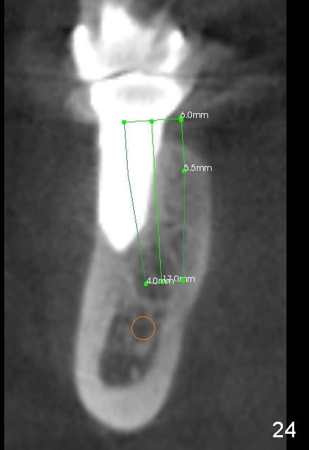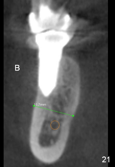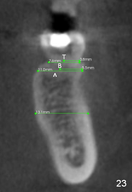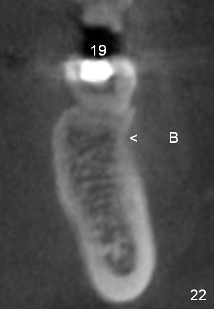 CBCT taken 15 months post cementation shows that the implant is buccally placed (Fig.21 B), associated with possible postop buccal plate resorption (as compared to Fig.23 (coronal section of the site of #19). The buccal plate is not only thinner than the lingual one, but also concave (Fig.22 <). The tooth center (i.e., septum; Fig.23 T) is more buccally located than the center of the basal bone (B). Considering the denser bone lingually, the initial osteotomy should be more lingually (^). If the implant develops infection, it will be replaced by a more lingually placed implant (Fig.24 green).
